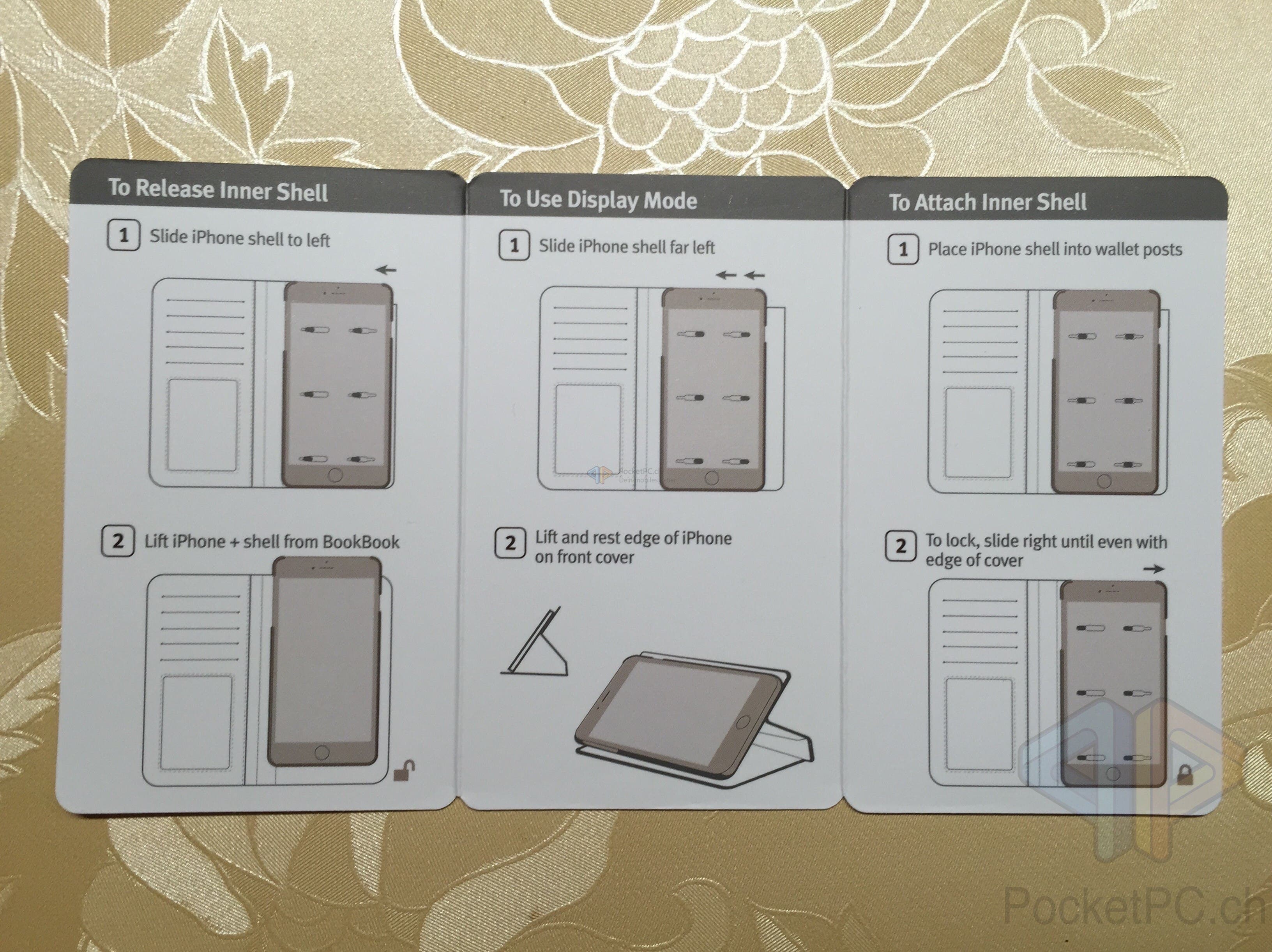 Die Handhabung des BookBook ist simpel. Man klickt einfach das iPhone in das Plastikcase, fertig. Auch das Abnehmen aus der Lederumhüllung geht ganz einfach: Man schiebt das Plastikcase einfach ein wenig nach links und schon kann man von den Haken ablösen. Will man das iPhone aufstellen, schiebt man das Case einfach noch ein Stück weiter. Jetzt kann man es aus den linken Haken lösen und es wird nur noch von den rechten gehalten. Das Aufstellen geht dann wie bei anderen Cases auch. Dies wird im folgenden Video gezeigt.