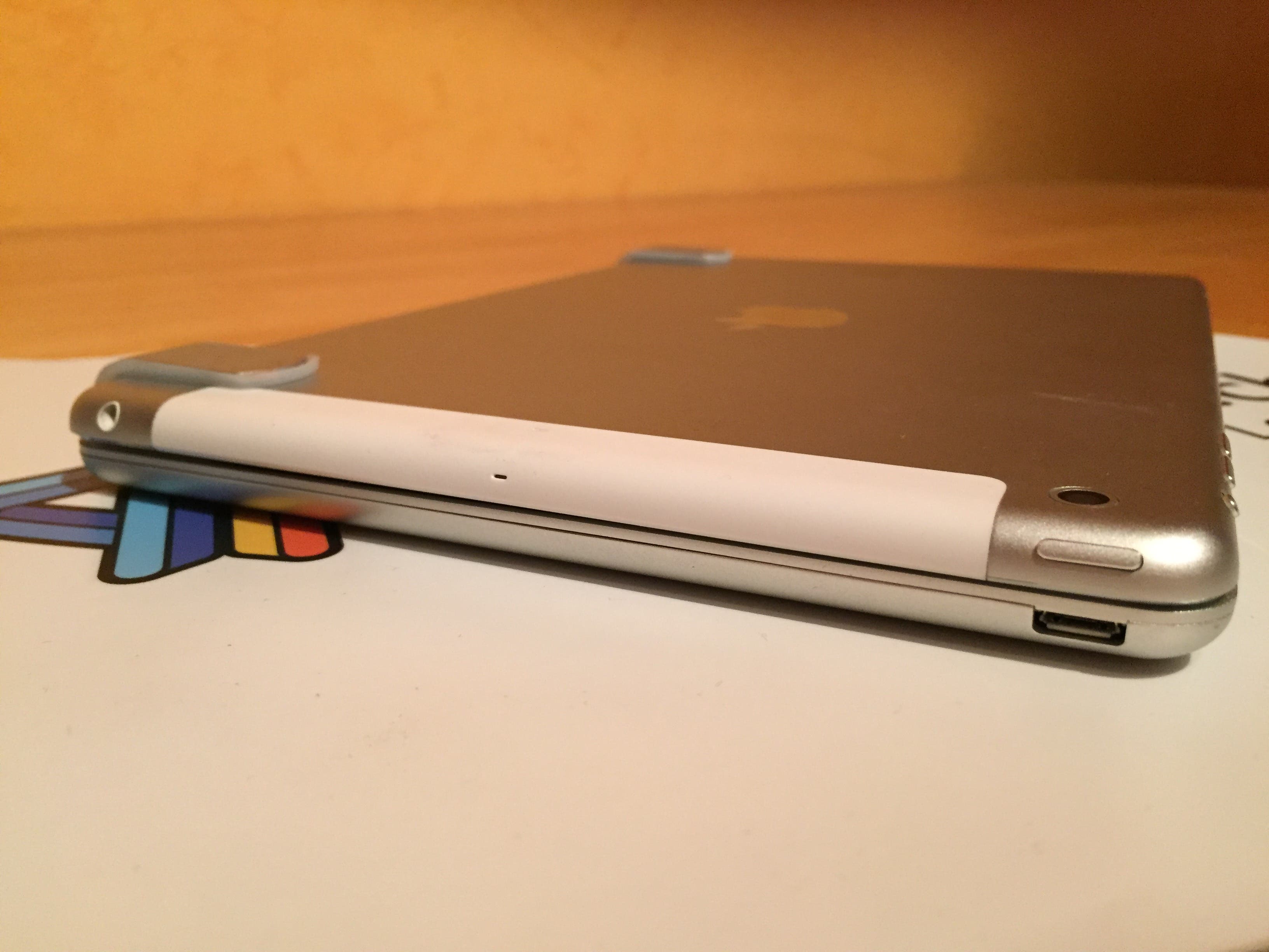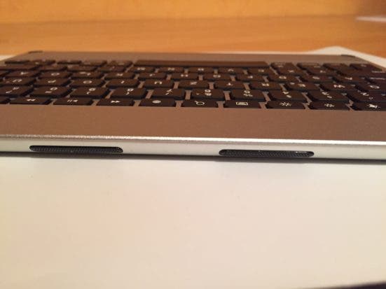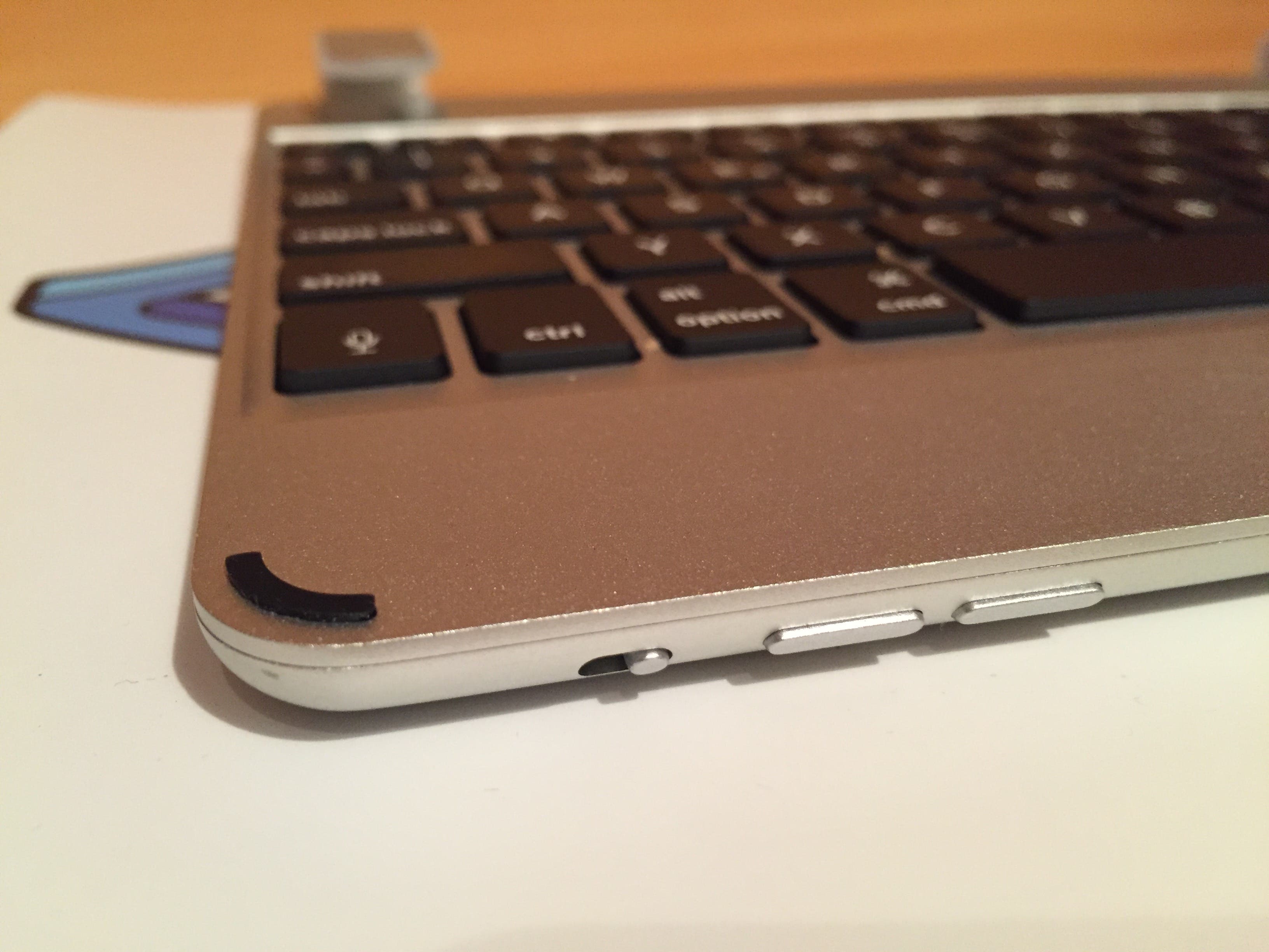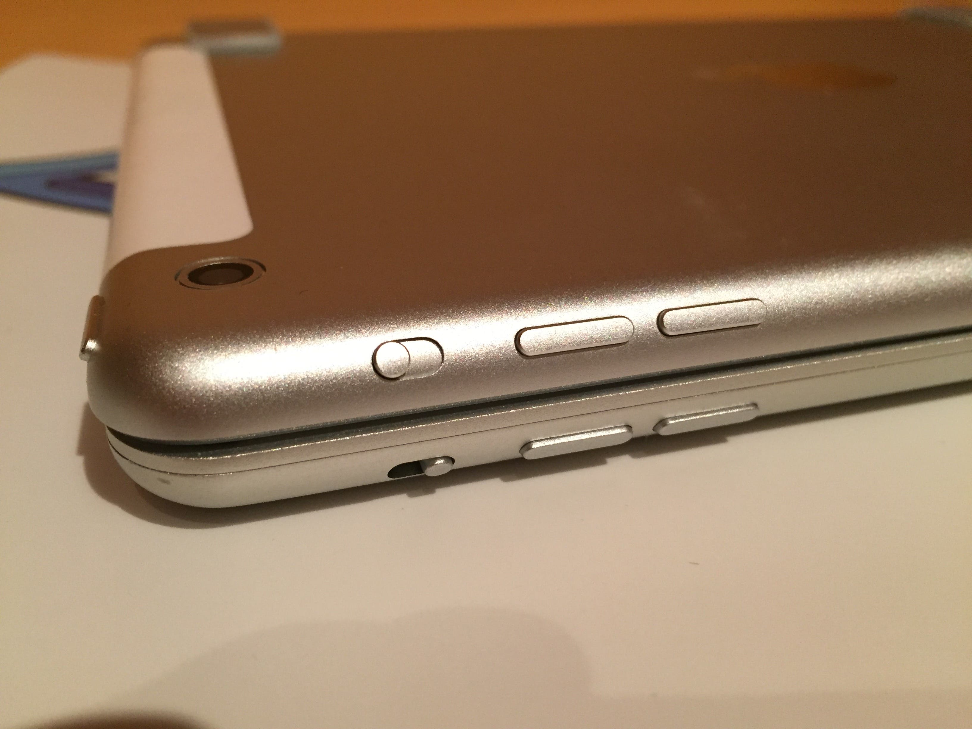 Am Gehäuse selbst findet man den Micro-USB-Anschluss zum Aufladen, den Schieber zum Ein- und Ausschalten der Tastatur (Dieser erinnert sehr an den Mute-Button des iPads) und zwei separate Tasten zum Koppeln der Tastatur und der Lautsprecher, ebenfalls im Look der Lautstärketasten des iPads. Nach dem Aufklappen benötigt man einen Tastendruck auf der Tastatur, damit sich das Keyboard wieder mit dem iPad koppelt. Der integrierte Akku bietet eine Laufzeit von bis zu drei Monaten. Das ist ein guter Wert für eine solche Tastatur.