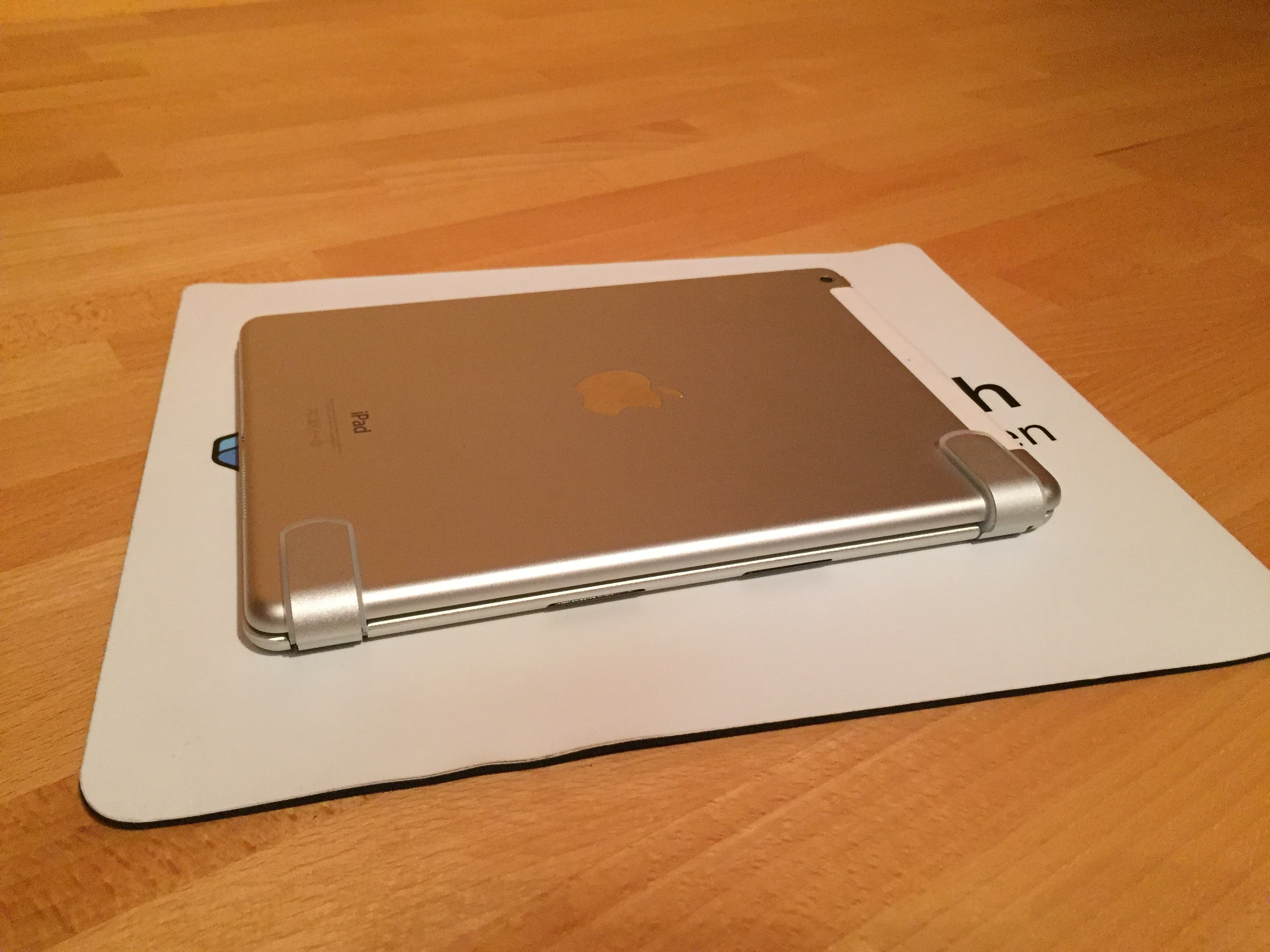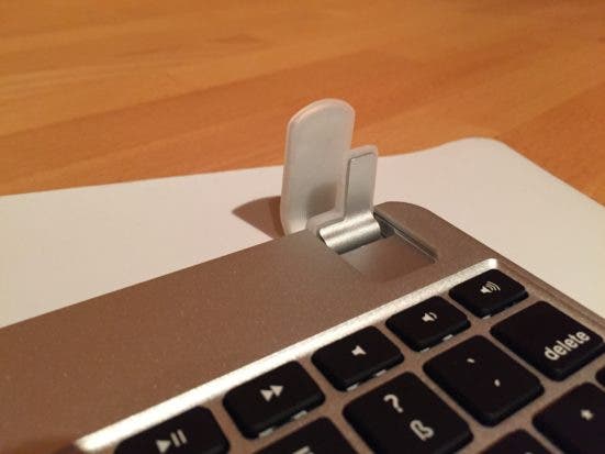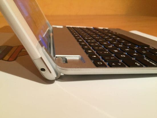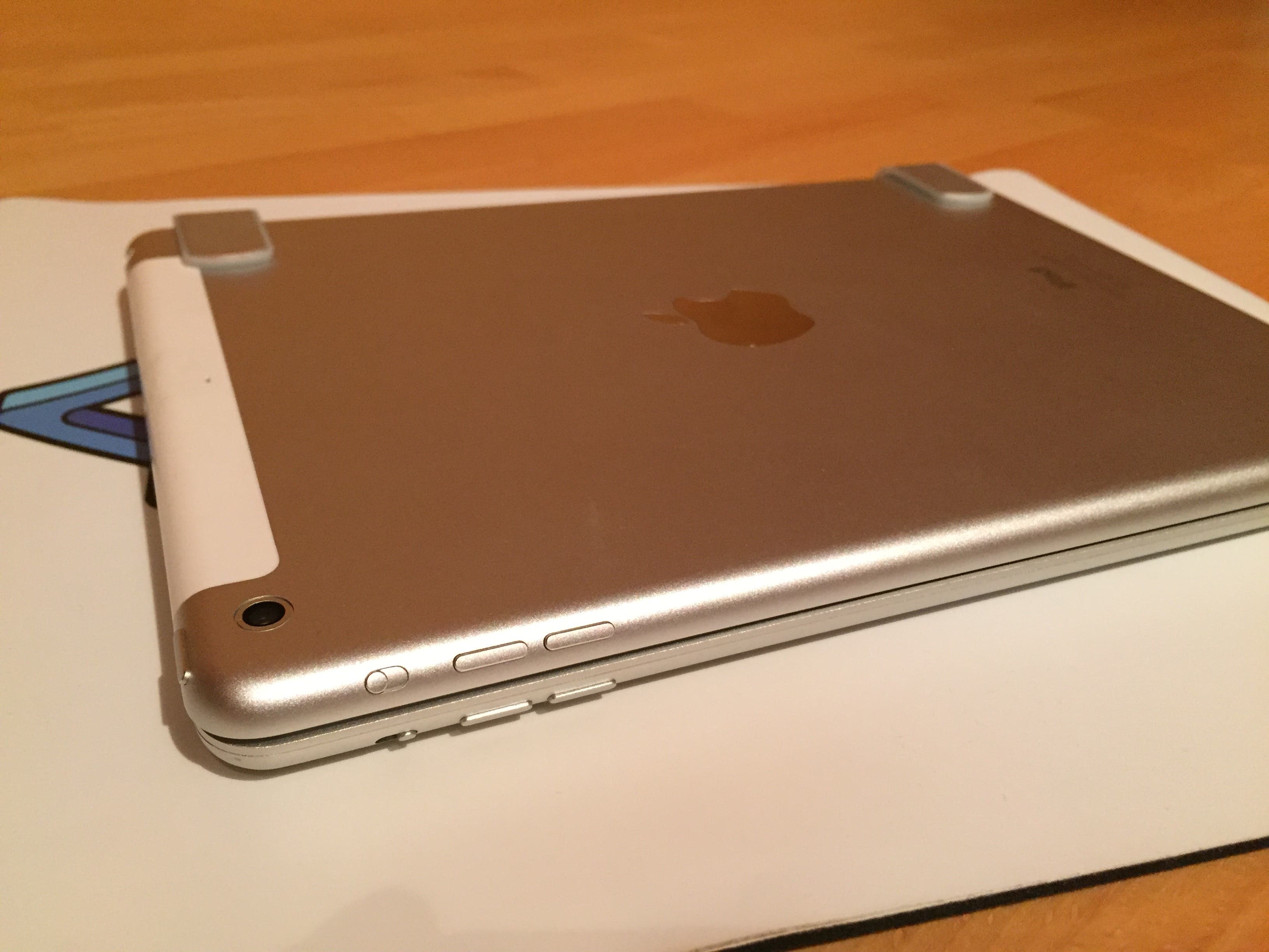 Insgesamt ist bei diversen Keyboards nach 135 Grad Öffnungswinkel Schluss. Das kann manchmal noch zu wenig sein, gerade abends auf der Couch, je nachdem wie man sich dreht und wendet. Die Scharniere des BrydgeAir hingegen ermöglichen sogar einen Öffnungswinkel von 180 Grad. Das ist erstklassig. Das verwendete Aluminium unterscheidet sich in der Griffigkeit nicht von Apples iPad Air. Das wirkt hochwertig und hebt das Keyboard qualitativ hervor. Mit eingestecktem iPad wirkt es wie aus einem Guss bzw. wie ein Subnotebook.