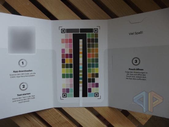 CASC kommt in einem Umschlag mit vier Testkits. Jedes der vier Testkit besteht aus einem weiteren kleineren Umschlag, in dem ein buntes Kachel-Mosaik mittig aufgedruckt ist, das einen schwarzen Bereich umrahmt. Links befindet sich ein QR-Code und rechts ist ein Kunststoffbriefchen mit einem Teststreifen aufgeklebt. Zudem sind die einzelnen Schritte in einer Art Kurzanleitung aufgedruckt.