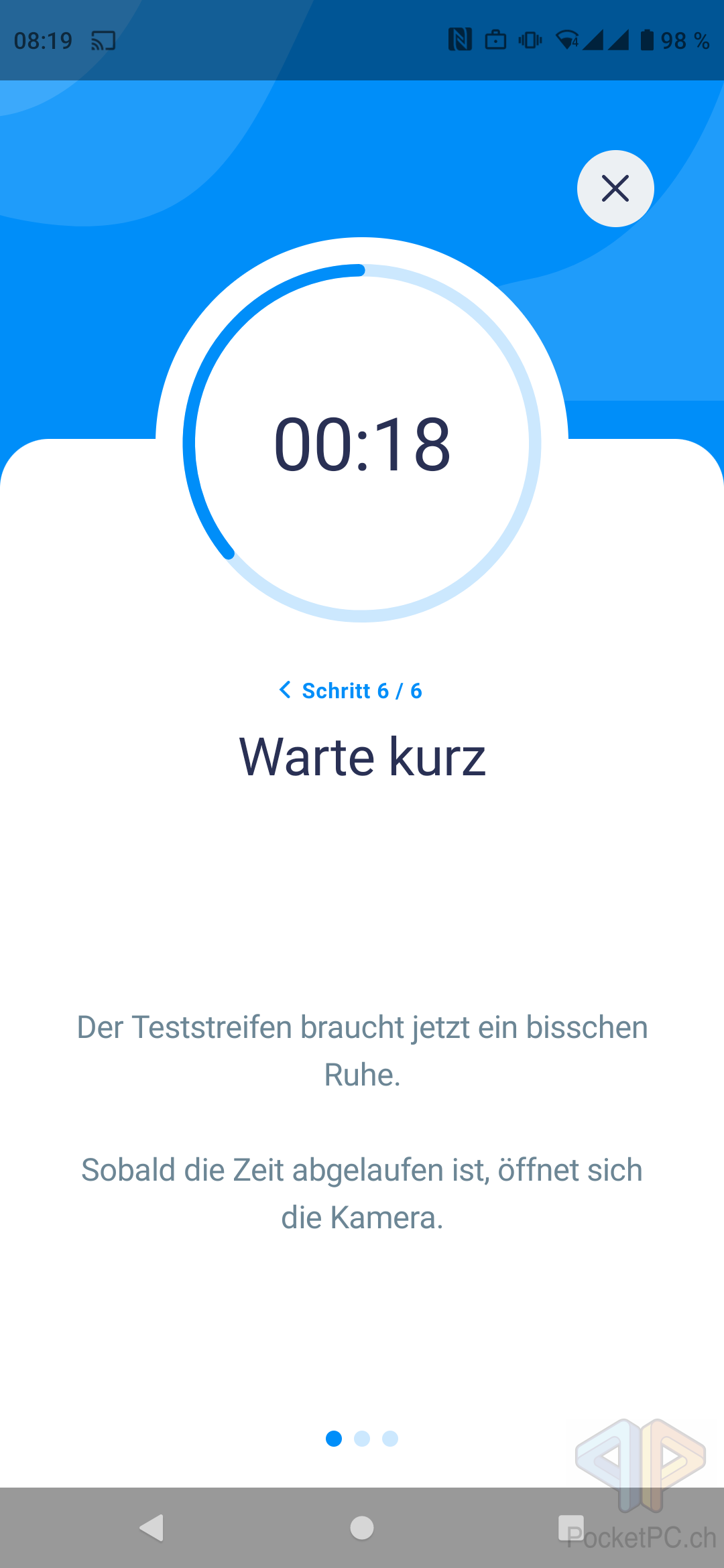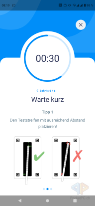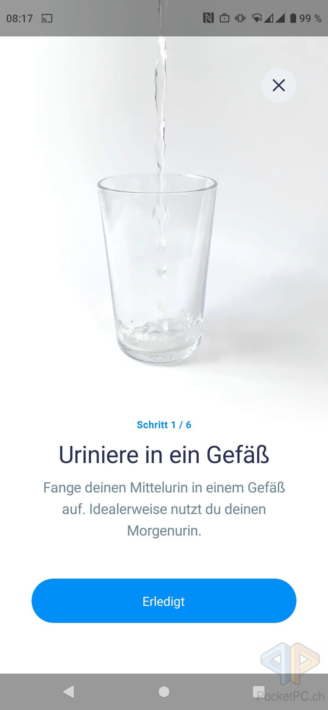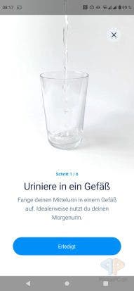 Danach soll man einmal morgens nach dem Aufstehen den ersten Urin, also den sogenannten Morgenurin, in einem Becher sammeln. Den Teststreifen aus der Pouch muss man dann für eine Sekunde in den Urin halten, kurz abstreifen und nach einer halben Minute kann er auf dem Testfeld der Umverpackung platziert werden.