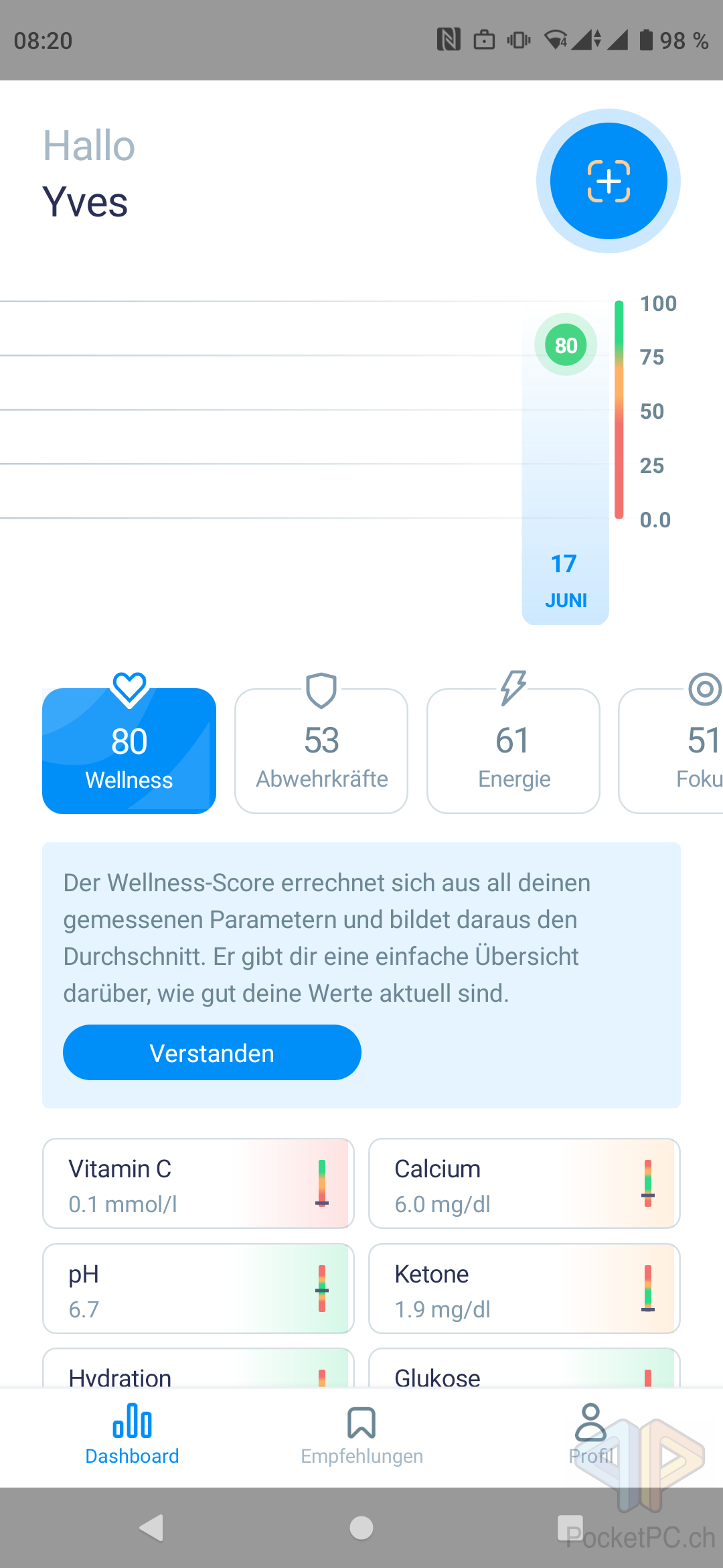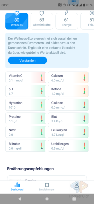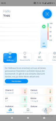 Bei der Kategorie Aussehen etwa, was Haare, Haut und Nägel umfasst, verbleiben dann nur noch Vitamin C, Calcium, Ketone, Hydration, Blut und Bilirubin. Der Wellness-Score umfasst immer alle zwölf Werte und deren Einzelauswertungen.