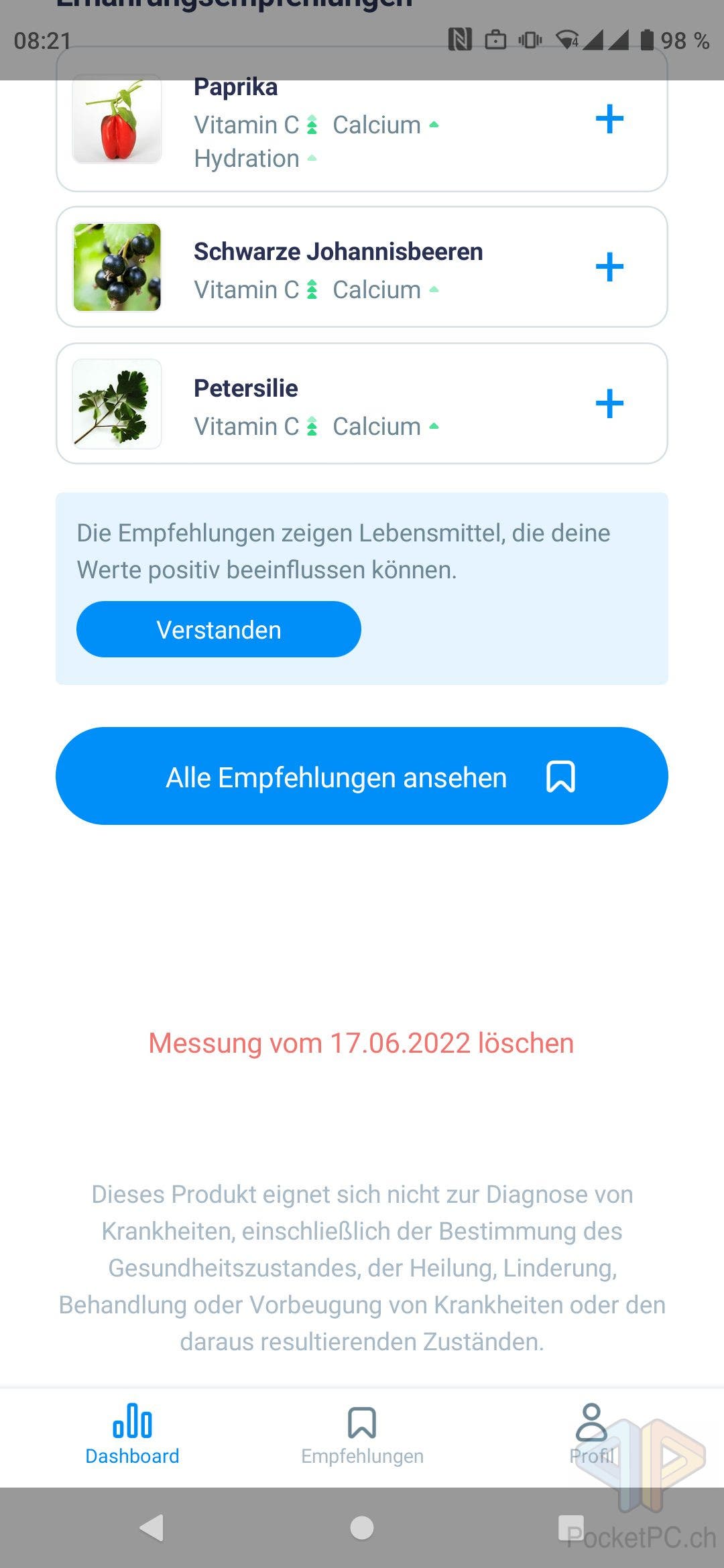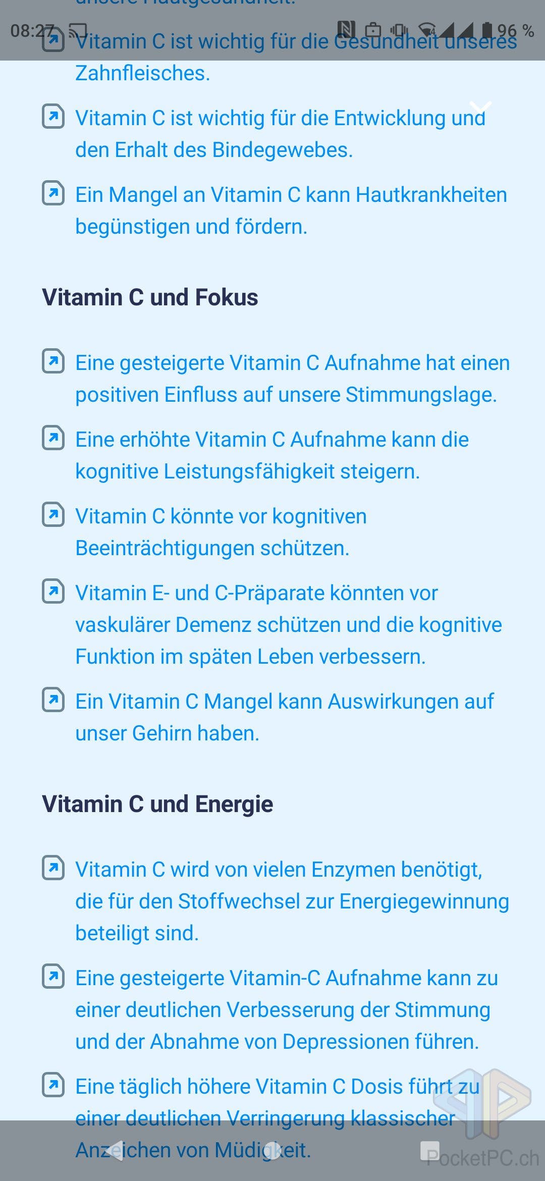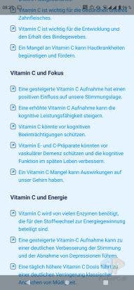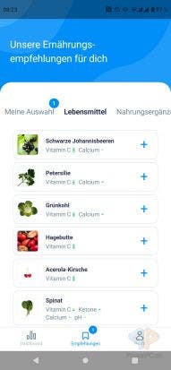 Schlussendlich finden wir in jeder der zwölf Einzelauswertungen auf uns jeweils individuell zugeschnittene drei Ernährungsempfehlungen. Etwa kann man so bei Vitamin C-Mangel vermehrt zu schwarzen Johannisbeeren, zur Aceolra-Kirschen und zu Hagebutten-Produkten greifen. Die Ernährungsempfehlungen sind jeweils bebildert und mit einem Antippen auch mit einem kurzen Absatz erklärt.