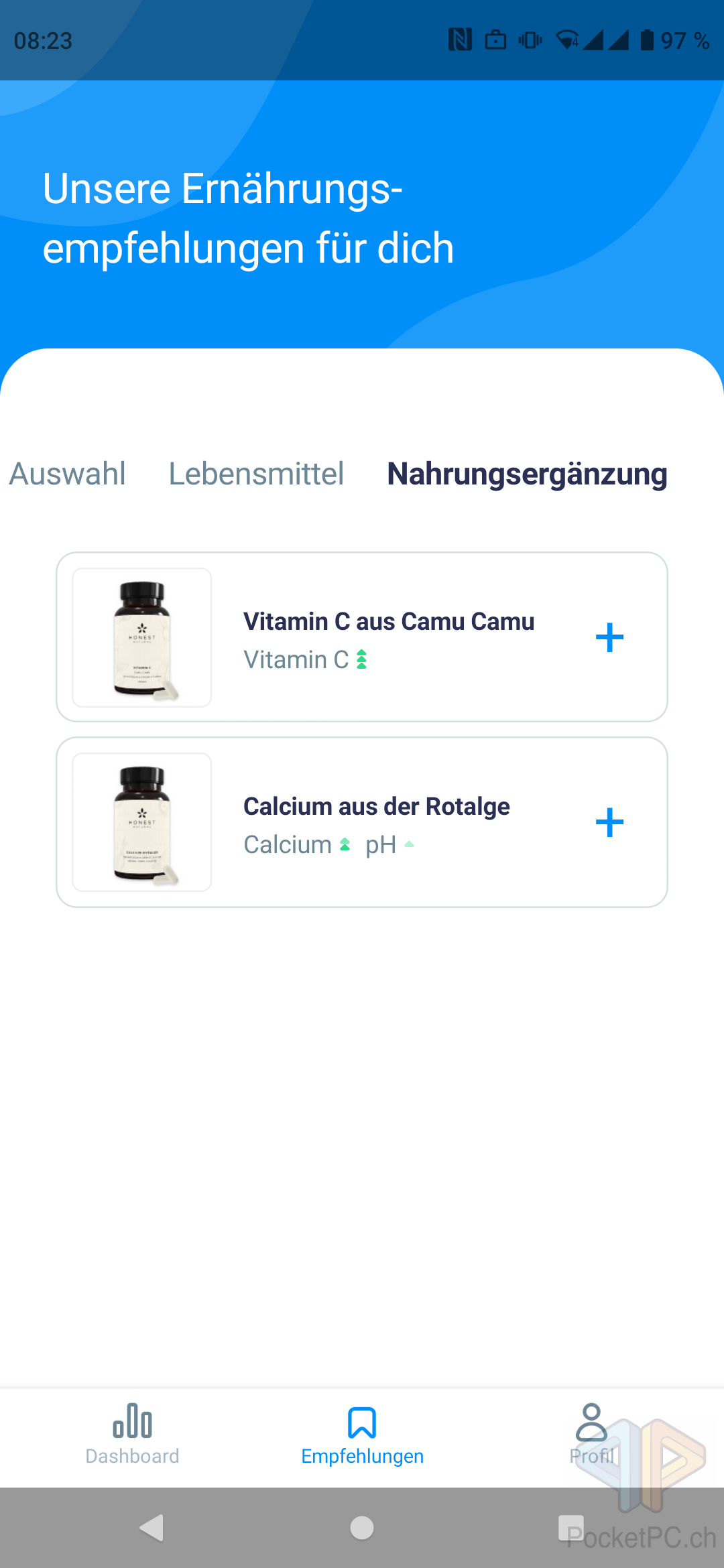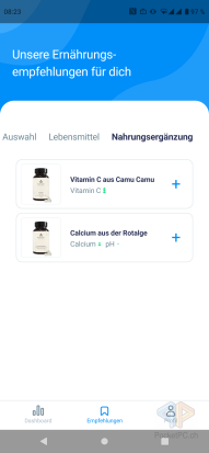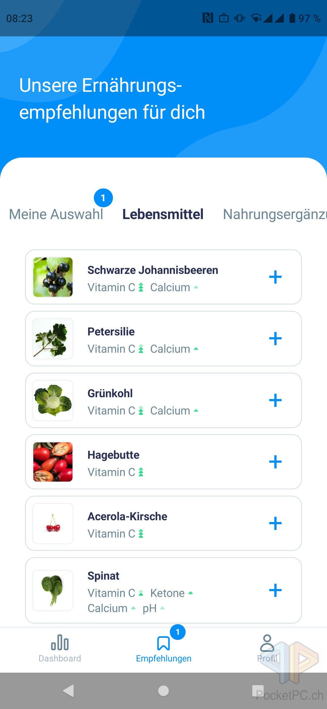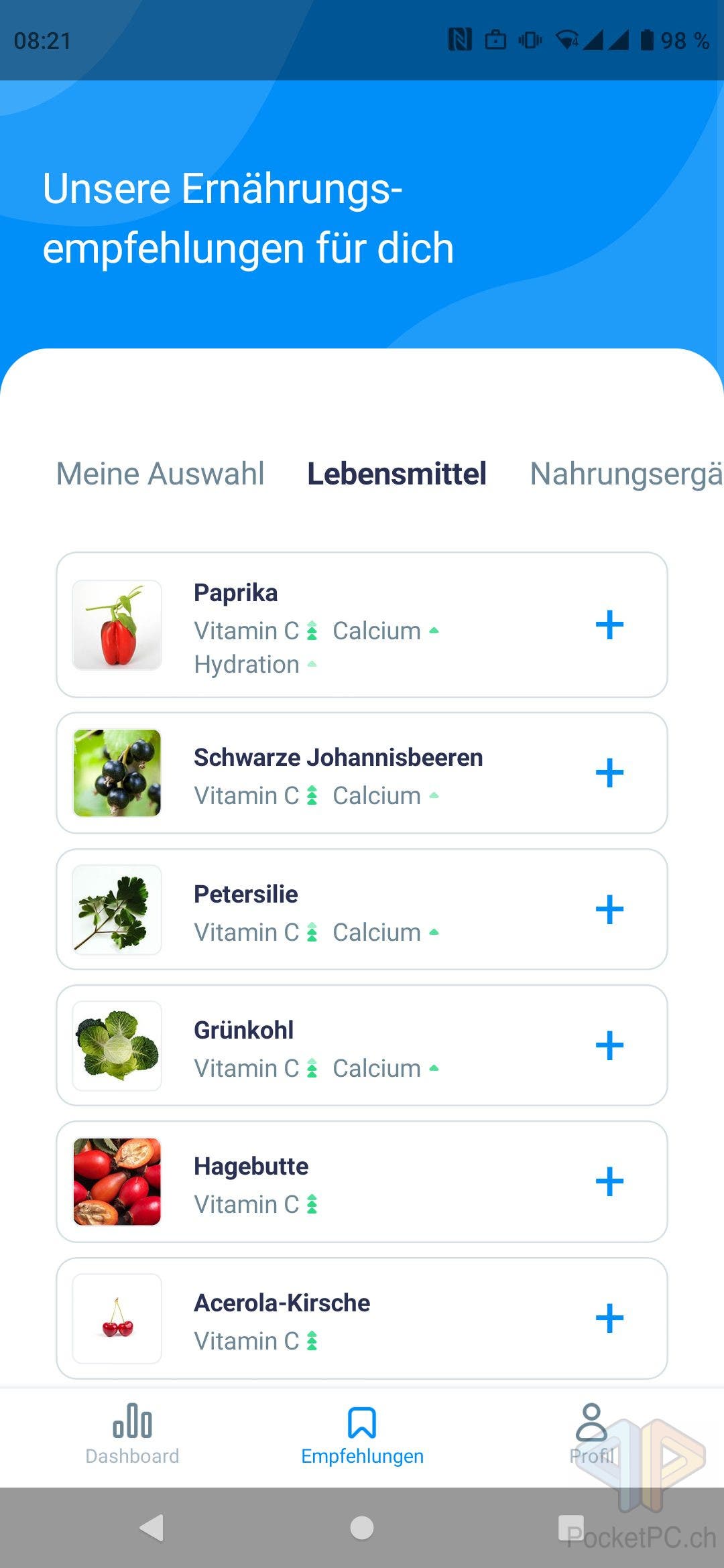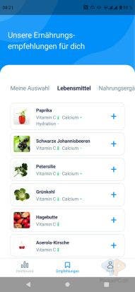 Mit einem Tippen auf das Plus-Symbol kann eine Ernährung- oder Ergänzungssempfehlung dann jeweils in die eigene Auswahl Übernommen werden, so dass man auf einen Blick sieht, was man sich selbst vornimmt, zu verbessern.