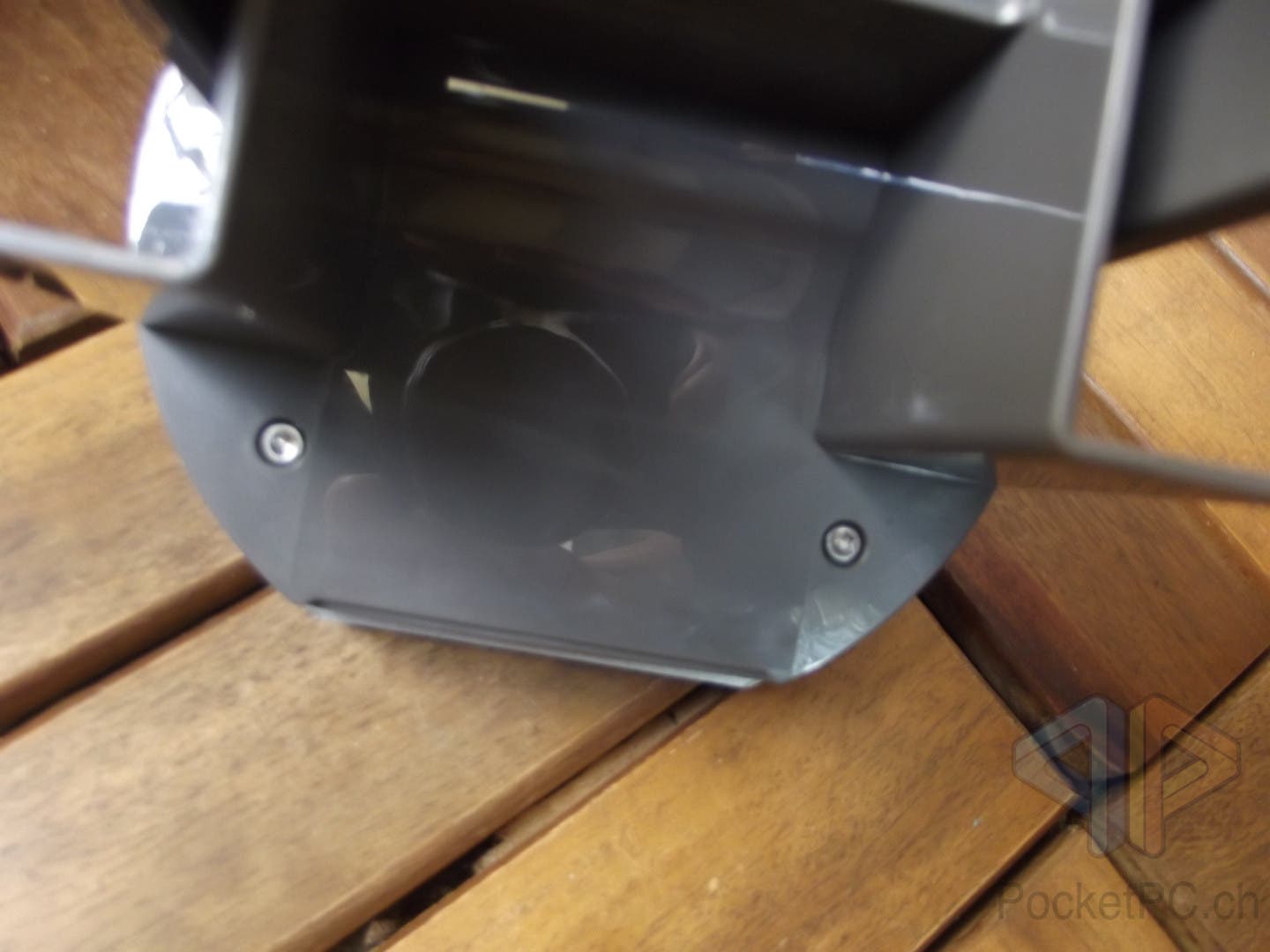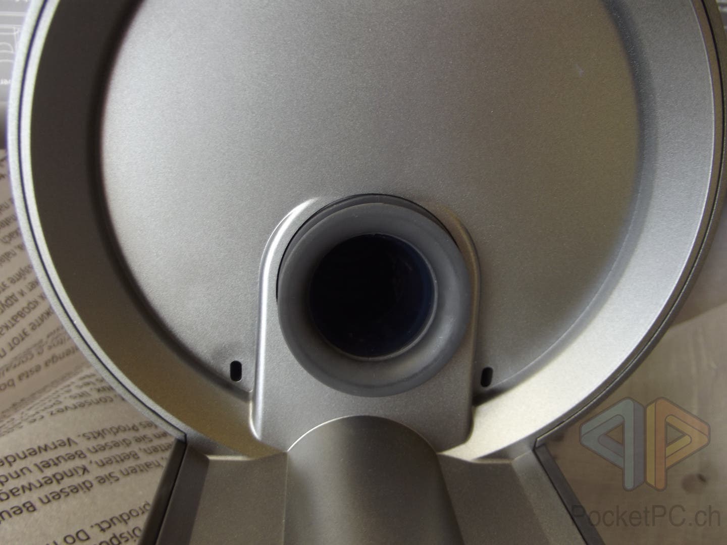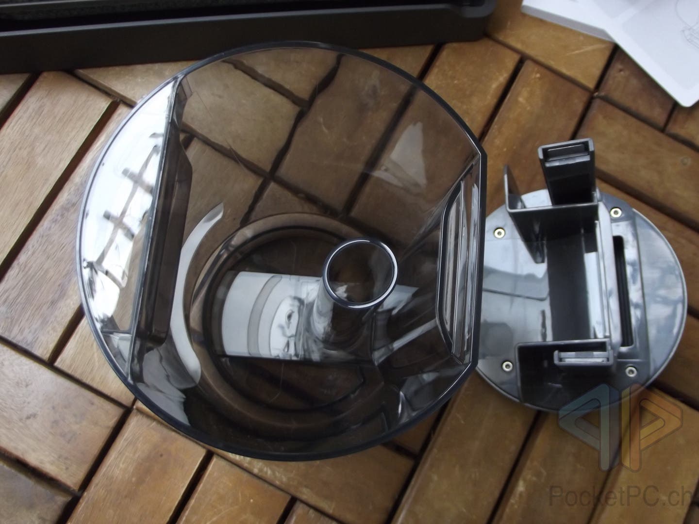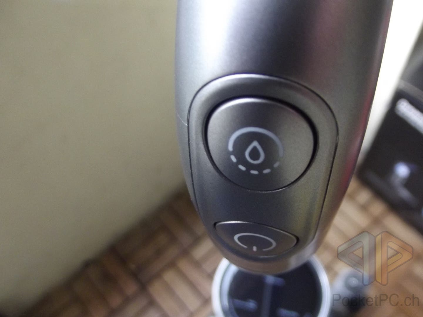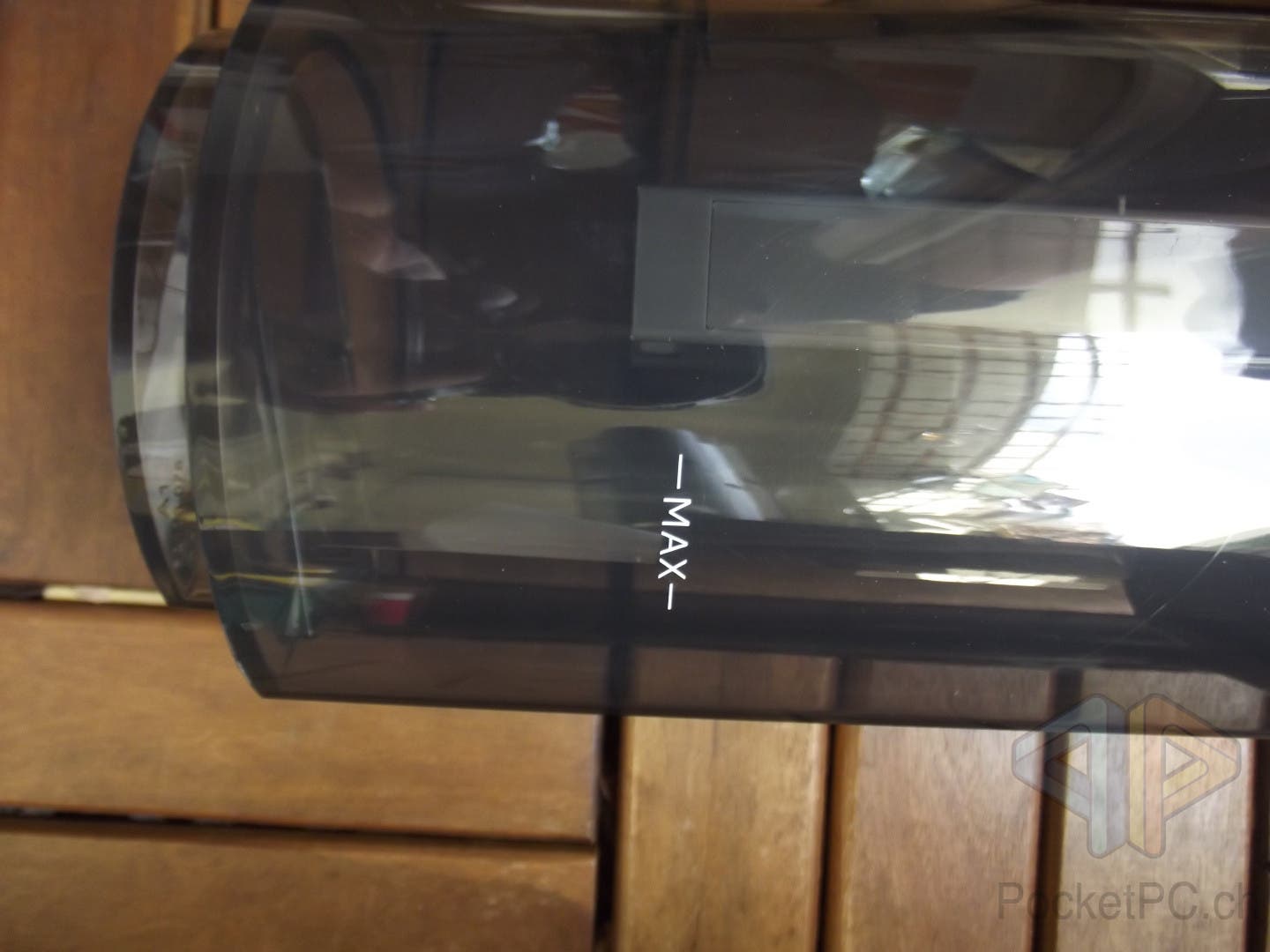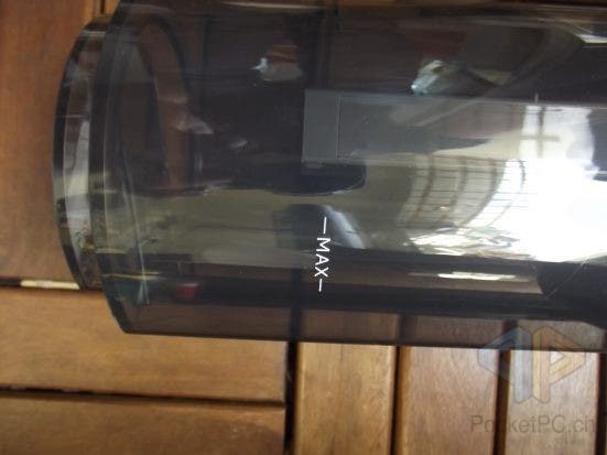 Zum Befüllen des Wassertanks nimmt man diesen mit einer Hand aus dem Gerät heraus. Sodann kann die Klappe an der Oberseite geöffnet werden, um Wasser einzufüllen. Dabei muss man einigermassen behutsam vorgehen, denn die Füllöffnung ist nicht gerade gross dimensioniert.