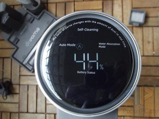 Zudem ist der Auto-Modus und der Wasserabsorptions-Modus mit einem eigenen Symbol vertreten. Neben der Prozentanzeige für den Akkufüllstand des Dreame 11 Max wird ein kleiner Blitz angezeigt. Leuchtet dieser grün, ist der Akku mehr als 20 Prozent voll. Orange bedeutet, dass er unter 20 Prozent Füllstand hat und bald wieder aufgeladen werden sollte.