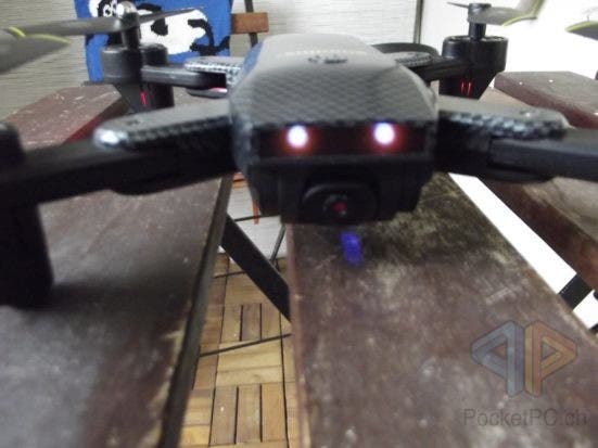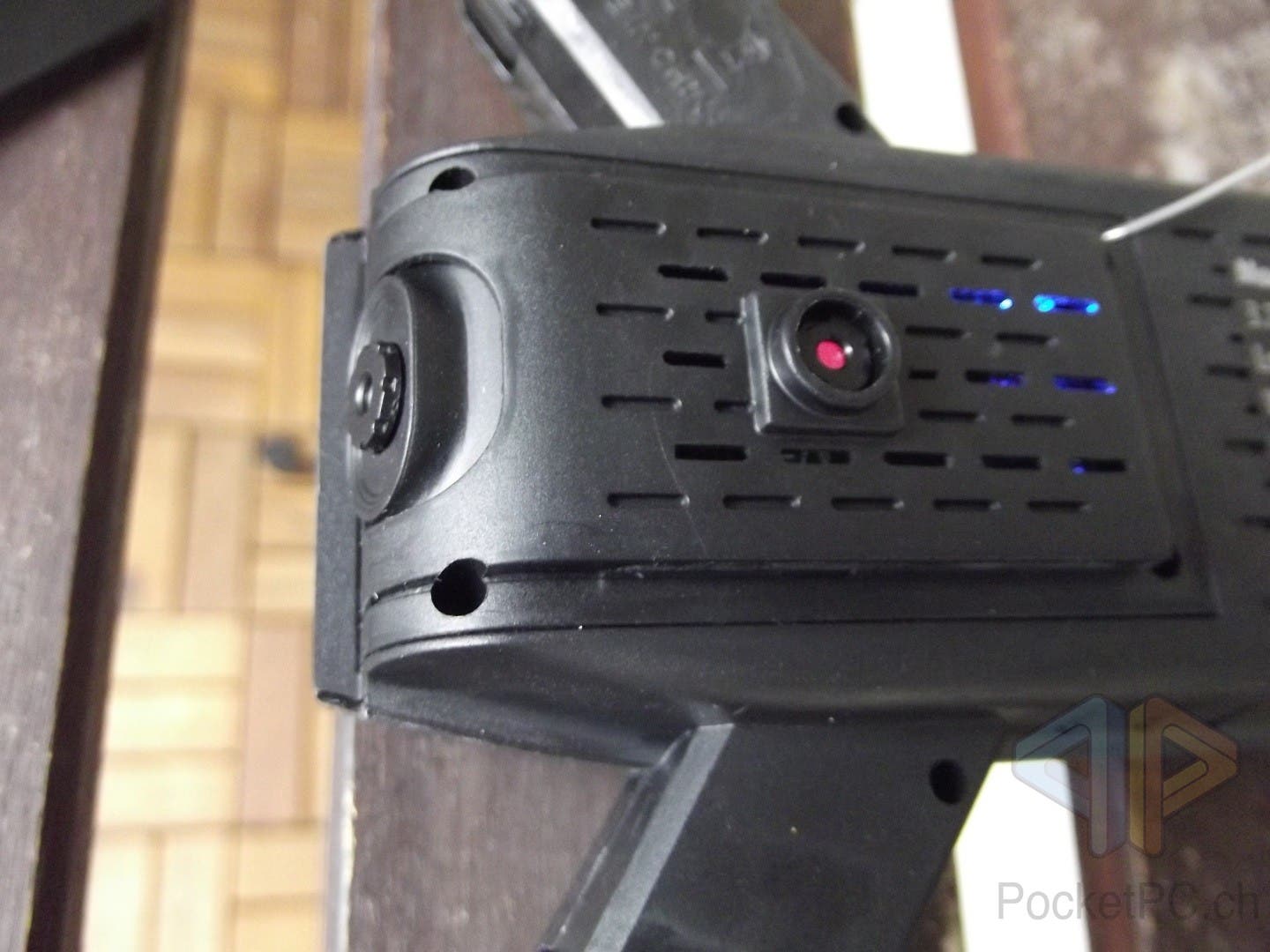 Das Ganze funktioniert nach etwas Eingewöhnungszeit recht gut und die kleine Drohne ist erstaunlich wenig und Flugstabil. Die Gehäusekamera, die fix nach unten zeigt, hilft dem Gadget sehr gut, die Höhe zu halten, so dass das Fluggerät toll ohne weiteres Zutun schweben kann. Voraussetzung dafür ist jedoch, dass der Untergrund nicht zu sehr reflektiert und hell genug ist. Über Wasser und Schnee kann die Drohne nur schwer die Höhe halten und in der Dämmerung tut sie sich auch schwer. Die Hauptkamera dient lediglich für Video- und Fotoaufnahmen – doch dazu gleich mehr.