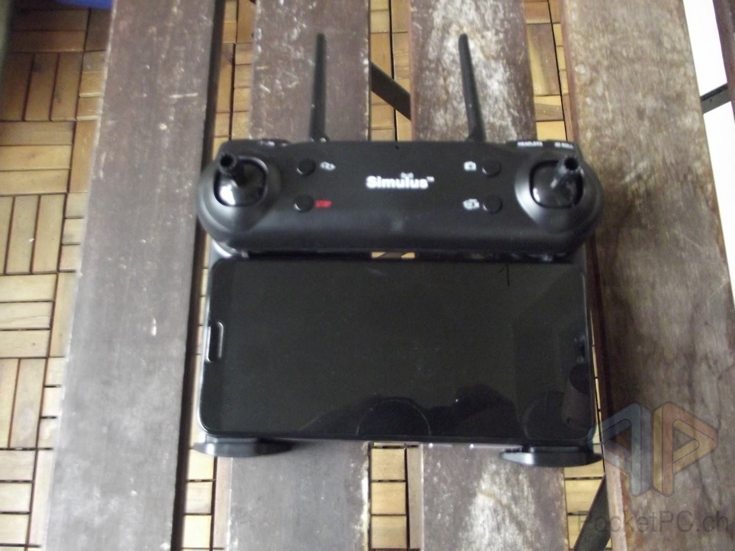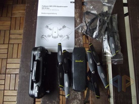 Im Lieferumfang der FPV-Drohne sind neben einer Anleitung zum zusammengeklappten Quadrocopter und einem kurzen microUSB-Kabel zum Aufladen vier Rotorschutz-Bügel zum Aufstecken sowie vier Ersatz-Rotoren. Hinzu kommt die aufklappbare Fernbedienung, in die bei Bedarf ein Smartphone von bis zu 8 cm Breite eingeklemmt werden kann. Dieses dient dann an Display für die Foto und Videoaufnahmen.