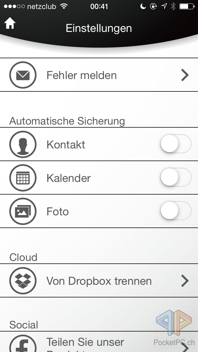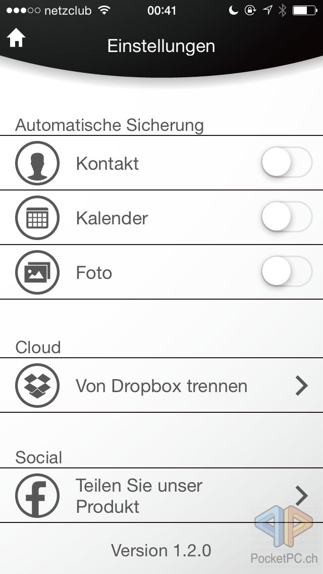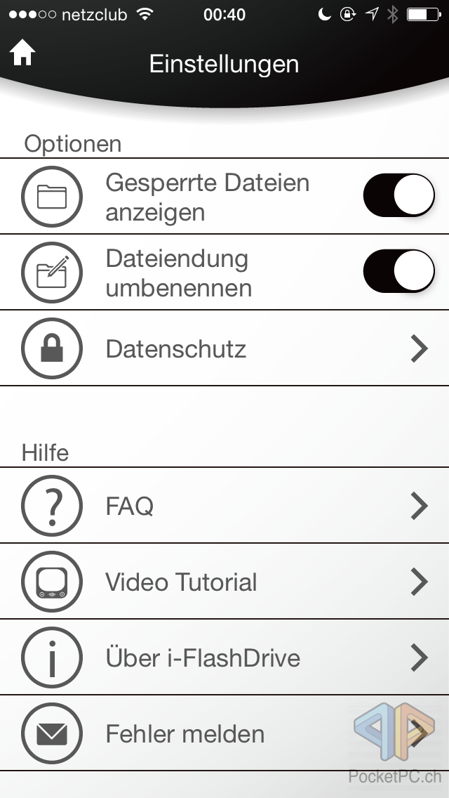 Sie kann nicht nur die Dateien auf dem Stick und auf dem iOS-Gerät verwalten, entsprechende Berechtigungen vorausgesetzt. Darüber hinaus verfügt sie über einen eigenen Musik-Player, der sogar Apple AirPlay, AirPort Express und Apple TV benutzen kann. Selbiges gilt für den eingebauten Videoplayer, der H.264-Videos zu Apple TV-Geräten streamen kann. Die Picture-Funktion kann Bilder anzeigen und auf Social Media-Plattformen teilen, mittels Documents können DOC, TXT, HTML-Seiten, Keynotes, Numbers, Pages, PDF, PPT, XLS und RTF-Dateien geöffnet werden. Die Backup-Funktionen sind für Fotos, Kontakte und Kalender verfügbar und legt eine Sicherungskopie der Daten auf dem Stick an. In den Einstellung lässt sich eine automatische Sicherung der jeweiligen Daten konfigurieren. Das Icon für die DropBox öffnet aus der App heraus die DropBox und die Rekorder-Funktion nimmt Sprachaufnahmen auf, um diese auf dem externen Speicher abzulegen.