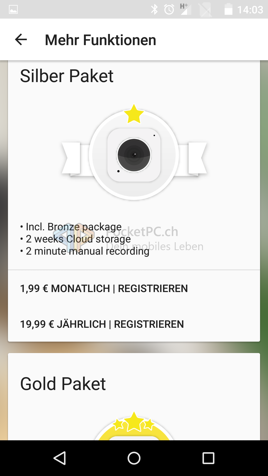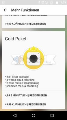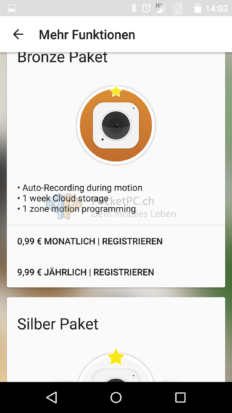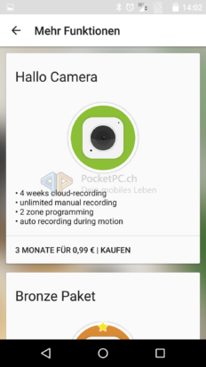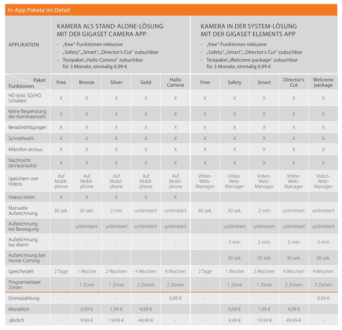 Will man jedoch die Kamera zur Überwachung nutzen, ist das Erstehen von Cloud-Paketen notwendig, die von 0,99 Euro bzw. 1.08 SFr. bis 4,99 Euro bzw. 5.50 SFr. monatlich oder um den Faktor zehn im Jahresabo zu haben sind. Diese Pakete ermöglichen es, automatische Videoaufnahmen beim Erkennen einer Bewegung in der Cloud von Gigaset zu erstellen, die dann entsprechend länger aufbewahrt bzw. um weitere Funktionen wie eine uneingeschränkte manuelle Aufnahmen und zusätzlich konfigurierbare Bereiche, in denen Bewegungen erkannt werden sollen, erweitert werden. Ein Testpaket namens “Hallo Camera” für Gigaset elements bzw. “Welcome Package” für die eigenständige Gigaset Camera-App kostet einmalig 0,99 euro bzw. 1.08 SFr. und erlaubt den Zugriff auf alle Funktionen und Features der Cloud-Kamera einmalig für drei Monate. Mehr zu den um Abo-Möglichkeiten findet ihr im nachfolgenden Datenblatt-Auszug.