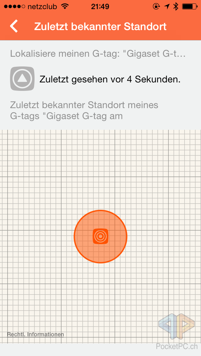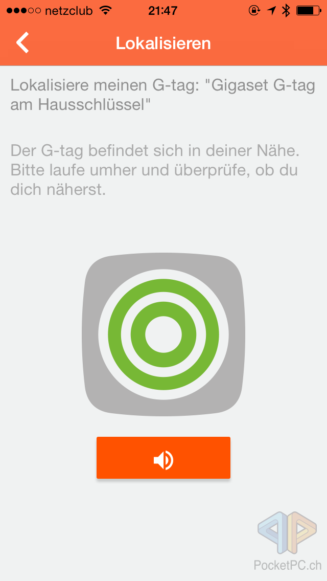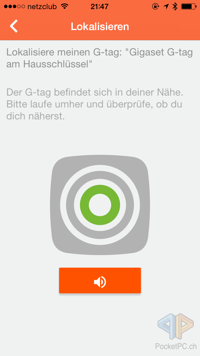 Die App verfolgt von da an die Verbindung zum G-tag bis zu 30 Meter und merkt sich bei Verlust des Signals die aktuellen GPS-Koordinaten des Smartphones und hinterlässt entsprechende Mitteilungen. In der App ist dann eine interaktive Kartenansicht zum letzten bekannten Standort des Tags zu sehen. Natürlich kann man den G-tag auch mit der dazugehörigen App anpeilen. Dazu wird auf dem Smartphone-Bildschirm ein stilisierter Tag mit drei konzentrischen Kreisen abgebildet. Der Button darunter schaltet typische Peil-Sounds ein oder aus. Ein Ping-Geräusch, welches schneller wird, wenn man dem entsprechenden G-tag näher kommt.