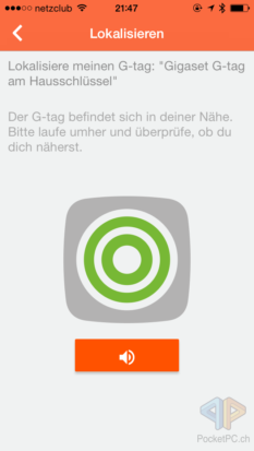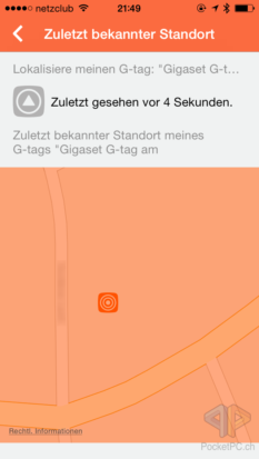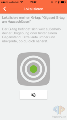 Die App verfolgt von da an die Verbindung zum G-tag bis zu 30 Meter und merkt sich bei Verlust des Signals die aktuellen GPS-Koordinaten des Smartphones und hinterlässt entsprechende Mitteilungen. In der App ist dann eine interaktive Kartenansicht zum letzten bekannten Standort des Tags zu sehen. Natürlich kann man den G-tag auch mit der dazugehörigen App anpeilen. Dazu wird auf dem Smartphone-Bildschirm ein stilisierter Tag mit drei konzentrischen Kreisen abgebildet. Der Button darunter schaltet typische Peil-Sounds ein oder aus. Ein Ping-Geräusch, welches schneller wird, wenn man dem entsprechenden G-tag näher kommt.