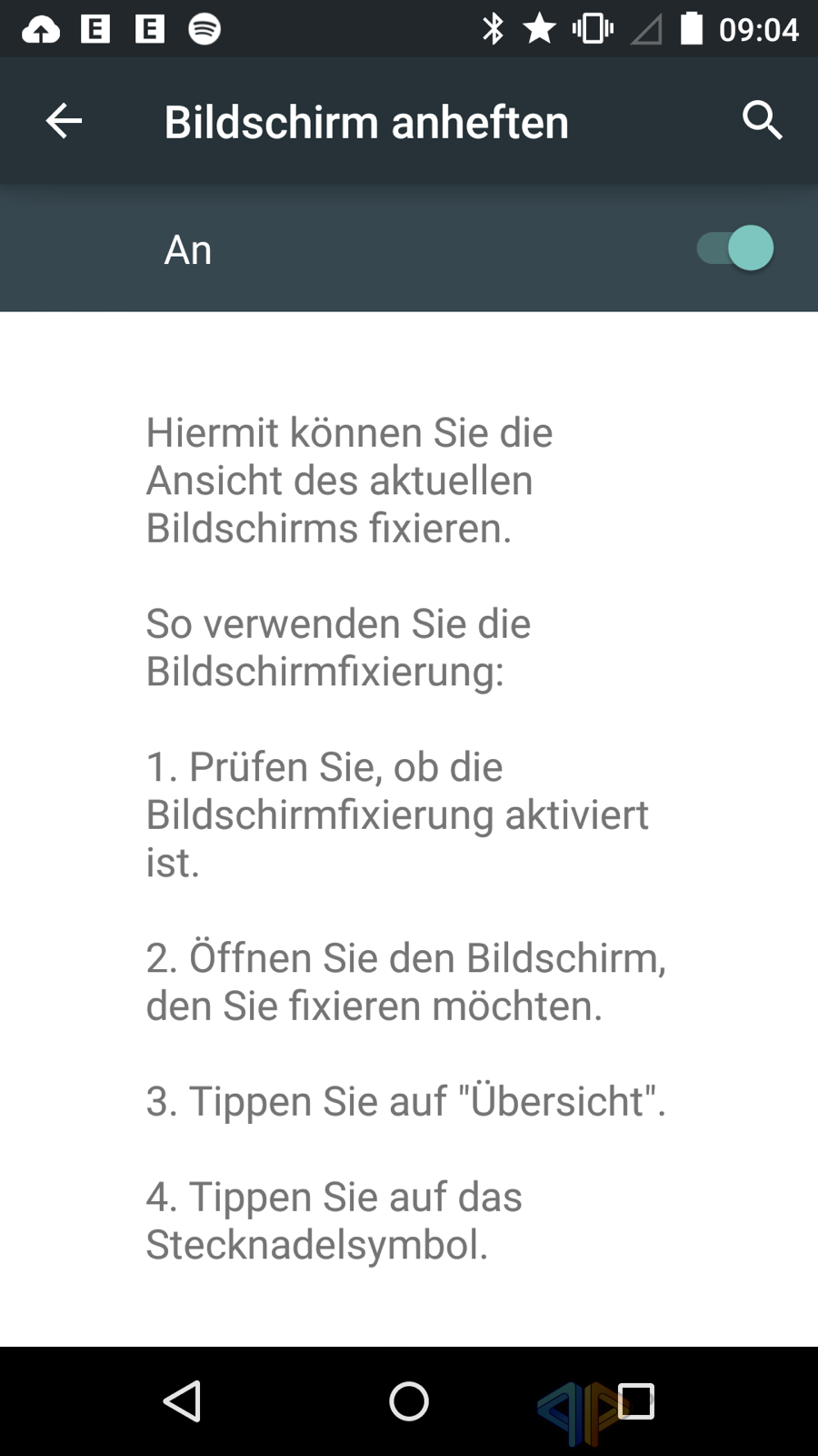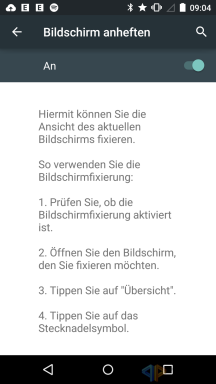 Wer möchte, kann auf eine App fixieren, das funktioniert über das “Stecknadel” Icon. Ihr müsst als erstes diese Funktion über die “Einstellungen – Sicherheit – Bildschirm anheften” aktivieren. Als nächstes geht ihr in die App, die Ihr fixieren wollt und geht in die Multitasking Ansicht. Nun bestätigt ihr das Fixieren durch die Stecknadel. Nach dem Auswählen ist es nicht mehr möglich, aus dieser App heraus zu kommen. Gut um beispielsweise einem Kind das Smartphone zu geben für ein kleines Spiel oder einen Film. Um die Fixierung zu deaktivieren, drückt Ihr gleichzeitig die Zurück und die Multitasking Taste.