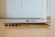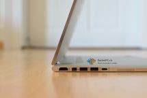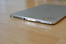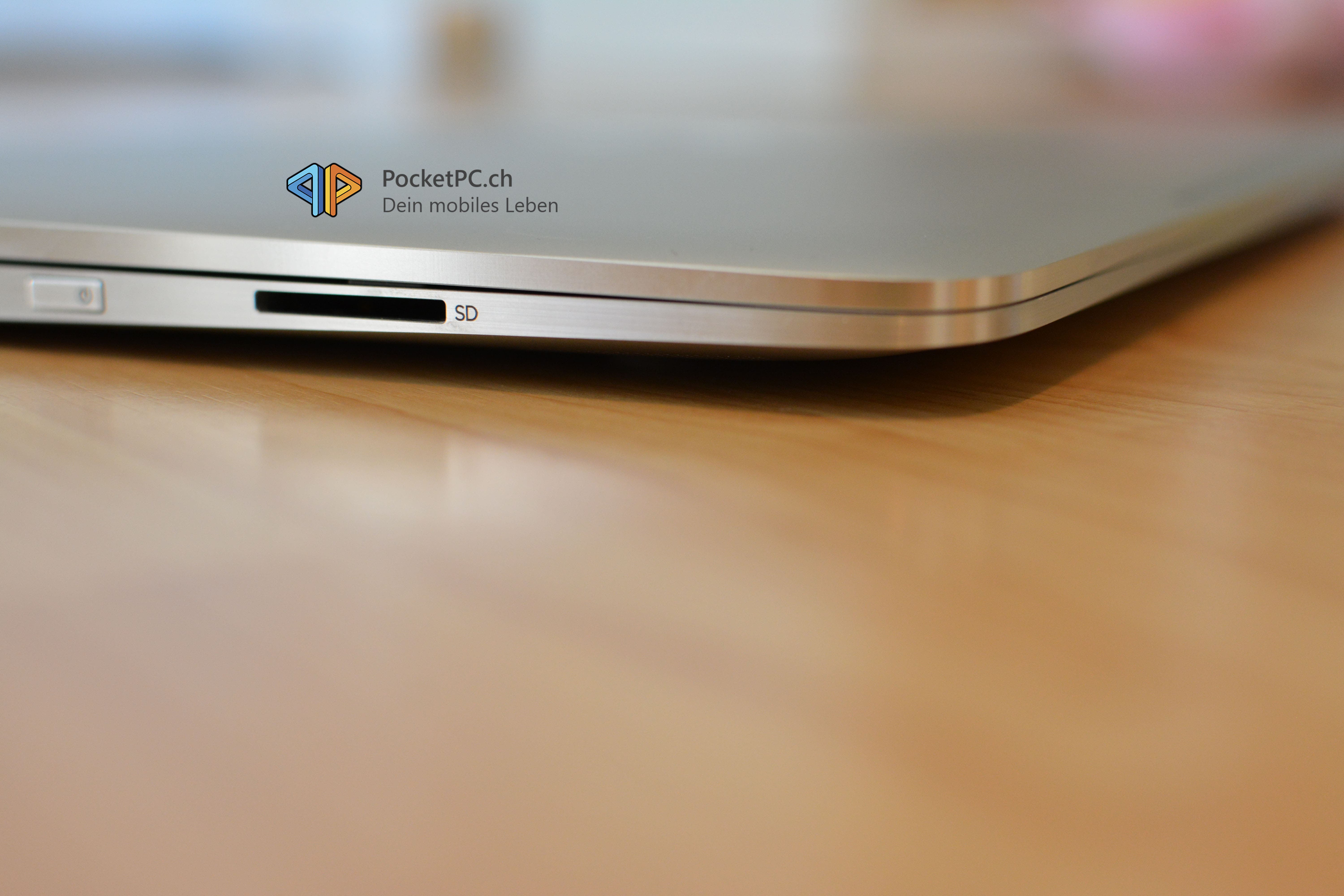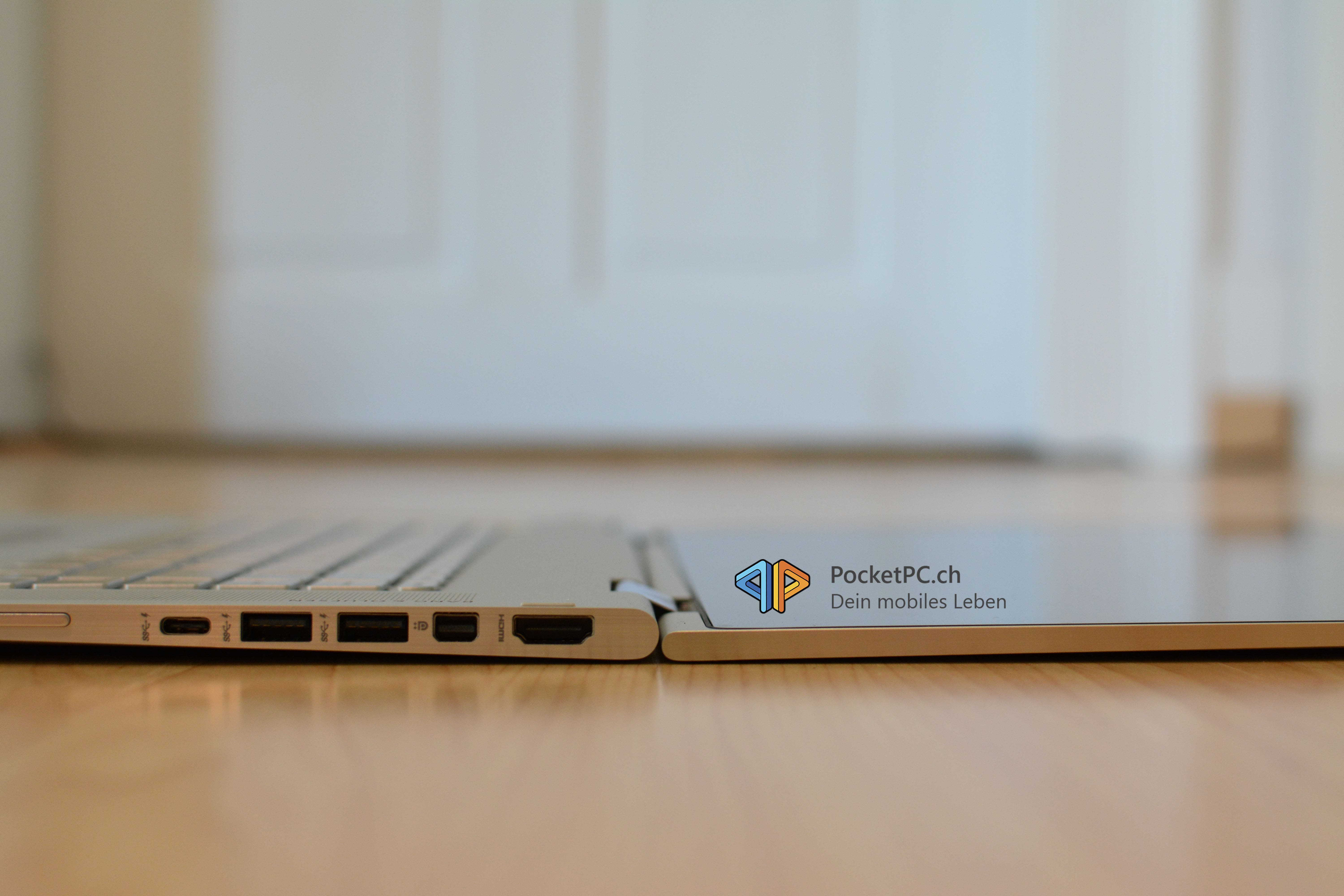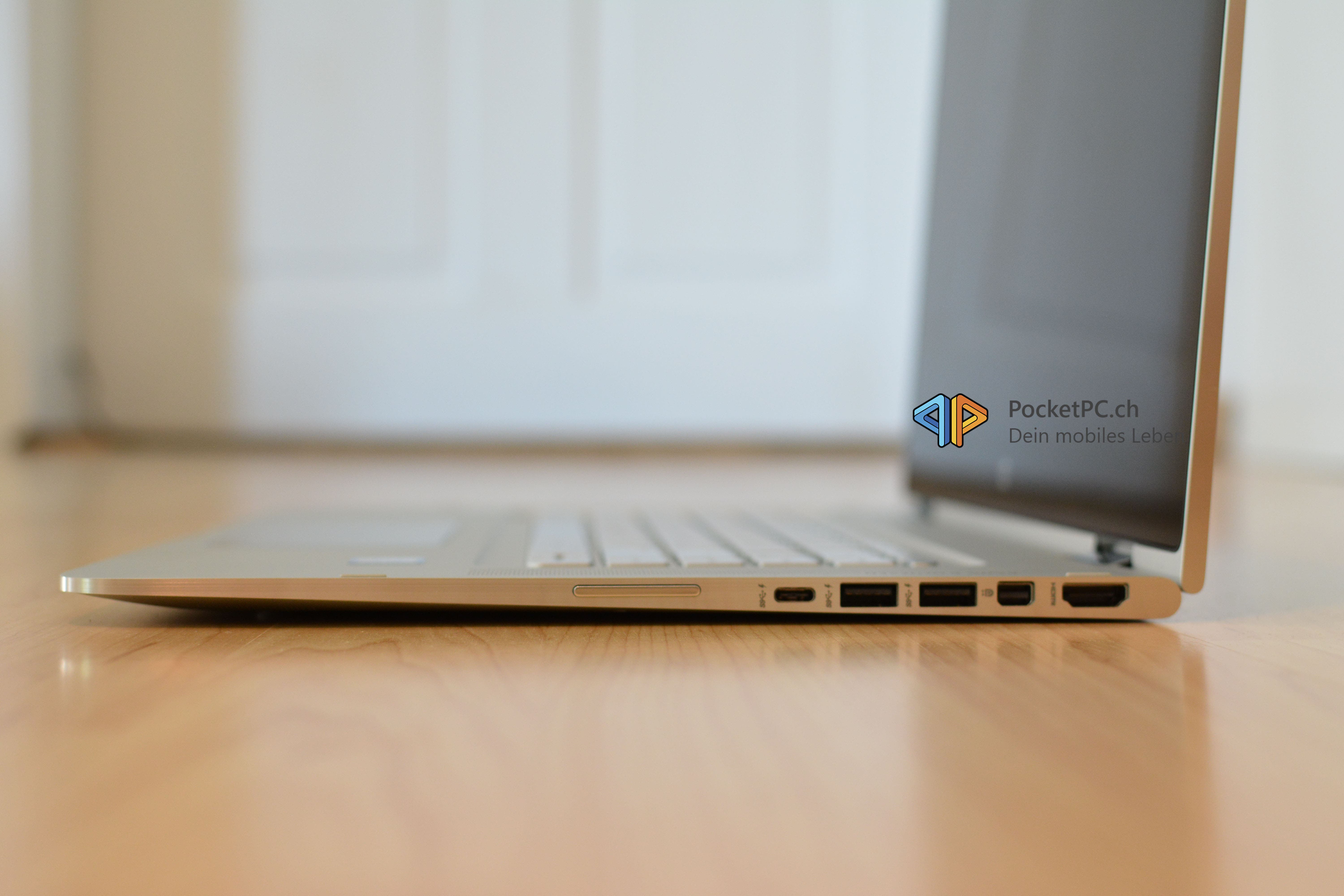 Die Seiten des Gerätes wirken hochwertig und geben den optischen Eindruck, dass das Gerät sehr dünn ist, wobei das Gerät selbst etwas dicker ist. Auf der sehr schicken Seite des Gerätes findet man unzählige Anschlüsse. Es sind nicht nur 3 USB 3.0 Type A-Anschlüsse zu finden, sondern auch ein moderner USB 3.0 Type C Anschluss. Daneben kann man zusätzliche Displays über HDMI wie auch einem Mini DisplayPort anschliessen. Komplettiert werden die Anschlüsse mit einem SD-Kartenleser und einem 3.5mm-Anschluss (Kopfhörer/Mikrofon kombiniert).
