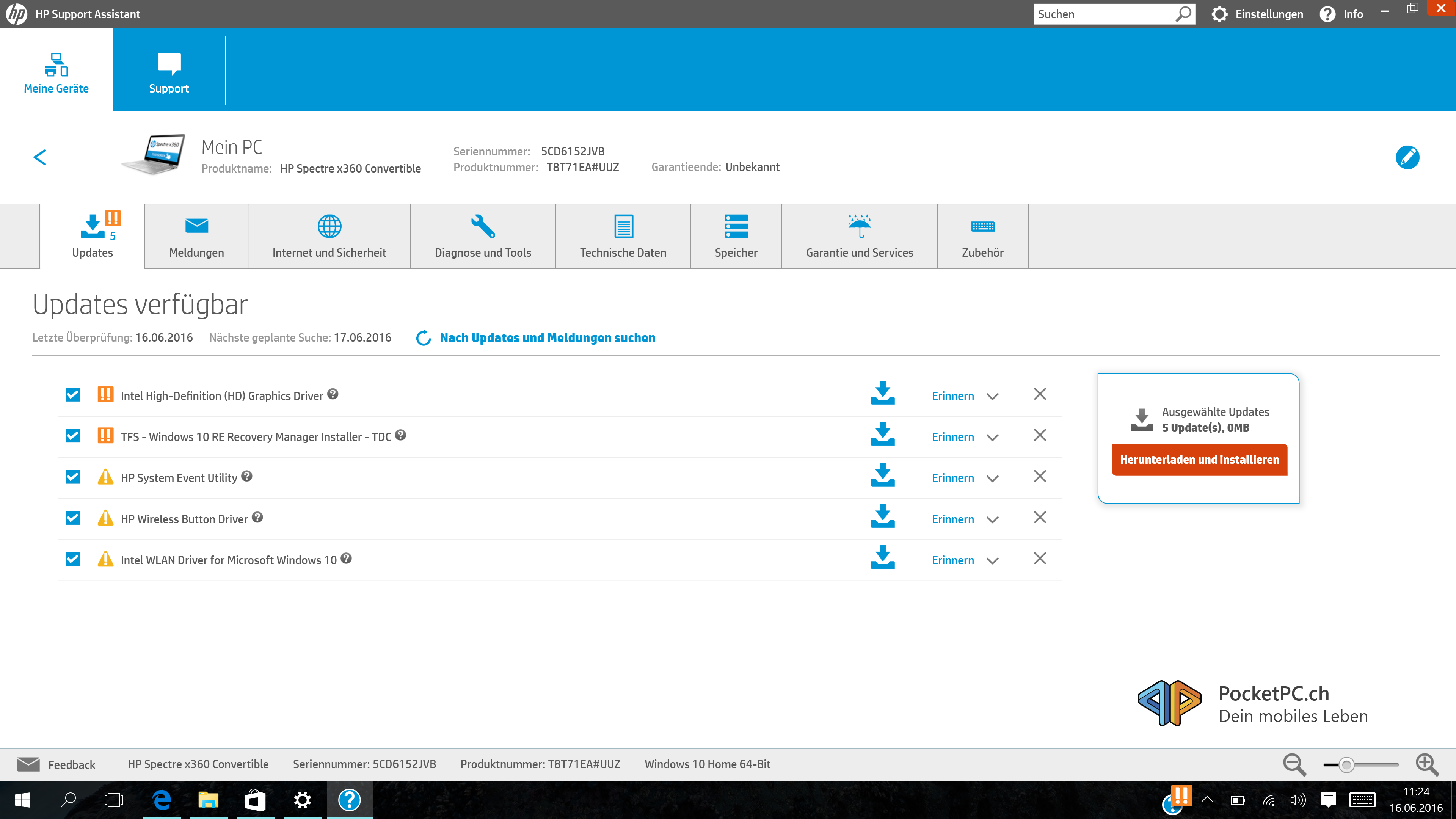 Nach der Ersteinrichtung und der Installation der Updates (aus 3 Orten: Store, Windows Update und HP Support Assistant) sind noch 190 GB auf der Festplatte verfügbar. Beim Installieren der Updates mit Hilfe des HP Support Assistants wurde auch direkt mein HP Officejet 6700 Premium-Drucker im Netzwerk erkannt und installiert – ein nettes Feature.
