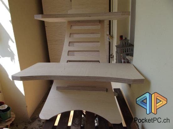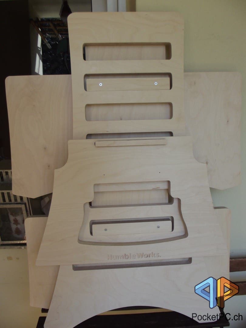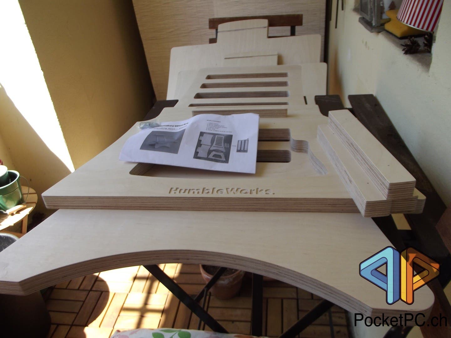 Das nun fertige HumbleWorks Stan-Gestell lässt sich einfach zusammenstecken und auch wieder zerlegen, wenn es nicht gebraucht wird. Einmal aufgebaut findet auf der unteren Ablage eine Tastatur und Maus bzw. statt letzterem ein Trackpad Platz, auf der oberen ein Laptop, All-in-One PC oder ein Monitor. Die Ablagen sind mit einer konkaven Vorderkante versehen, so dass die Benutzung vereinfacht wird. Gut sieht das dabei auch noch aus.