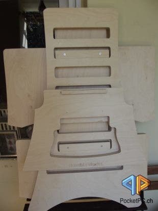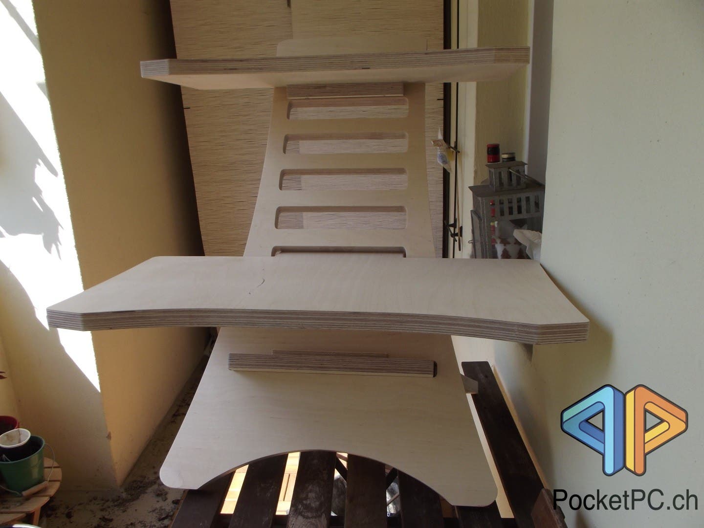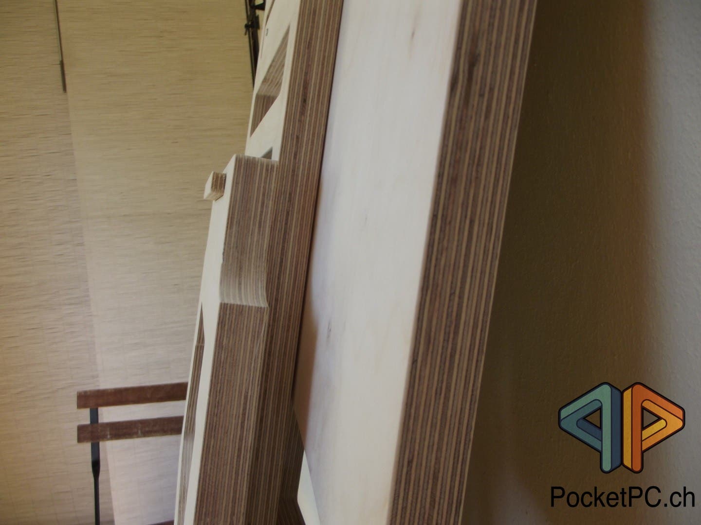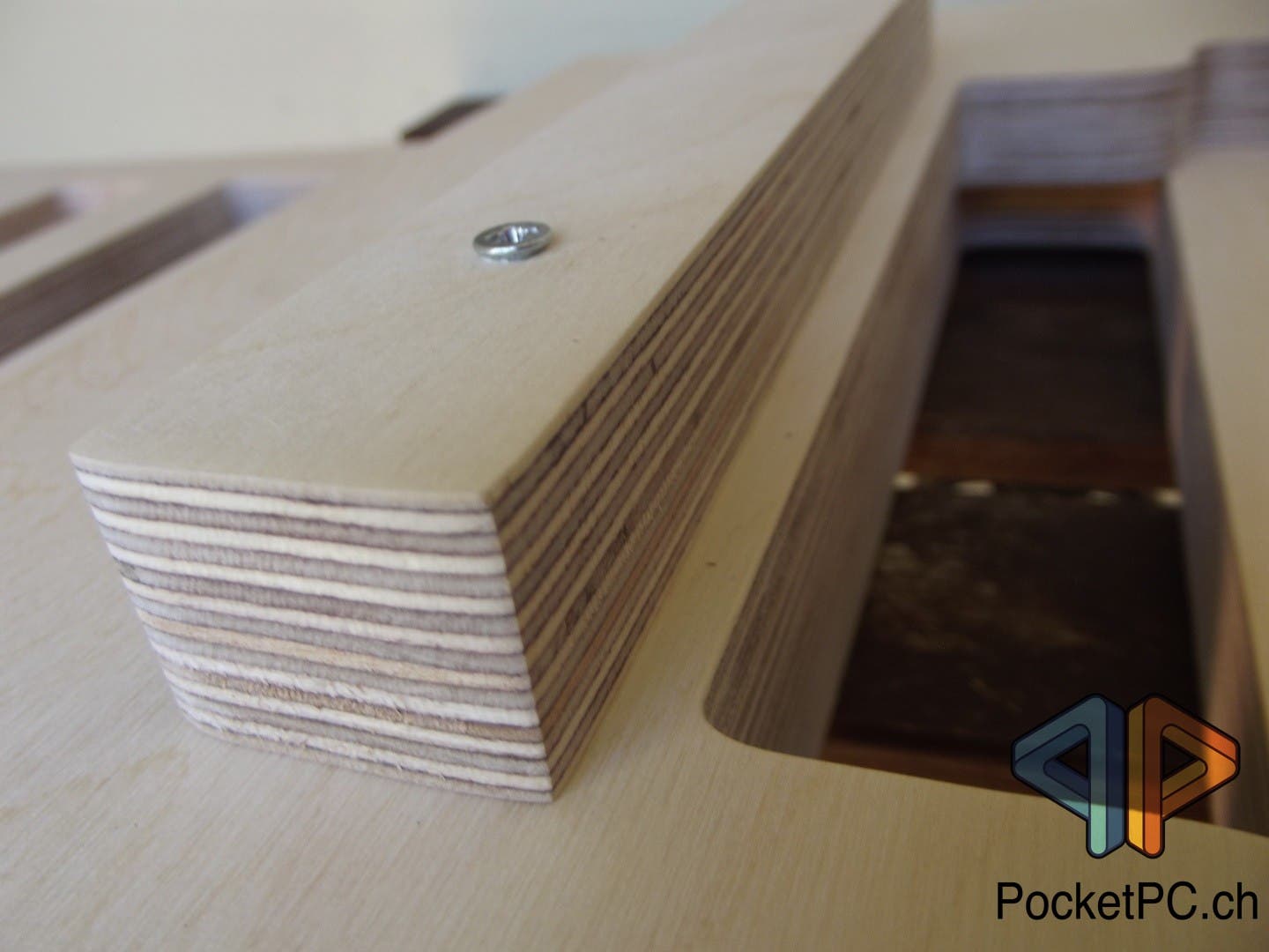 Gefertigt werden diese Stehtische in kleinen Chargen in Grossbritannien aus 18 mm starkem Birken-Sperrholz und ist einwandfrei verarbeitet. Keine unsauberen Kanten, keine ausgefransten Bohrlöcher sind zu sehen. Die Holzoberflächen sind unbehandelt und nur wenig geschliffen, so dass darauf die Geräte und Gadgets nicht so leicht weg rutschen, aber auch Lasermäuse keine Schwierigkeiten bei der Benutzung haben sollten. Natürlich ist das Sperrholz nicht das aller edelste,
