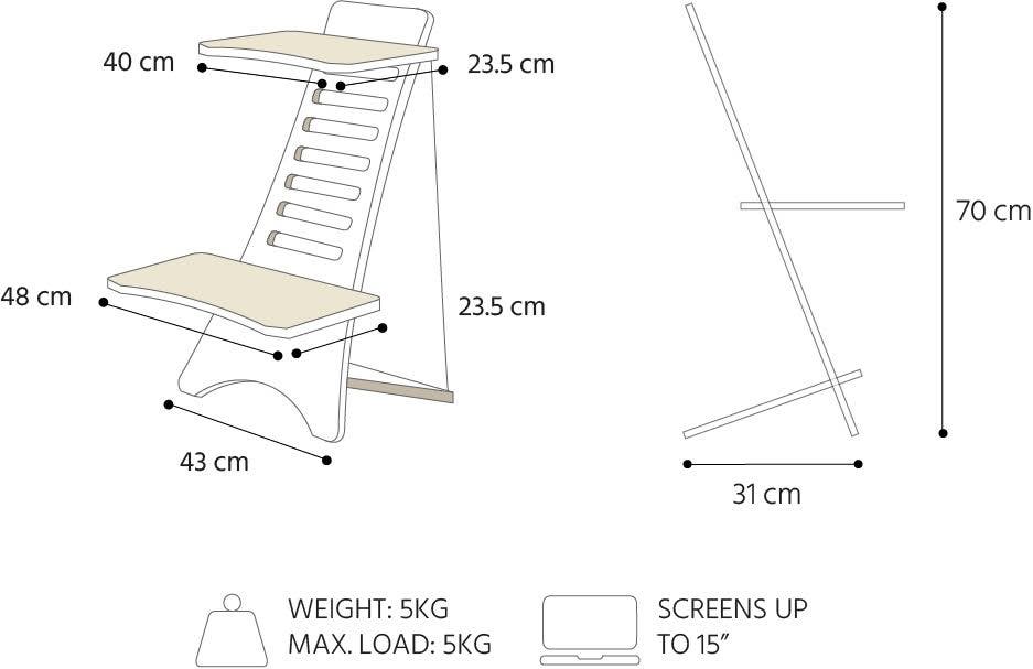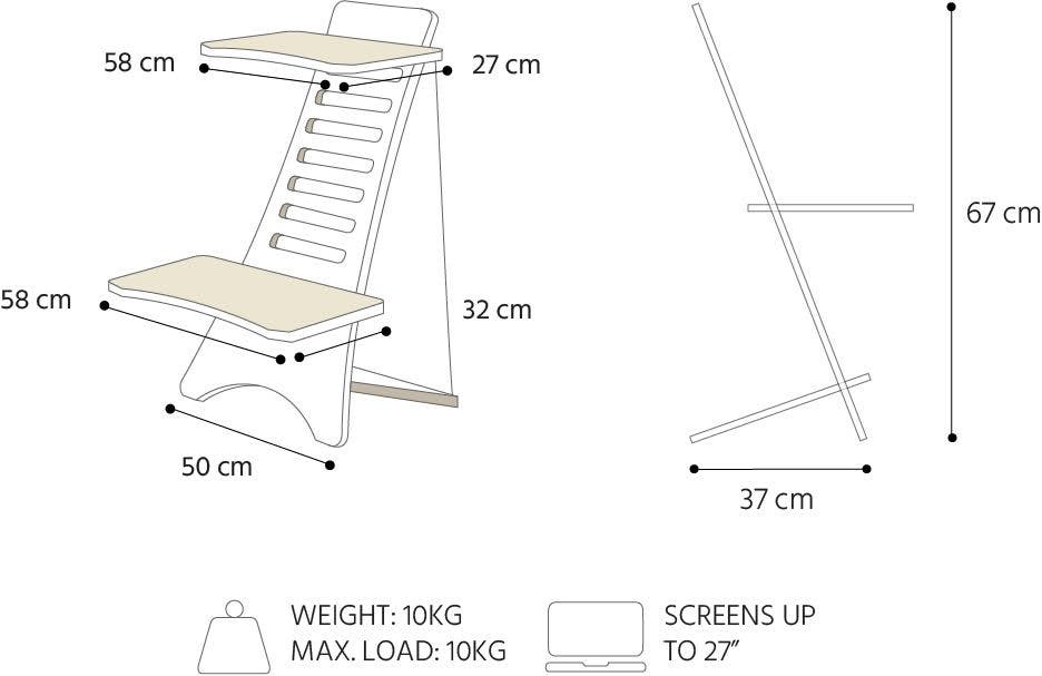 Diese funktionieren wie ein kleines Regal, dass auf den Schreibtisch gestellt wird und auf dem unteren Brett die Tastatur und Maus oder ein Trackpad auf nehmen, auf dem oberen Brett den Laptop oder Monitor. Damit ist der Bildschirm beim Stehen auf Kopfhöhe, während die Eingabegeräte so platziert sind, dass die Arme einen rechten Winkel bilden. Dies stellt anscheinend die ergonomisch sinnvollste Lösung zum Arbeiten an Rechnern dar. Natürlich lässt sich auch auf das obere Brett ein Monitor und auf das untere der Laptop stellen, so dass dessen Eingabemöglichkeiten benutzt werden können.