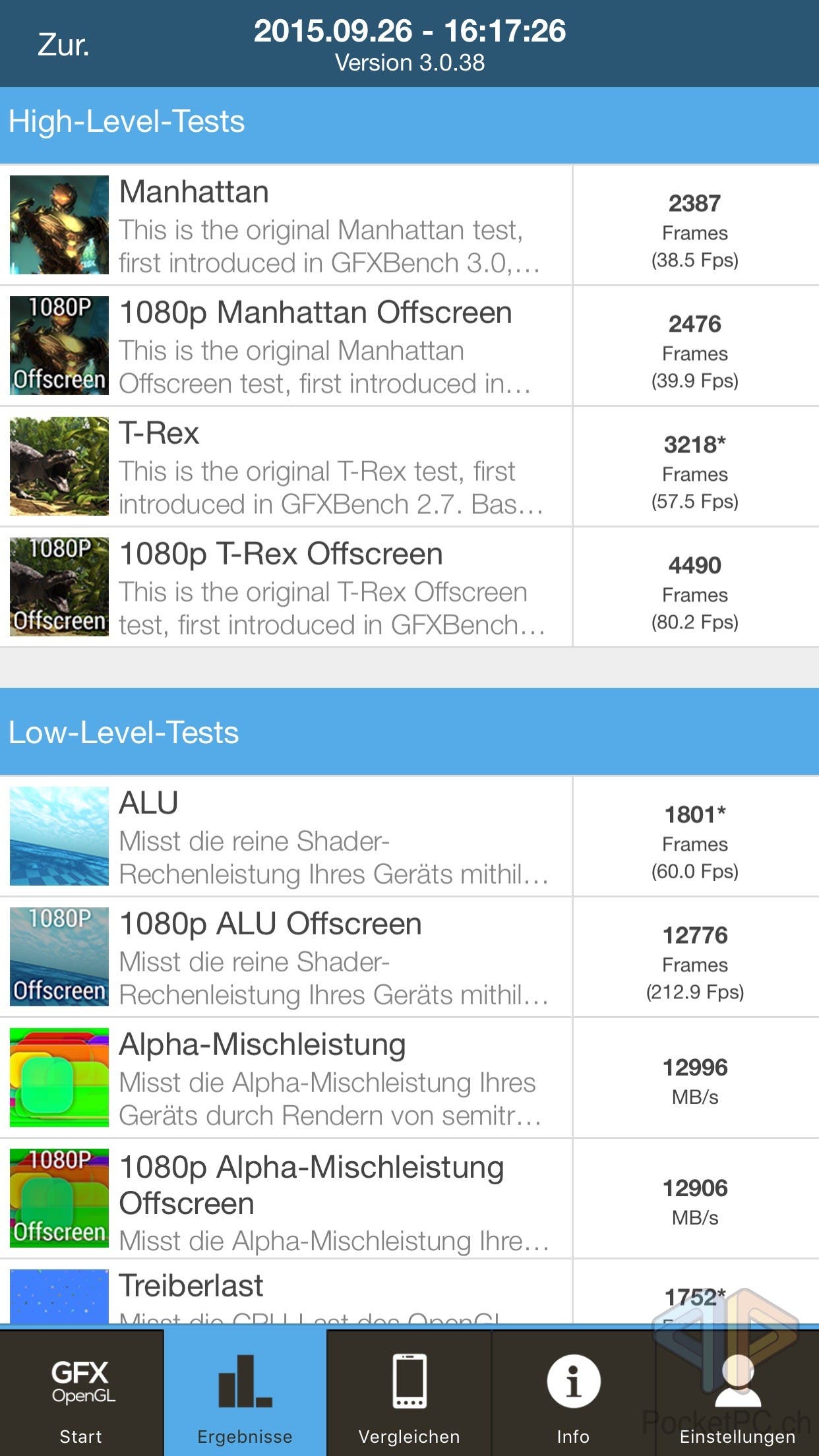 Auch die neue GPU im Apple A9 SoC weiss durchgehend zu überzeugen. Selbst die intensivsten Grafikkracher im App Store zaubern der Grafikleistung des SoCs nur ein müdes Lächeln auf die Polygon-Lippen. Apple selbst gab in der Präsentation an, rund 90 Prozent mehr Leistung aus der GPU raus holen zu können, als im Vorgängermodell. Das erreicht der Chip in den synthetischen Benchmarks allerdings (noch) nicht. Hier liegt der Performance-Sprung zwischen 50 und 70 Prozent, je nach Anwendung und Aufgabengebiet. Es wird allerdings wohl noch etwas dauern, bis die meisten Spiele und Benchmarks im App Store auf die neue (noch) unbenannte GPU zugeschnitten sind und das volle Leistungspotenzial ausschöpfen können.