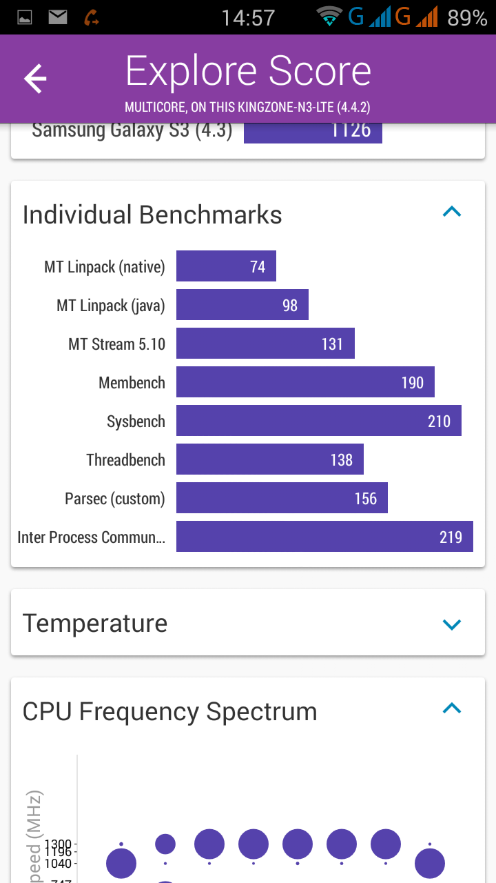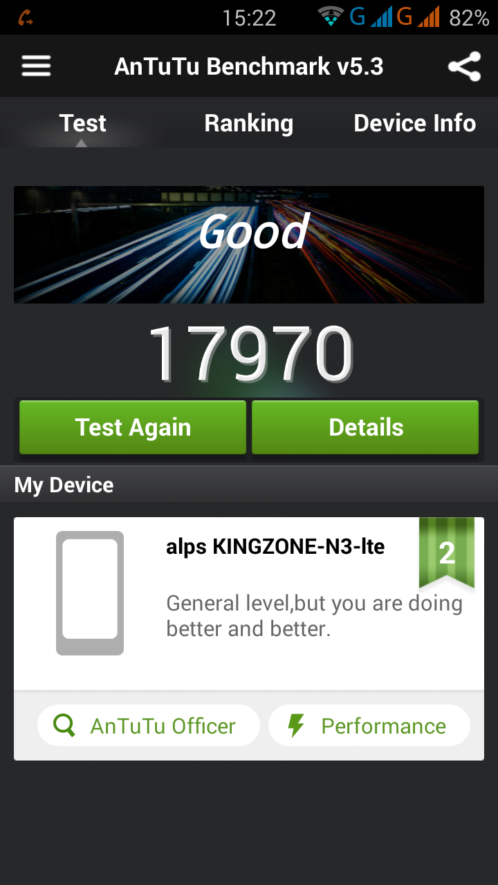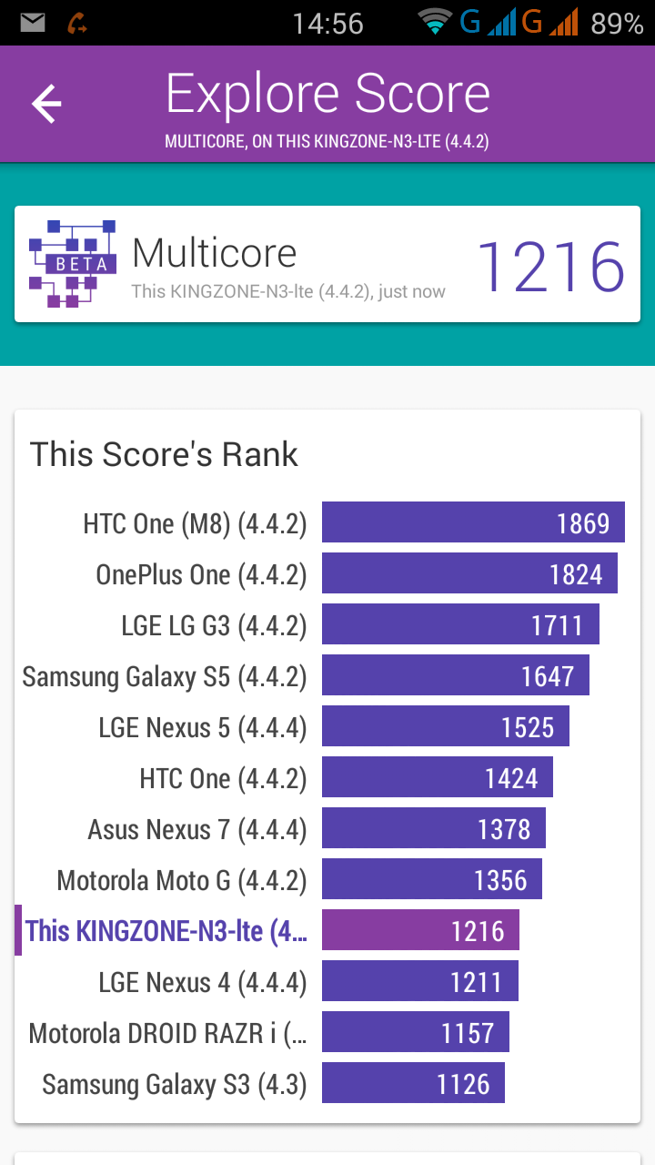 Kommen wir zum Herzen des Kingzone N3, der CPU. Verbaut wurde hier ein MT6582+6290 als Quad-Core mit je 1.3 GHz. Das bringt ordentlich Power und wäre fast perfekt, wenn nicht anstelle der 1GB eher 2GB RAM verbaut worden wären. So ist es schnell und alles läuft flüssig, aber es könnte unter Umständen doch an seine Grenzen stossen