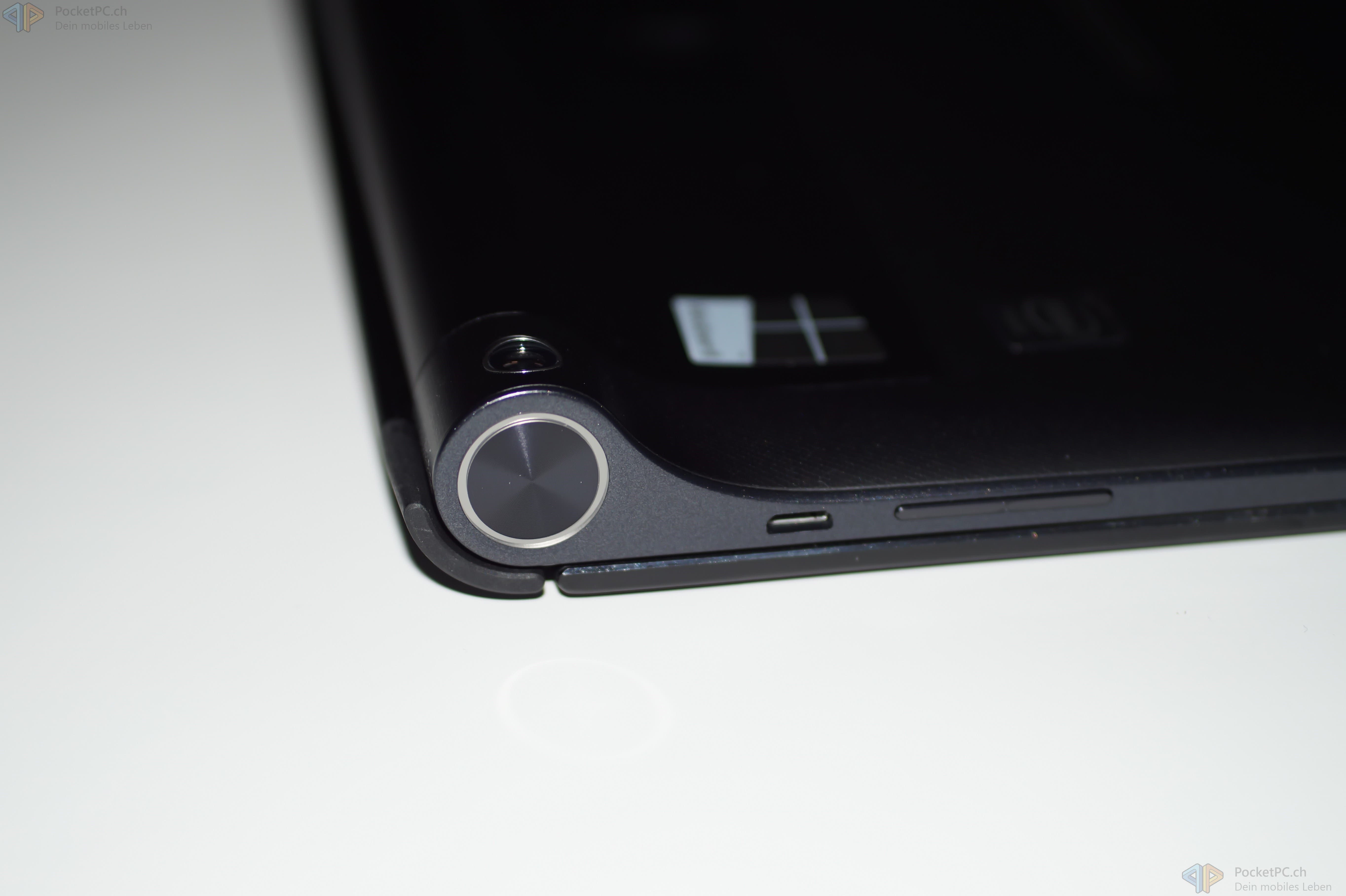 Die Draufsicht lässt unschwer erkennen, mittig liegt der Windows-Button am unteren Displayrand. Bei der 8 Zoll Version fehlt dieser und wird durch ein Bedienelement am linken Rand ersetzt. Die Frontkamera und einige der verbauten Sensoren findet man auf der linken Seite unter dem äusseren Displayglas.