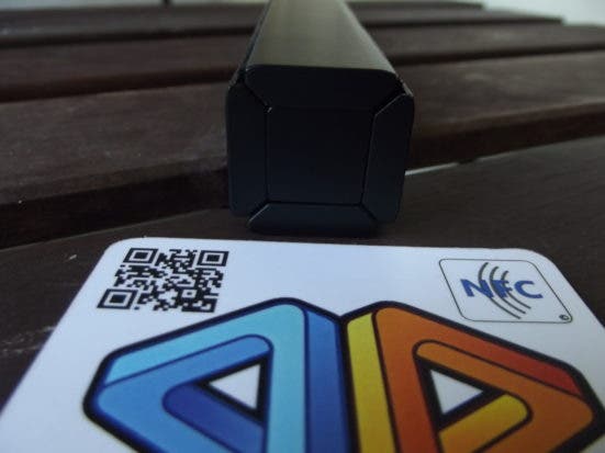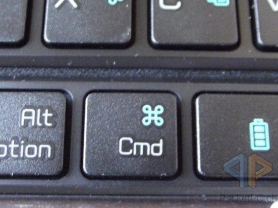Im viereckigen Kern des Keyboards selbst wird unter einer kleinen Klappe eine handelsübliche AAA-Batterie zur Stromversorgung verstaut, daneben sind zwei ausklappbare Ständer, die ein Smartphone- oder Tablet von bis zu 10 mm Tiefe in einer fixen Schräglage aufnehmen. Tablets können hierbei aufgrund des relativ hohen Gewichts nur im Querformat benutzt werden, da die Tastatur selbst zu wenig Gegengewicht bietet und somit kippen würde. Auch Smartphones müssen jedoch querformatig aufgestellt werden, da die Halterung ganze 8.5 cm ausseinander steht.