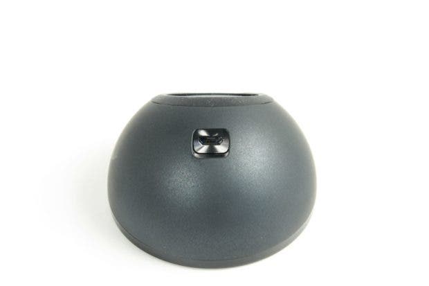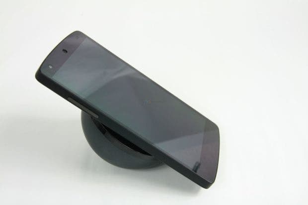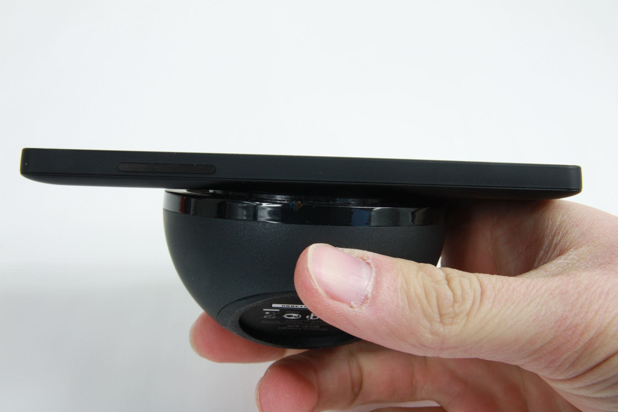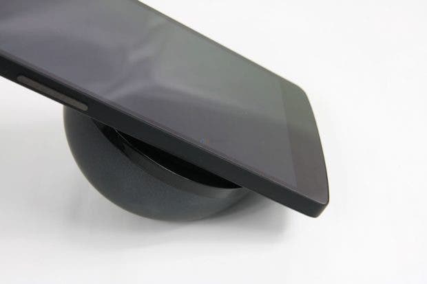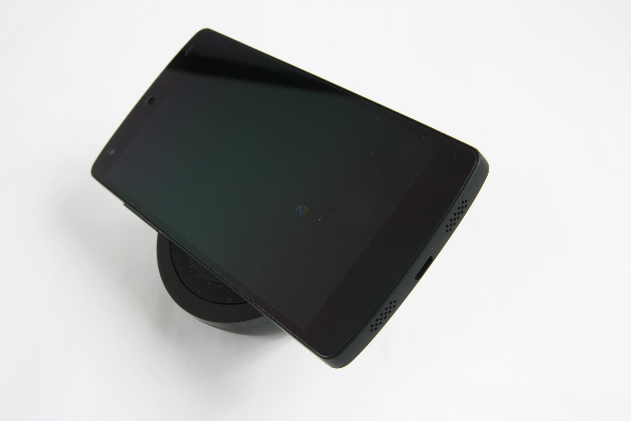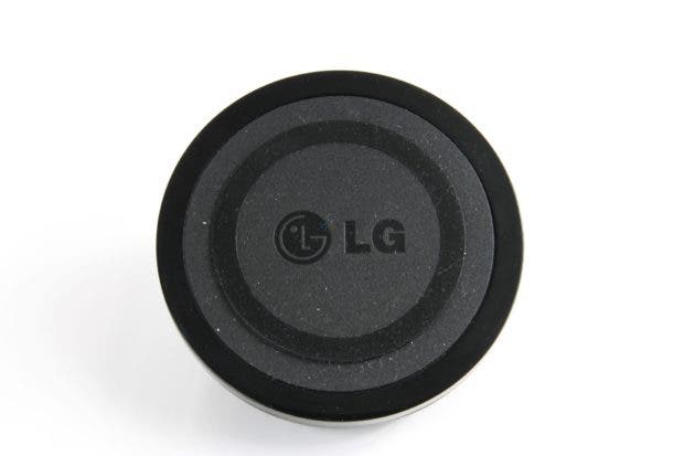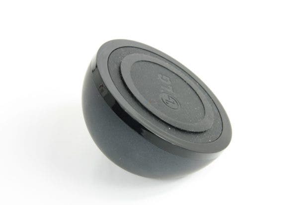 Die Oberseite besteht aus einem mit einer Art Klavierlack beschichtetem Kunstoffring, danach folgt eine weiche Gummieinlage. Dort aufgesetzt ein weiterer Ring der dem Material von KFZ-Handymatten ähnelt und das Handy dort haften bleibt. Im Innenren ist wieder die weiche Gummieinlage mit dem LG Logo zu sehen – übrigens ist der offizielle Nexus 4 Orb genau das gleiche Gerät, nur dass anstatt dem LG ein Nexus Logo angebracht wurde.