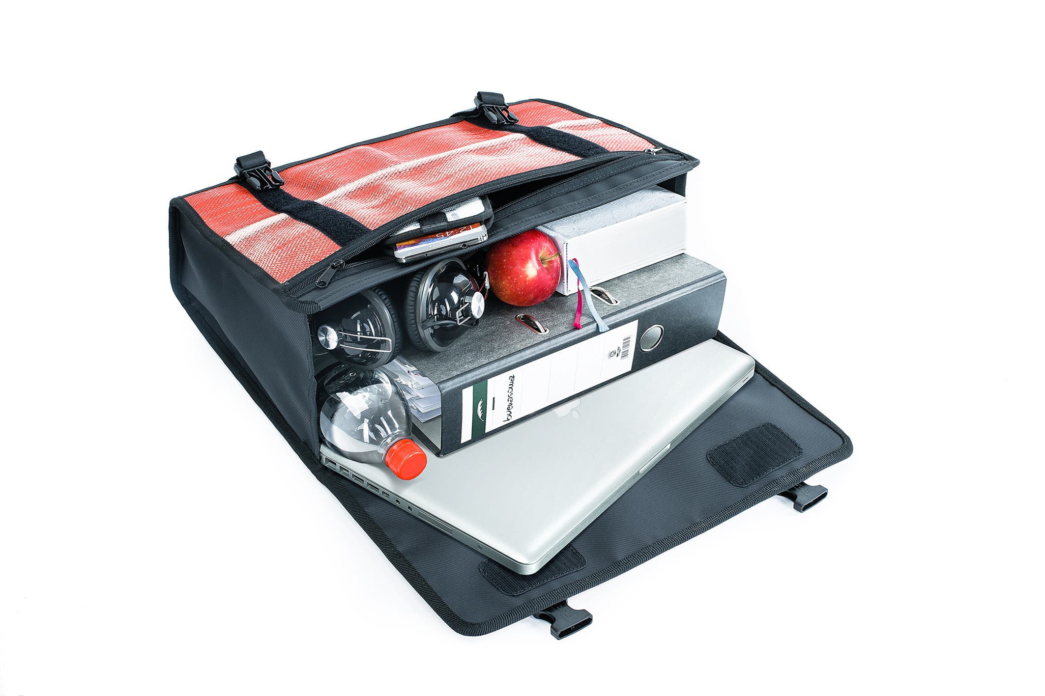 An der Vorderseite hat man über die ganze Breite eine Reissverschlusstasche mit zwei kleinen Taschen sowie drei Stiftlaschen und einen Schlüsselfinder. Innen befindet sich ein gepolstertes Laptopfach sowie ein grosses Fach. Auf der Vorderfront der Verschlusslasche ist noch eine kleine Reissverschlusstasche untergebracht. Somit hat man genügend Platz, um alles zu verstauen. Das einzige, was fehlt, ist ein Tragegriff, wie er an der Laptoptasche Scott angebracht ist.