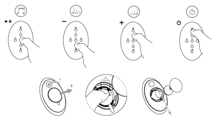 Die Bedienung der Lautsprecher erfolgt über die länglich bekannte “eiförmige” stylische Fernbedienung. Allerdings kann man die MM-1 auch direkt am Master-Lautsprecher bedienen. Auf der einen Seite finden sich am Aluminiumband die Laut-/Leise-Tasten (siehe auch erstes Bild). Auf der gegenüberliegenden Seite ist hingegen der An-/Aus-/Mute-Schalter angebracht. Auch den aktuellen Zustand der Computerlautsprecher kann man ablesen. Dazu wurde an der Frontseite eine farbige LED verbaut. Sie signalisiert mittels unterschiedlicher Farben und Blinkmuster den Zustand der Lautsprecher. Rot bedeutet ausgeschaltet während blau eingeschaltete Lautsprecher signalisiert. Blinkt die LED blau, so wurden die Lautsprecher auf Mute gestellt. Es gibt noch weitere Farben und Muster, die weitere Bedeutungen hat. Für die normale Nutzung sind aber die beiden obigen Farben massgeblich.