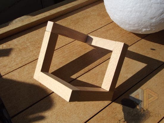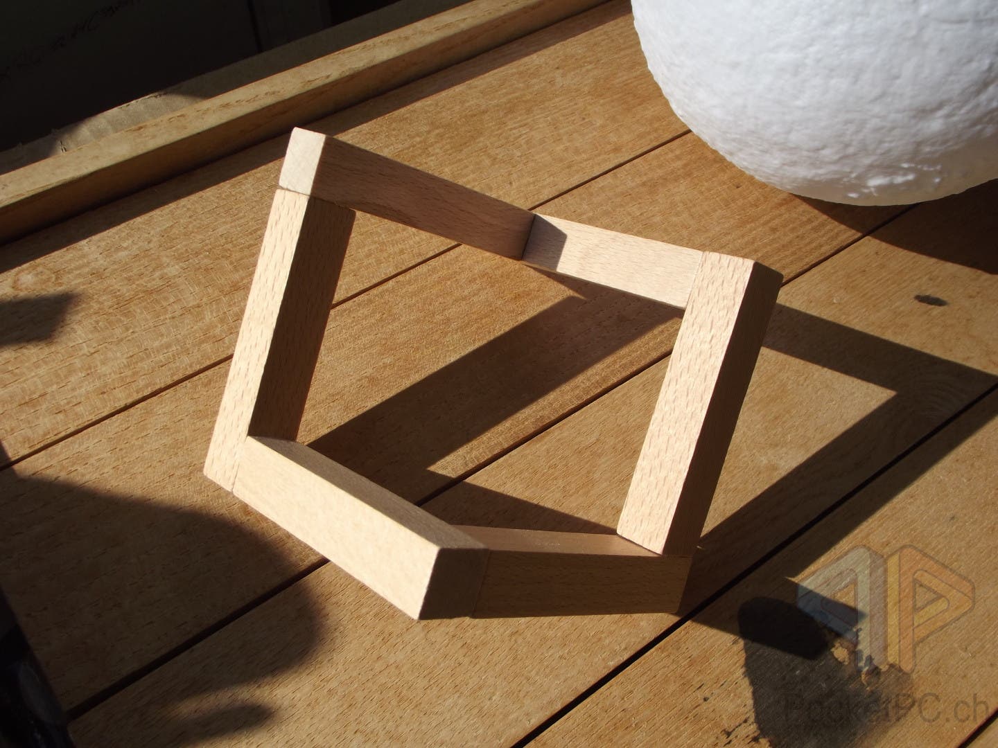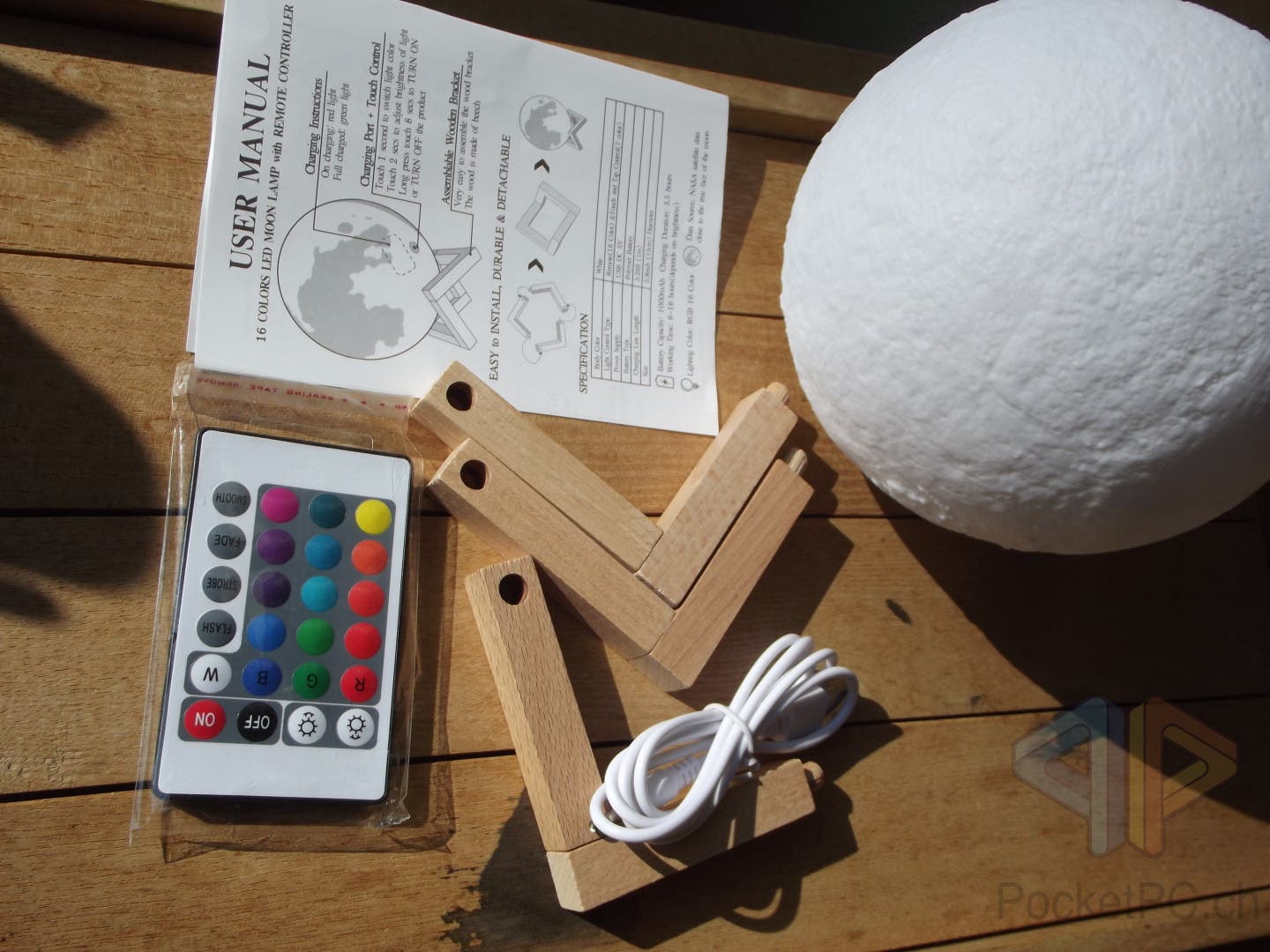 Die kugelförmige Lampe wird geliefert mit einem Ständer aus drei hölzernen Winkeln, die zusammengesteckt werden. Hinzu kommt eine englische und chinesische Kuranleitung, ein 1 m langes USB-Kabel zum Aufladen eingebauten Akkus sowie eine Infrarot-Fernbedienung mit 24 Tasten.