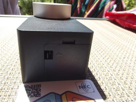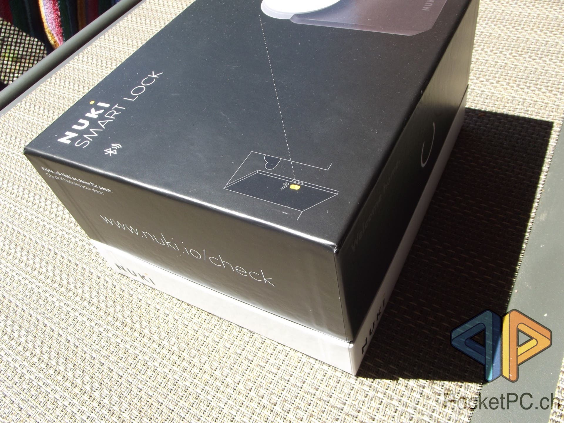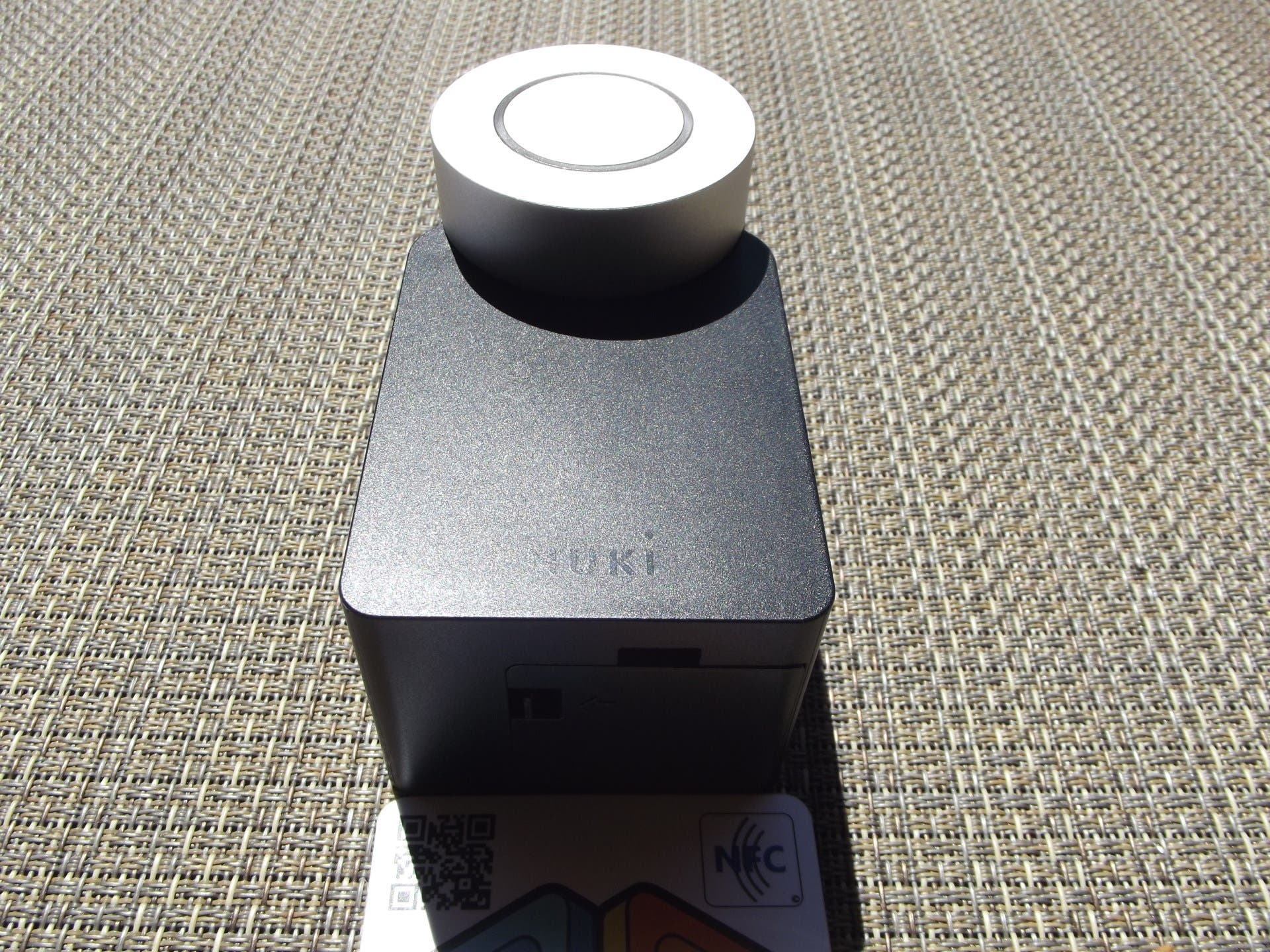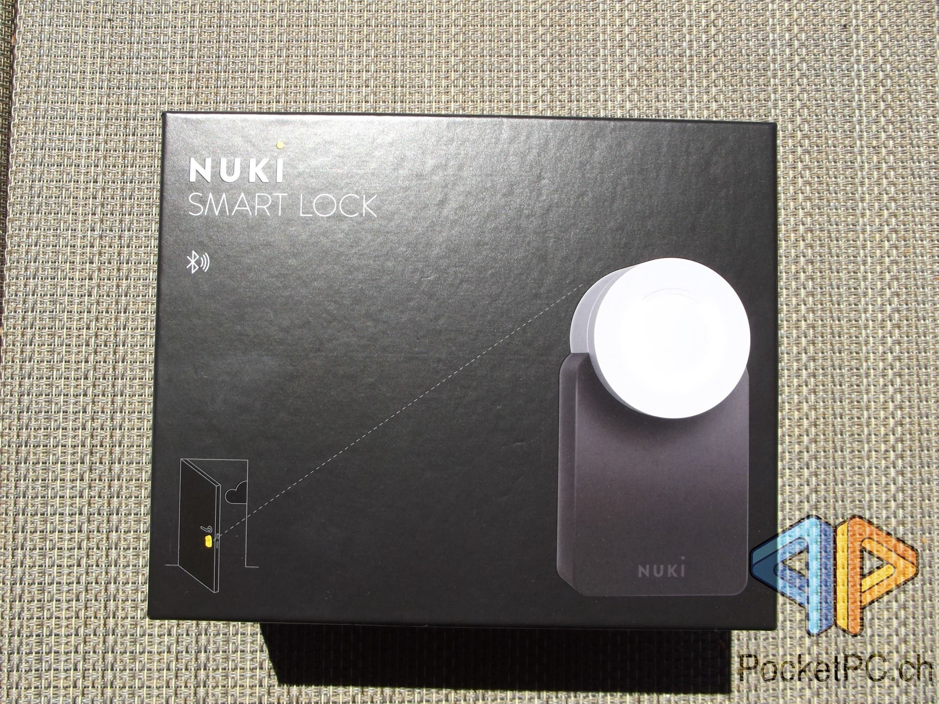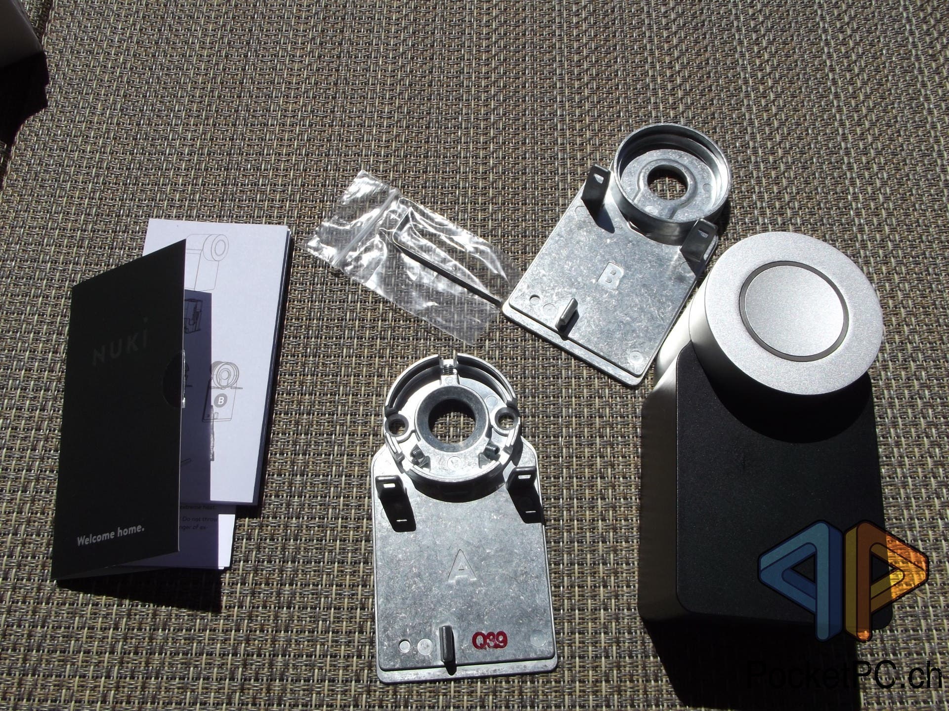 Das Gerät ist 110 x 60 x 60 mm gross und wiegt 460 Gramm. Es besteht aus einem schwarzen, rechteckigen Teil und einem silberfarbigem Zylinder, in dessen Mitte eine grosse, kreisförmige Taste mit einem LED-Ring darum zu finden ist. Das Nuki wird geliefert mit zwei metallernen Adapterplatten, einer Kurzanleitung sowie einem kleinen Imbusschlüssel. Vier handelsübliche AA-Batterien sind ebenfalls vorhanden.