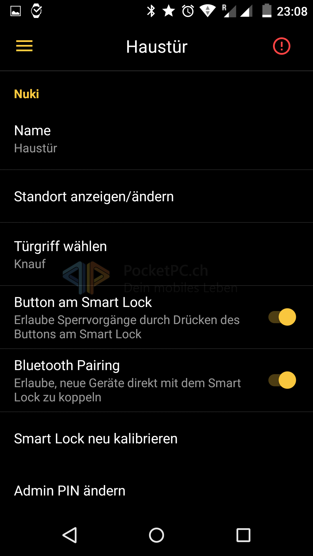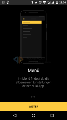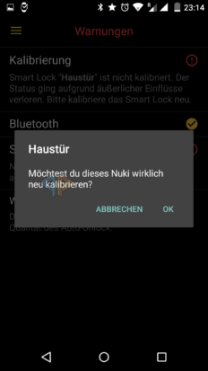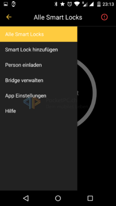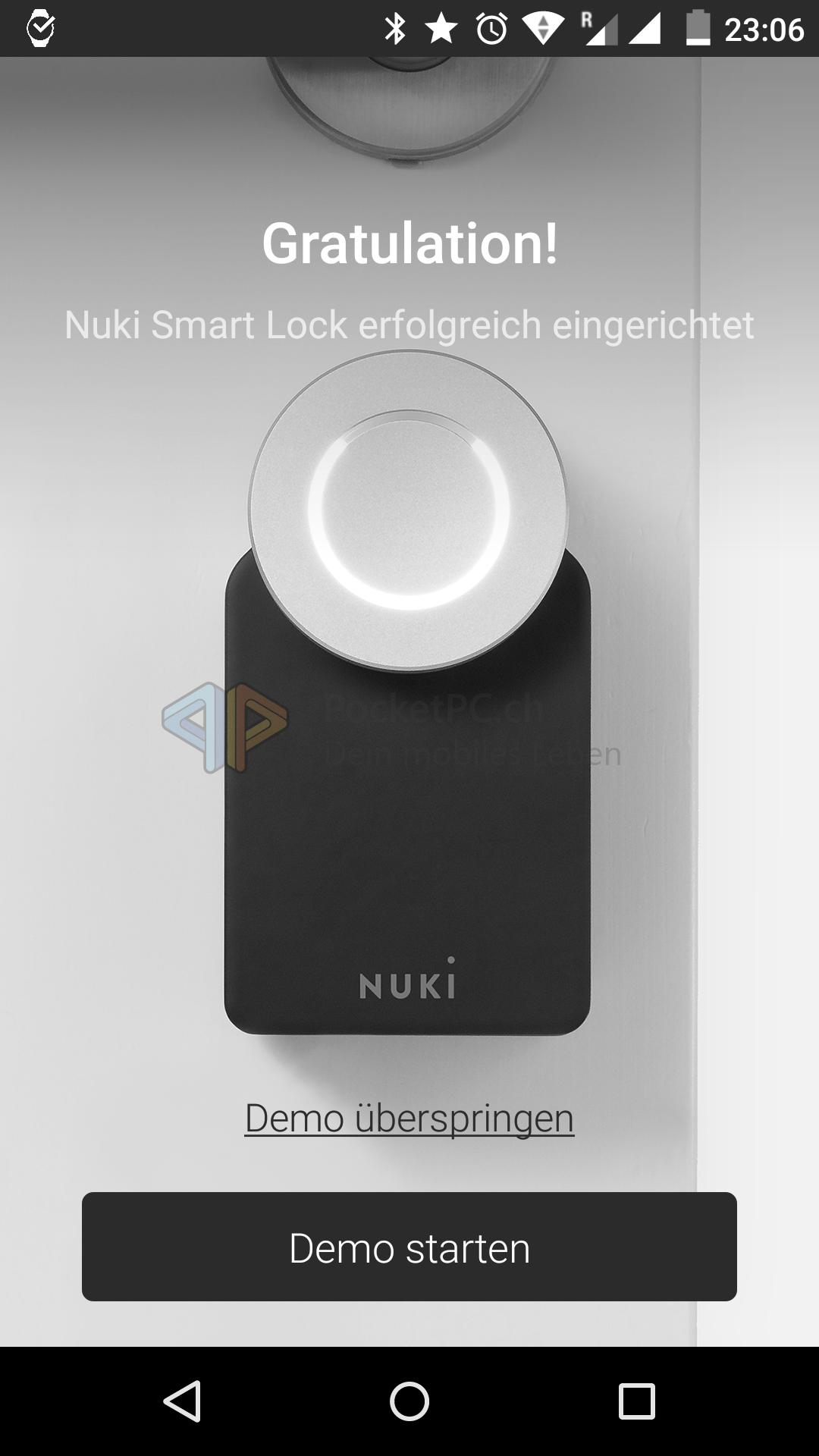 Nunmehr kann die Tür geöffnet werden, indem entweder in der App der entsprechende Button gedrückt wird, oder aber, wenn so konfiguriert, das Handy sich weit genug entfernt bzw. in Reichweite gelangt, sprich man die Wohnung verlässt oder betreten will. Alternativ kann auch die kreisförmige Taste am Nuki gedrückt werden oder aber der Nuki Fob als optionales Zubehör benutzt werden. Letzteres ist ein kleiner Bluetooth-Schlüsselanhänger mit Knopfzelle, mit dem das Nuki Smart Lock ebenfalls geöffnet und geschlossen werden kann. Auch gibt es noch mit der Nuki Bridge die Möglichkeit, das Schliesssystem per Internet fernzusteuern oder in die eigene Smart Home-Lösung zu integrieren. Hierzu gibt es ein gleichnamiges Zubehör-Gerät von Nuki oder aber die Option, ein altes Android-Smartphone als Bridge zu konfigurieren. Die App war bis zum Marktstart alleinig für Kickstarter-Backer verfügbar, nun aber im Play Store zum kostenlosen Download.
