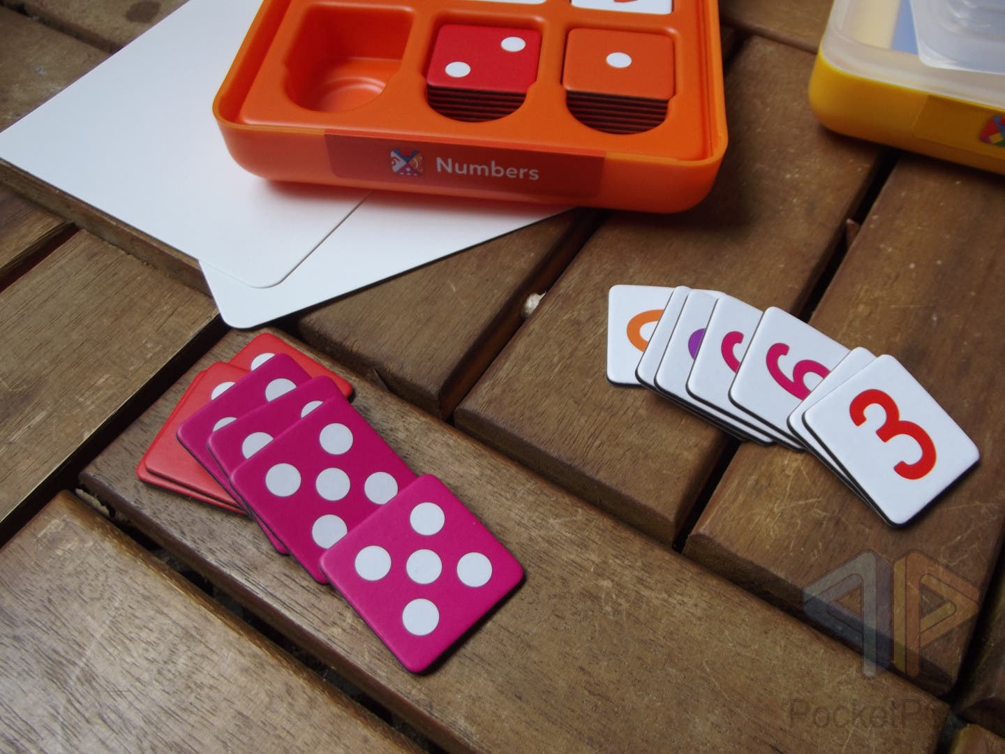 Weiter sind die Spielelemente des Osmo Starter Kits sind in drei stapelbaren Kunststoffboxen untergebracht. Es handelt sich dabei um die klassischen sieben Tangram-Teile, 40 Zahlenplättchen sowie 72 Buchstabenplättchen für Deutsch(mit Eszett), Englisch und Französisch (mit accent aigu, grave und circonflexe). Diese werden durch die Kamera des iPads erkannt, weswegen der Reflektor diese Umleitet auf den Bereich direkt vor dem iPad.