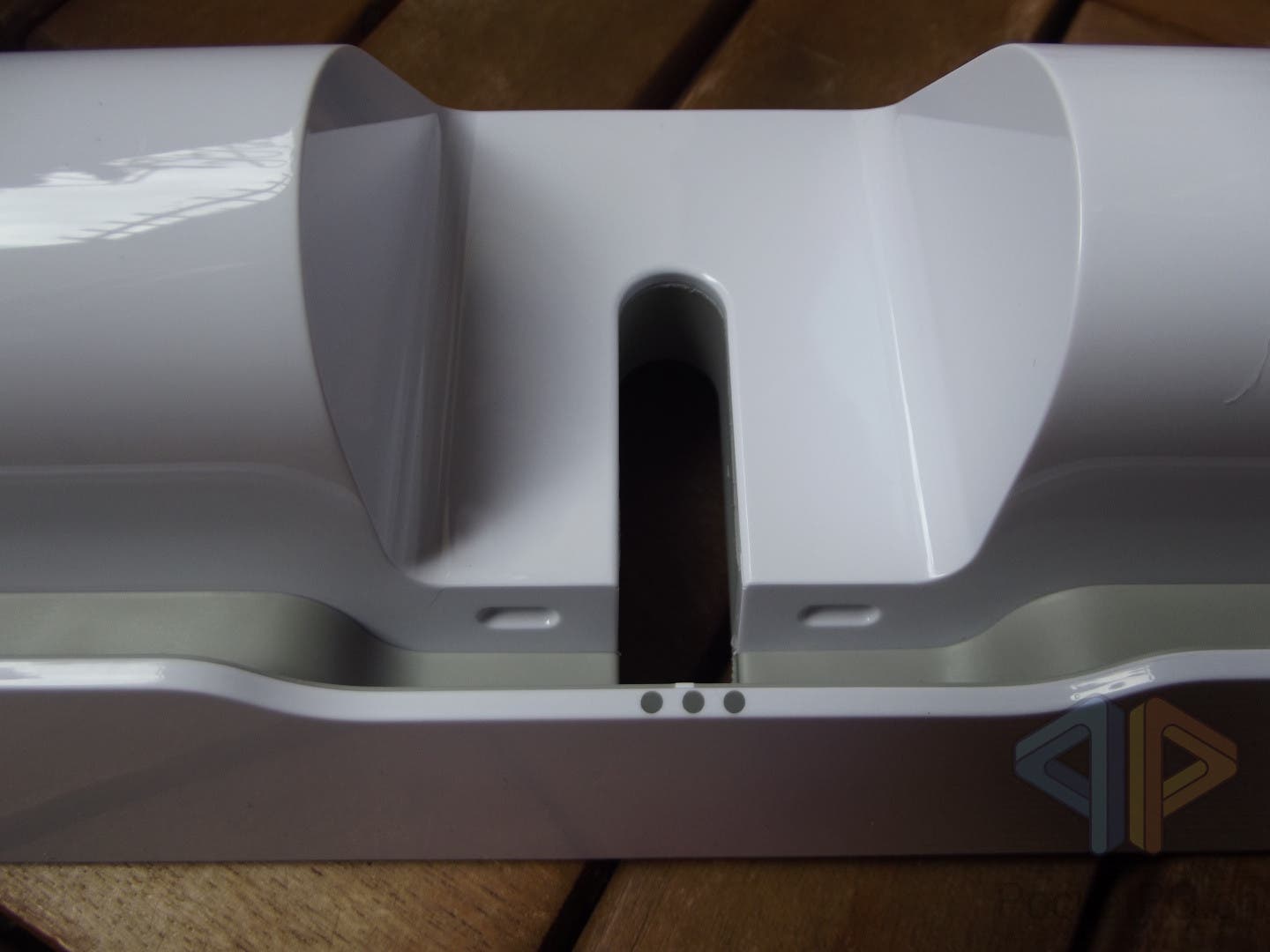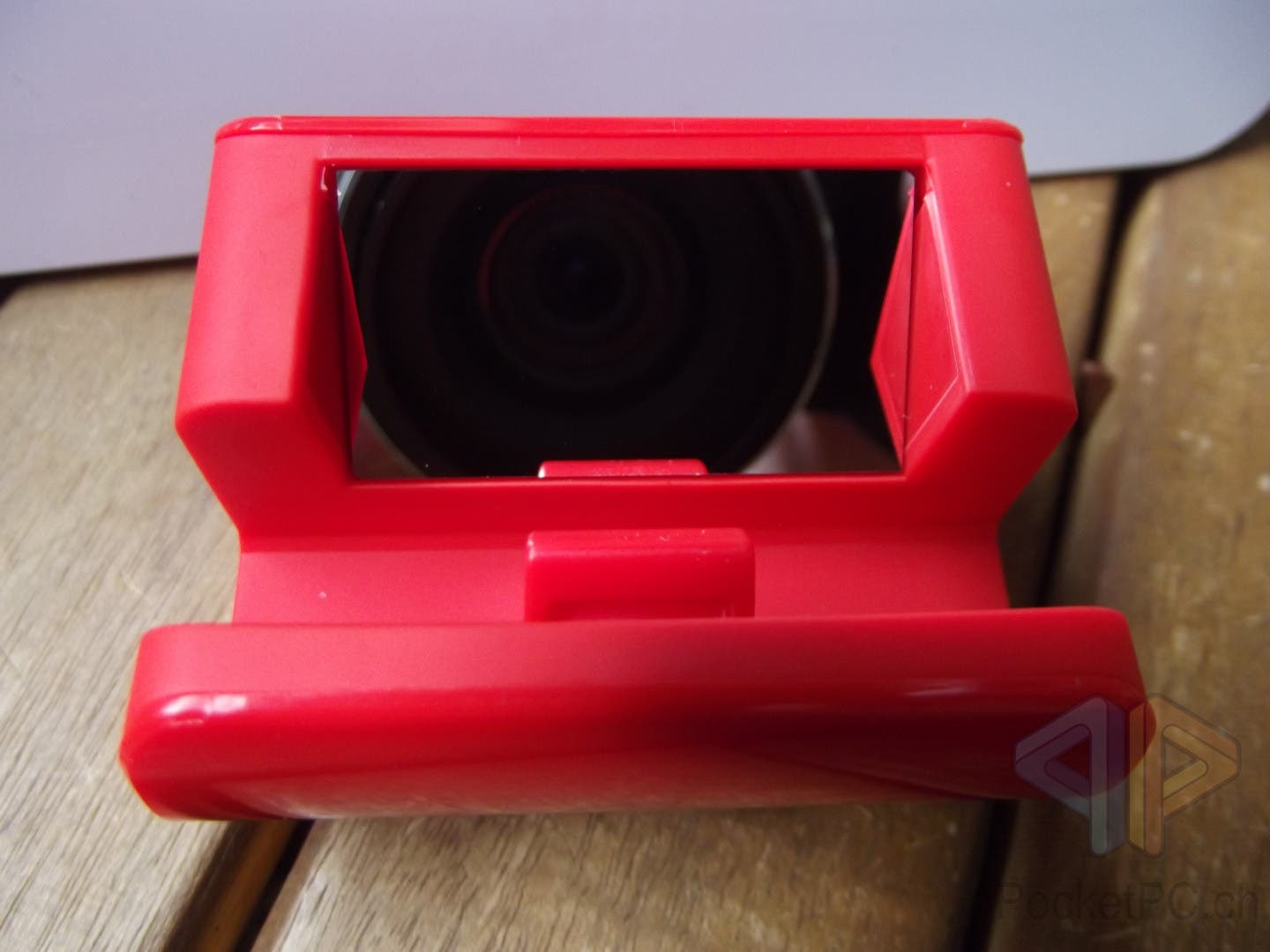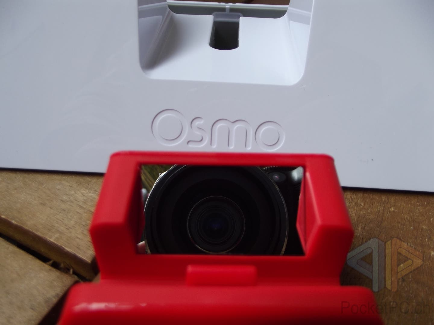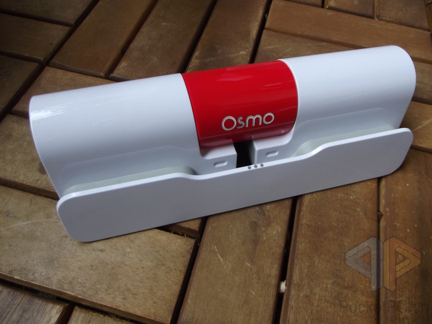 Im Osmo Genius Starter-Kit ist zunächst eine V-förmige Basis aus Kunststoff mit gummiertem Einsatz, in den das iPad gestellt wird. Zudem ist ein roter Reflektor-Aufsatz mit Spiegel enthalten, das oben auf den Rand des Tablets gesetzt wird. Damit blickt die Kamera nicht mehr nach vorne sondern nach unten. Zur Aufbewahrung kann der Reflektor direkt in die Basis gesteckt werden und hält dort magnetisch.