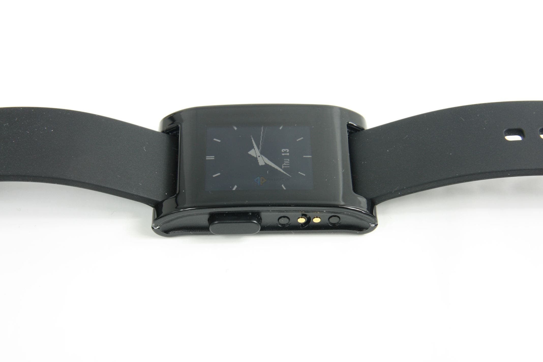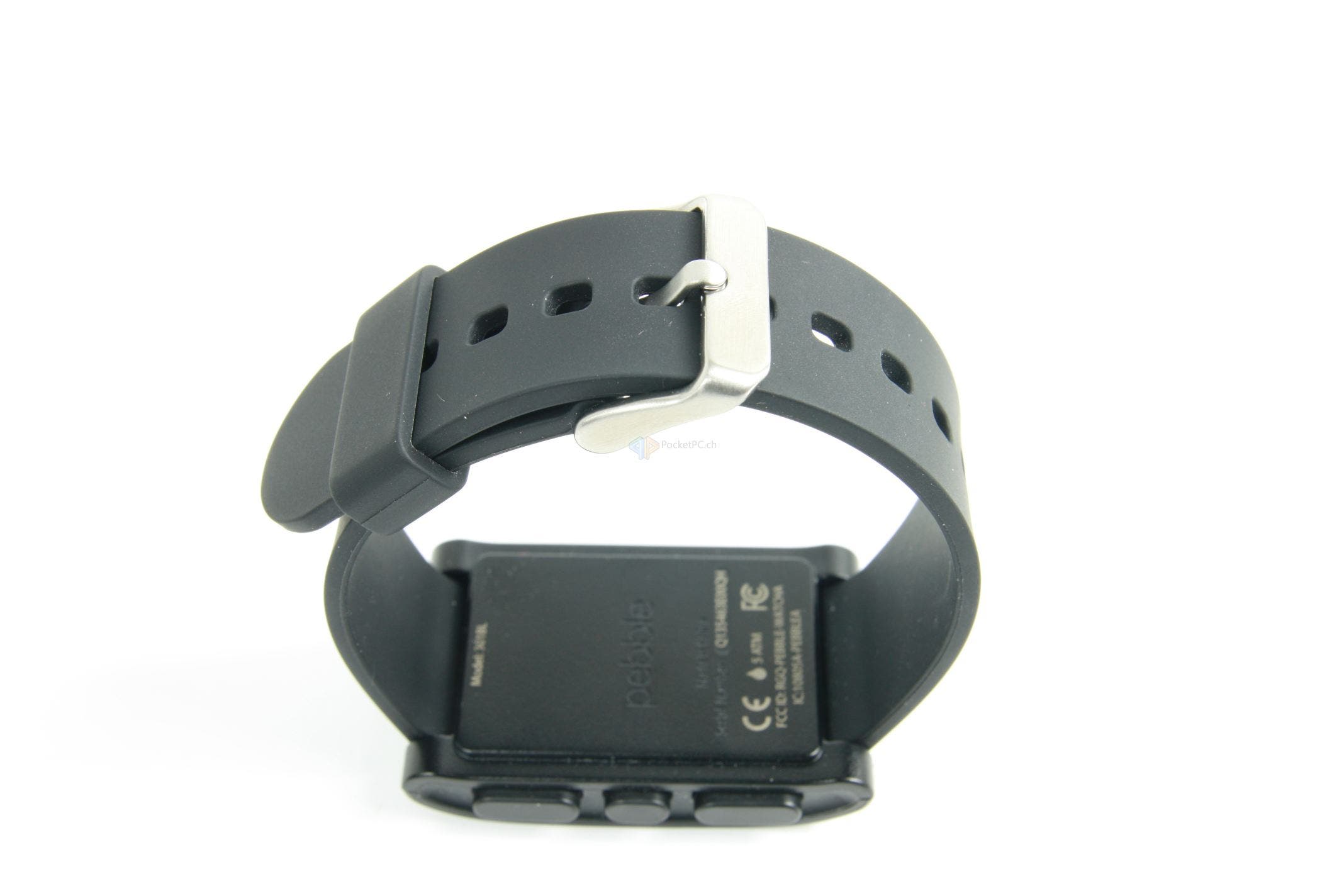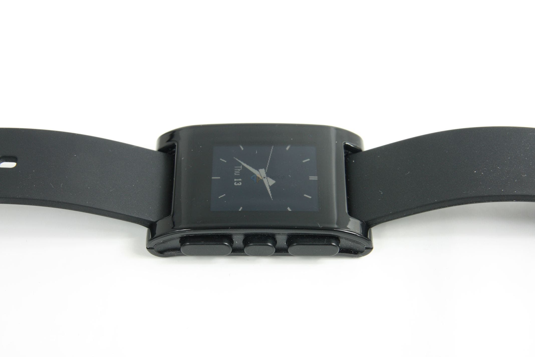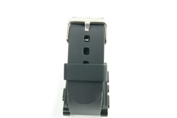 Der erste Eindruck ist in Ordnung. Was bedeutet das? Wir haben hier ausschliesslich Plastik verarbeitet, was nicht billig, aber auch nicht wirklich sonderlich hochwertig wirkt. Das Kautschukarmband tut sein Übriges dazu, für den Preis hätte man mehr erwarten können. Wahrscheinlich hat die Entwicklerfirma genau aus dem Grund den nächsten Schritt mit der Pebble Steel eingeleitet und hochwertigere Materialien verbaut. Fasst man die Uhr aber an und betätigt die Knöpfe, verfliegt der erste, mässige, Eindruck wieder. Hier wackelt nichts, die Tasten haben einen guten Druckpunkt und das Armband lässt sich sauber an- und ablegen.