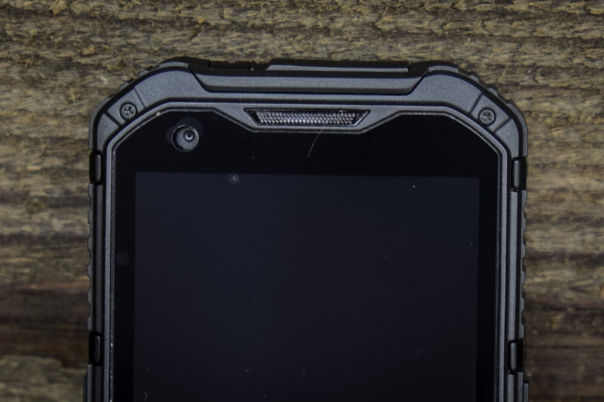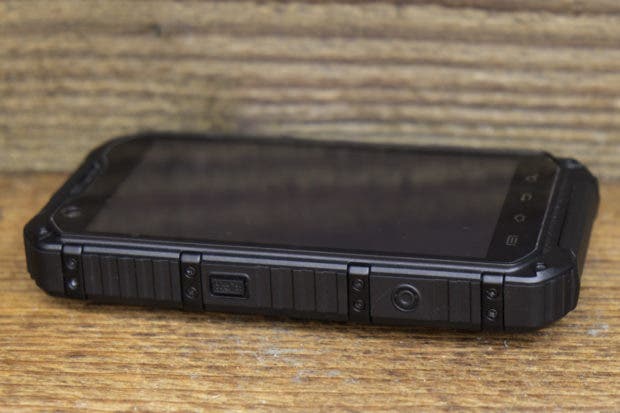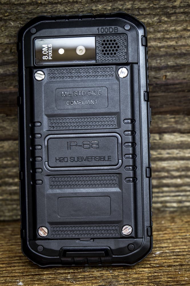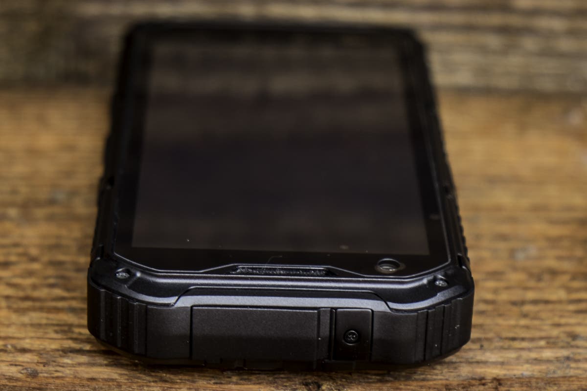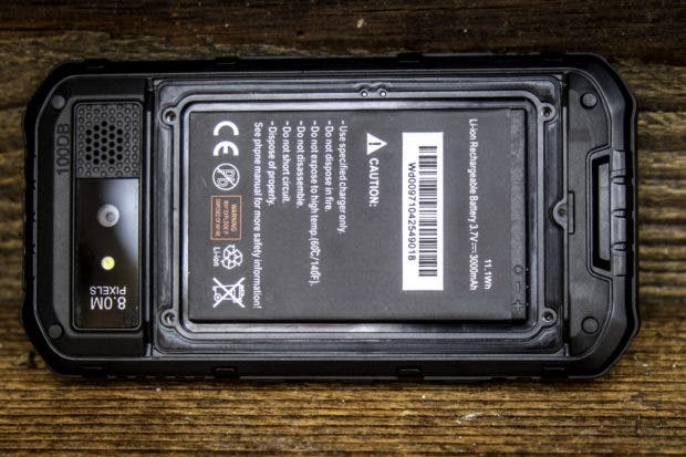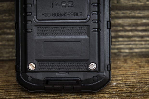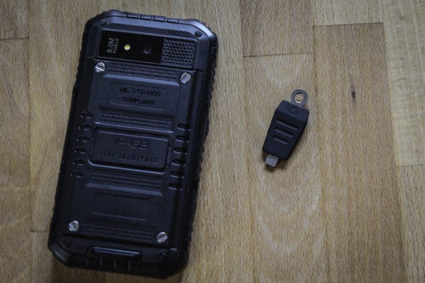 Die Akkuabdeckung auf der Rückseite muss mit vier Schrauben recht mühsam auf- und zugeschraubt werden. Das “mühsam” verspricht aber eben auch Dichtigkeit. Weiter befindet sich auf der Rückseite die Kamera mit LED-Licht und eine fast schon riesige Öffnung für den Lautsprecher An der linken Seite befinden sich der Powerbutton und ein “ominöser” Knopf. Dieser “ominöse” Button ist nirgends richtig erklärt. Er ist zwar nicht so markant wie die anderen, führt aber zum sofortigen Ausschalten des Gerätes, wofür auch immer. Die rechte Seite ist mit den Volumebuttons und einen extra Button für die Kamera bestückt. Die Unterseite des Gerätes bleibt leer und auf der Oberseite finden wir eine Lasche, unter der sich der USB- und Klinkenanschluss befindet. Das Material ist überall dickes Plastik, bzw. an den Rändern fester Gummi, welcher die Fallenergie gut resorbiert.