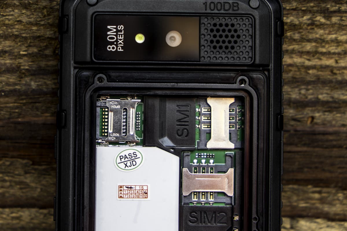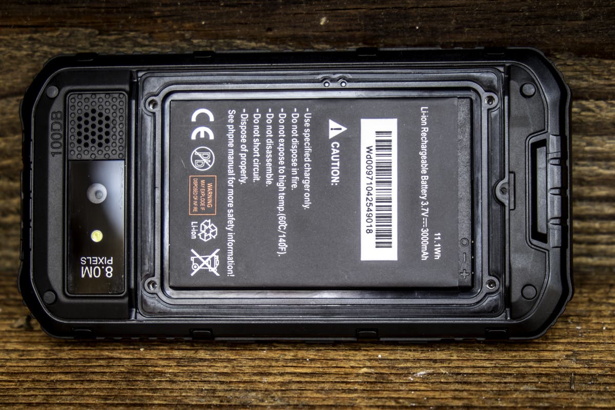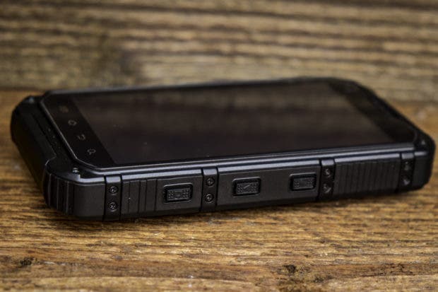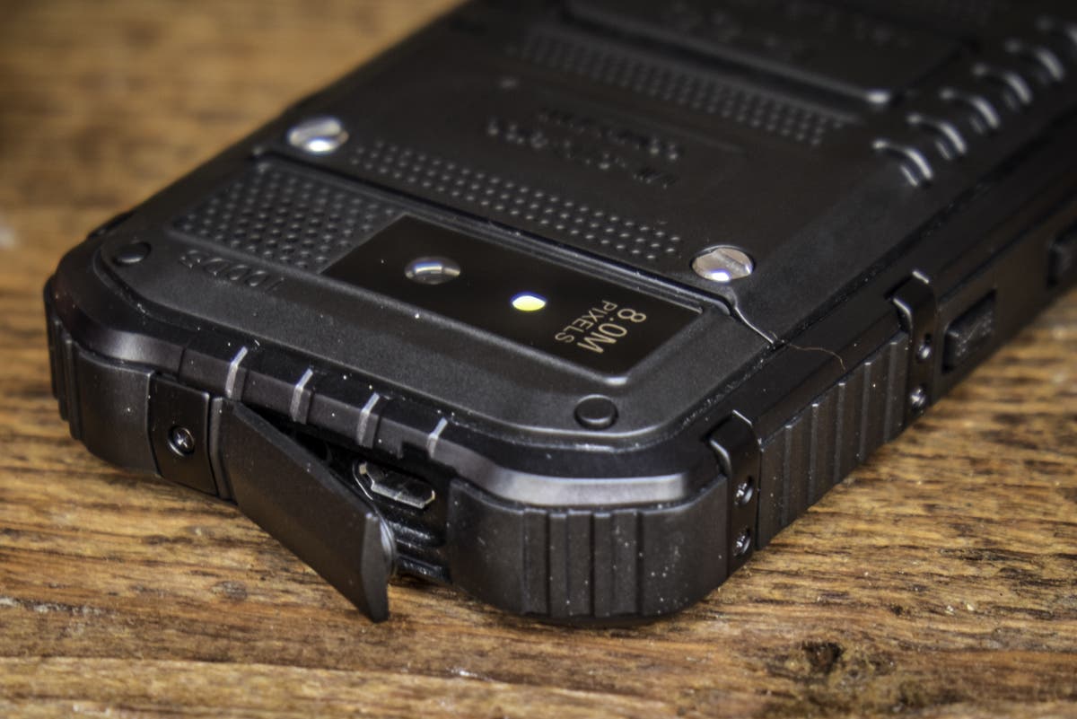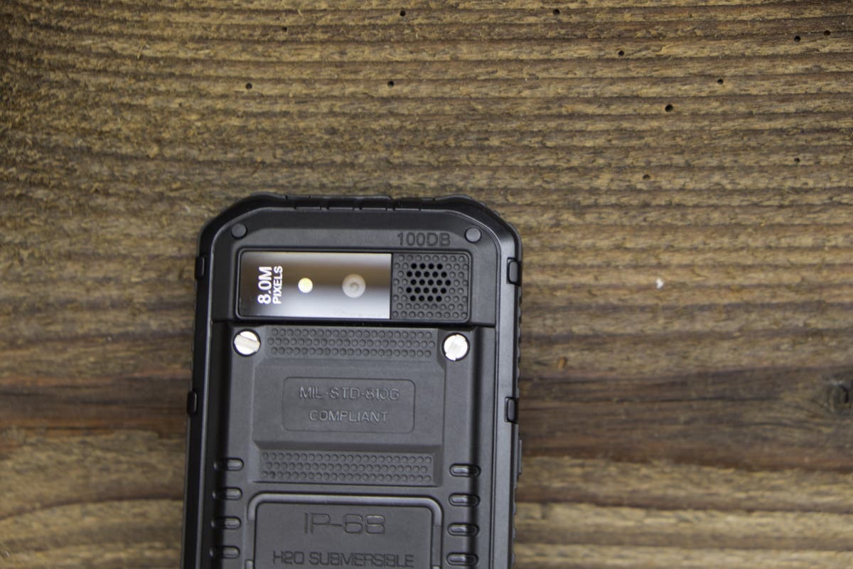 Die Akkuabdeckung auf der Rückseite muss mit vier Schrauben recht mühsam auf- und zugeschraubt werden. Das “mühsam” verspricht aber eben auch Dichtigkeit. Weiter befindet sich auf der Rückseite die Kamera mit LED-Licht und eine fast schon riesige Öffnung für den Lautsprecher An der linken Seite befinden sich der Powerbutton und ein “ominöser” Knopf. Dieser “ominöse” Button ist nirgends richtig erklärt. Er ist zwar nicht so markant wie die anderen, führt aber zum sofortigen Ausschalten des Gerätes, wofür auch immer. Die rechte Seite ist mit den Volumebuttons und einen extra Button für die Kamera bestückt. Die Unterseite des Gerätes bleibt leer und auf der Oberseite finden wir eine Lasche, unter der sich der USB- und Klinkenanschluss befindet. Das Material ist überall dickes Plastik, bzw. an den Rändern fester Gummi, welcher die Fallenergie gut resorbiert.