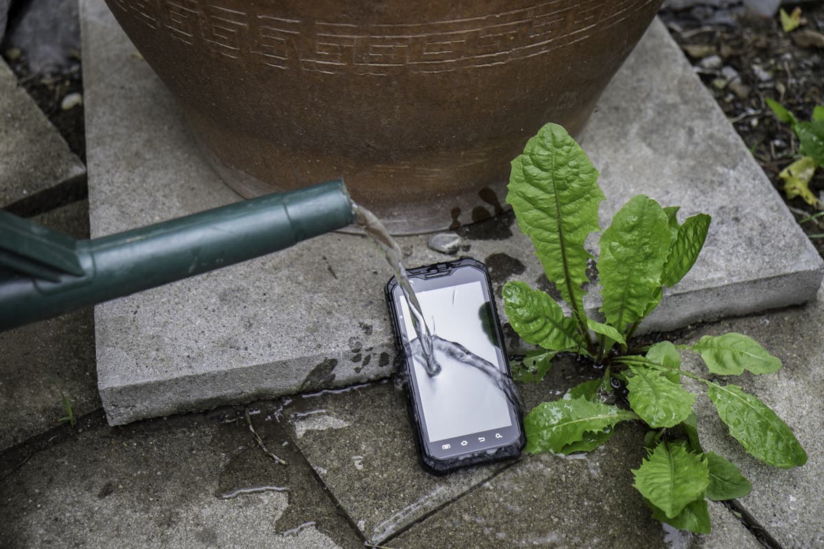 Im Test wurde das Gerät flott vom Tisch gewischt, so dass es im hohen Bogen auf den Boden flog, es wurde aus der Tasche fallen gelassen und gebadet. Nichts davon führte zu irgendwelchen Schäden. Auf “Droptests”, wie man sie von vielen Geräten auf Youtube findet, wurde bewusst verzichtet, denn ab irgendeiner Höhe oder Belastung bekommt man alles kaputt. Das Gehäuse und das extra nochmals mit Plastik geschützte Display werden aber Stürze aus bis zu zwei Metern Höhe aushalten. Beim Wassertest wurde zusätzlich noch Spülmittel ins Wasser gekippt, um die Oberflächenspannung zu minimieren und den Test dadurch zu verschärfen.