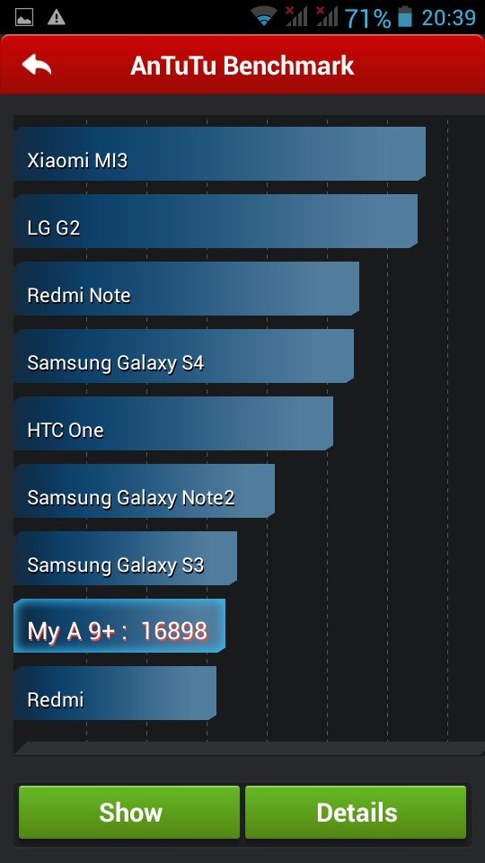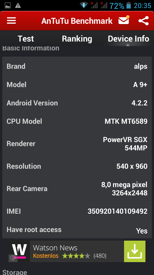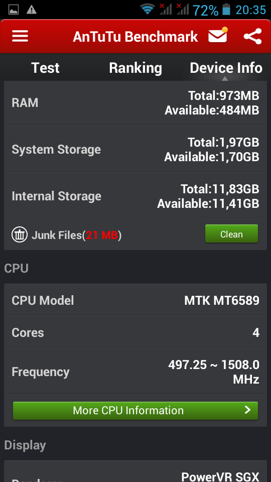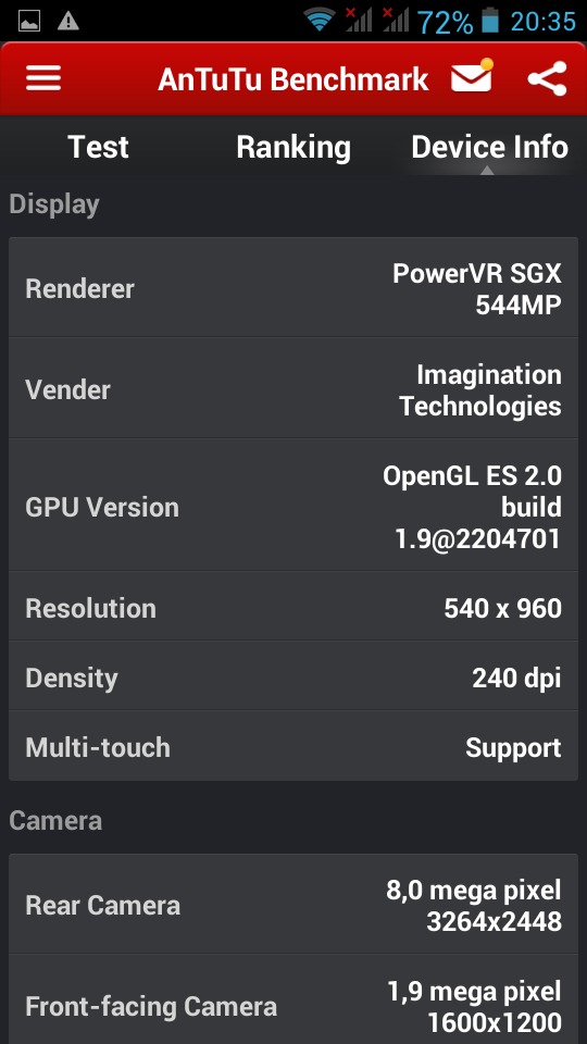 Das Herz des Gerätes ist ein Prozessor von Mediatek, der MT6589T. Das “T” steht dabei für Turbo und meint die höchste Leistung dieser zwei Jahre alten Prozessortechnik. Der Prozessor hat vier Kerne auf Cortex A7 Basis und taktet mit je 1.5 GHz. Begleitet wird der Prozessor von einer PowerVR SGX544 GPU (Grafikkarte). Diese stammt aus dem ersten Quartal 2013 und entspricht der Leistungsklasse eines Samsung Galaxy S4.
