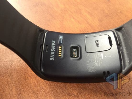 Am unteren Ende des Displays befindet sich der Home-Button, der in einem für Samsung typischen Design gehalten ist. Rechts und links daneben befinden sich zwei kleine Sensoren, einer für die UV-Messung und einer für die automatische Einstellung der Bildschirmhelligkeit. Auf der Unterseite befinden sich der SIM-Kartenslot, das Fenster für den Pulsmesser sowie der Akkuladeanschluss.