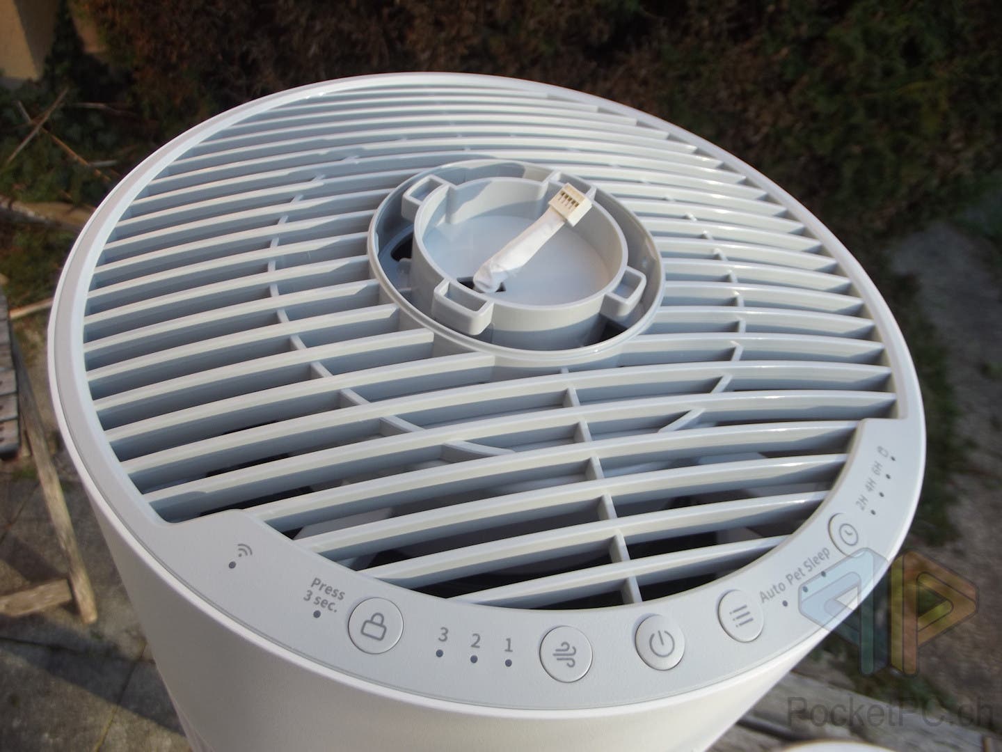 Das Bedienfeld ist Halbkreis auf der Oberseite der Haupteinheit zu finden und in einem hellen Grauton gehalten. Neben einer Status-LED für die WLAN-Verbindung und einer LED zum Anzeigen der Tastensperre ist hier die Taste für die Tastensperre zu finden. Diese drückt man drei Sekunden zum Ein- und Ausschalten der Blockade. Daneben sind drei LED mit den Ziffern 3, 2 und 1 sowie eine Taste mit einem Wind-Symbol zu sehen. Diese steuert die manuelle Lüfterstärke in den drei Stufen die dann, wie soll es auch anders sein, mit den voran genannten LED angezeigt wird.