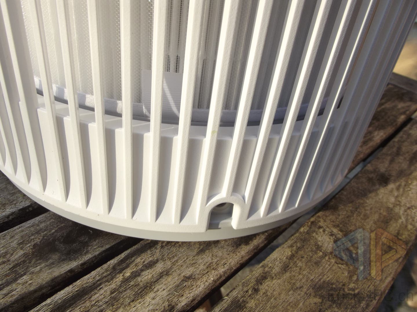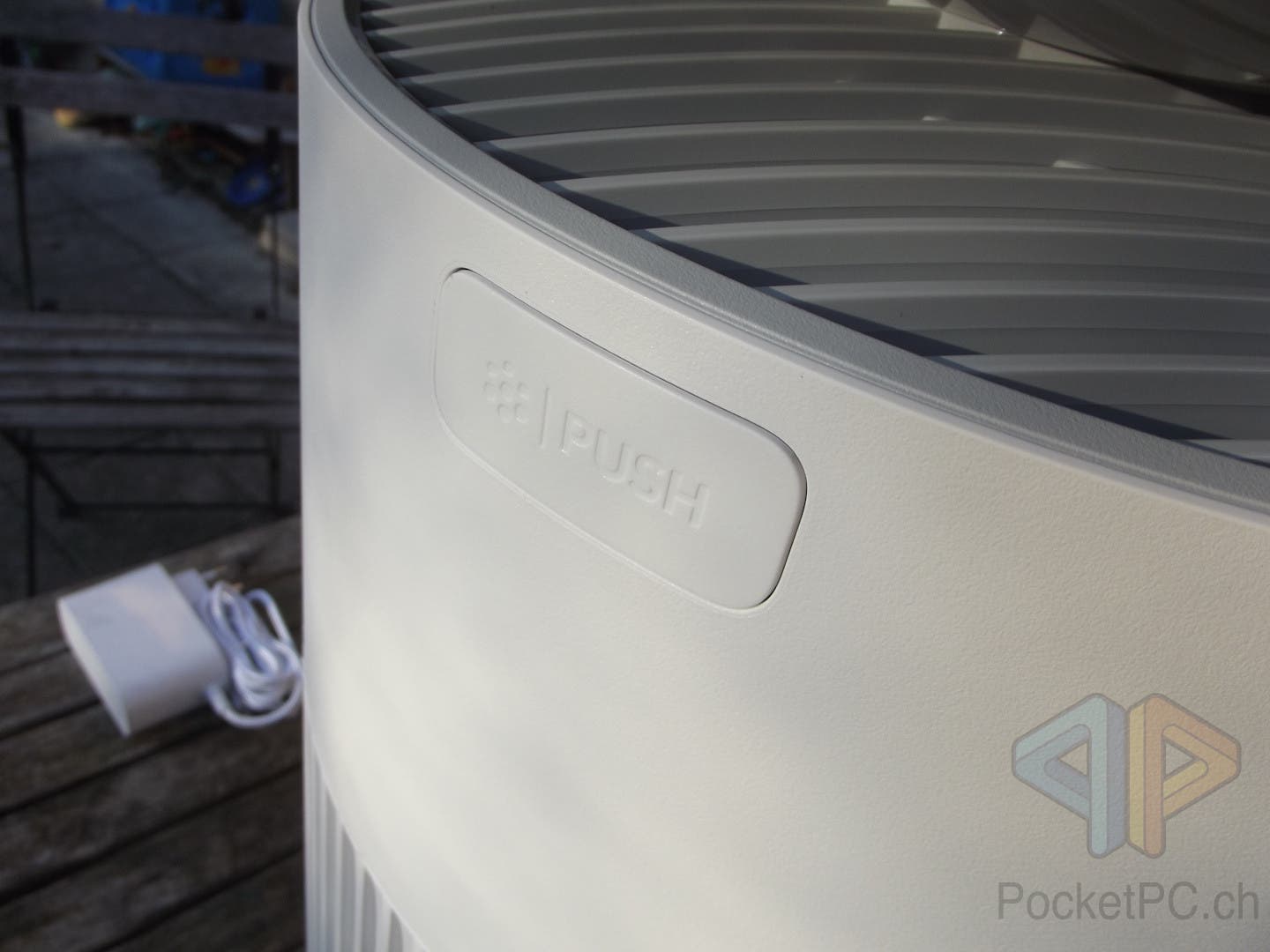 Auf der Rückseite ist der Stromanschluss sowie die Aroma-Pad-Box zu finden. Hier können Raumdüfte eingefüllt werden, die dann der SwitchBot Air Purifier Table verströmt. Ein PM2.5 Partikelsensor ist ebenfalls auf der Rückseite zu finden, während der Umgebungslichtsensor vorne verbaut ist. Die ganze Gehäuseseite ist rundherum von Gitterrillen aus Kunststoff umfasst, wobei nur vorne und hinten ein Lufteinlass zu finden sind. Diese sind mit einem zusätzlichen ultrafeinen Partikelfilter ausgestattet, der regelmässig per Staubsauger gereinigt werden soll.