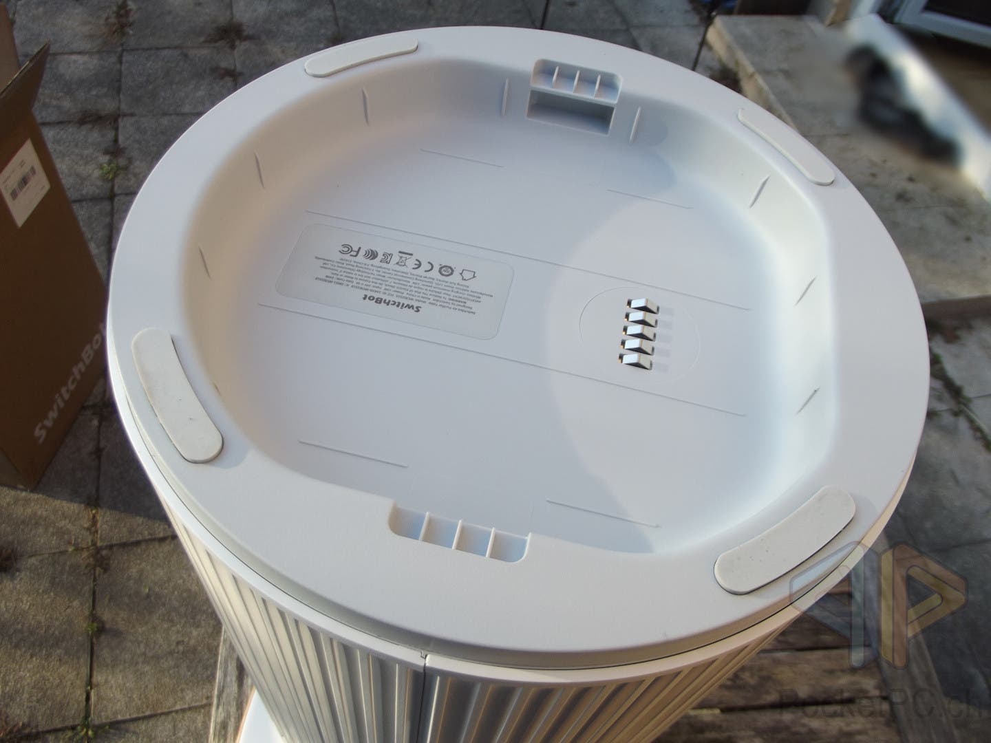 Auf der Unterseite des Luftreinigers von SwitchBot sind vier Gummifüsse zu finden sowie fünf Federkontakte in einer Vertiefung zusammen mit dem Typenschild. Diese dienen für den Anschluss von Zusatzgeräten. Welche das sein sollen, ist noch nicht bekannt. Es scheint jedoch eine Mobile Base in der Mache zu sein, die wohl eine steckdosenunabhängige Benutzung erlaubt. Der Hersteller gibt an, der SwitchBot Air Purifier Table sei für Räume bis 83 m2 geeignet und schafft eine Luftumwälzung (CADR) 400m³ pro Stunde.