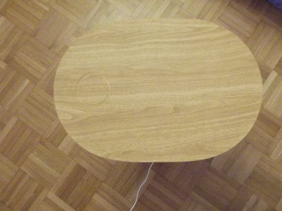 Auf dem Tisch, der leider nur wie Holz aussieht und keines ist, ist ein Qi Wireless Charging Pad eingebaut, mit dem ein entsprechend kompatibles Gerät aufgeladen werden kann. Der Tisch unterstützt hier bis zu 15 W kabelloses Aufladen, wobei Apple-Geräte sich mit 7.5 Watt zufrieden geben müssen. Das klappt soweit ganz gut und das Gerät wird leicht magnetisch an Ort und Stelle gehalten während des Aufladens. Kein Apple MagSafe, aber immerhin.
