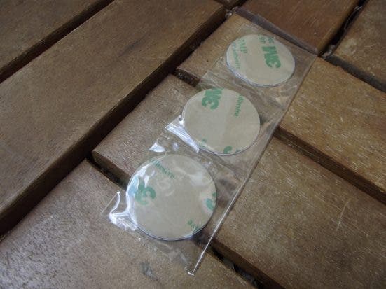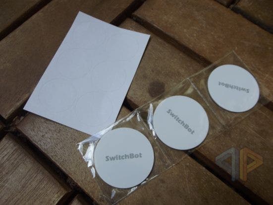 Im Prinzip sind die SwitchBot Tags handelsübliche NFC-Tags vom Typ NXP NTAG216 mit einer Kapazität von 924 Bytes (848 im NDEF-Format). Die weissen Kunststoffscheiben, in denen die NFC-Tags enthalten sind, haben einen Durchmesser von 30 mm und sind 1 mm dick. Ihr Gewicht ist kaum messbar. Auf der Vorderseite ist der Herstellername SwitchBot aufgedruckt. Auf der Rückseite ist eine 3M-Doppelklebefolie angebracht, mit der die NFC-Scheibe problemlos an verschiedenen Oberflächen befestigt werden kann.