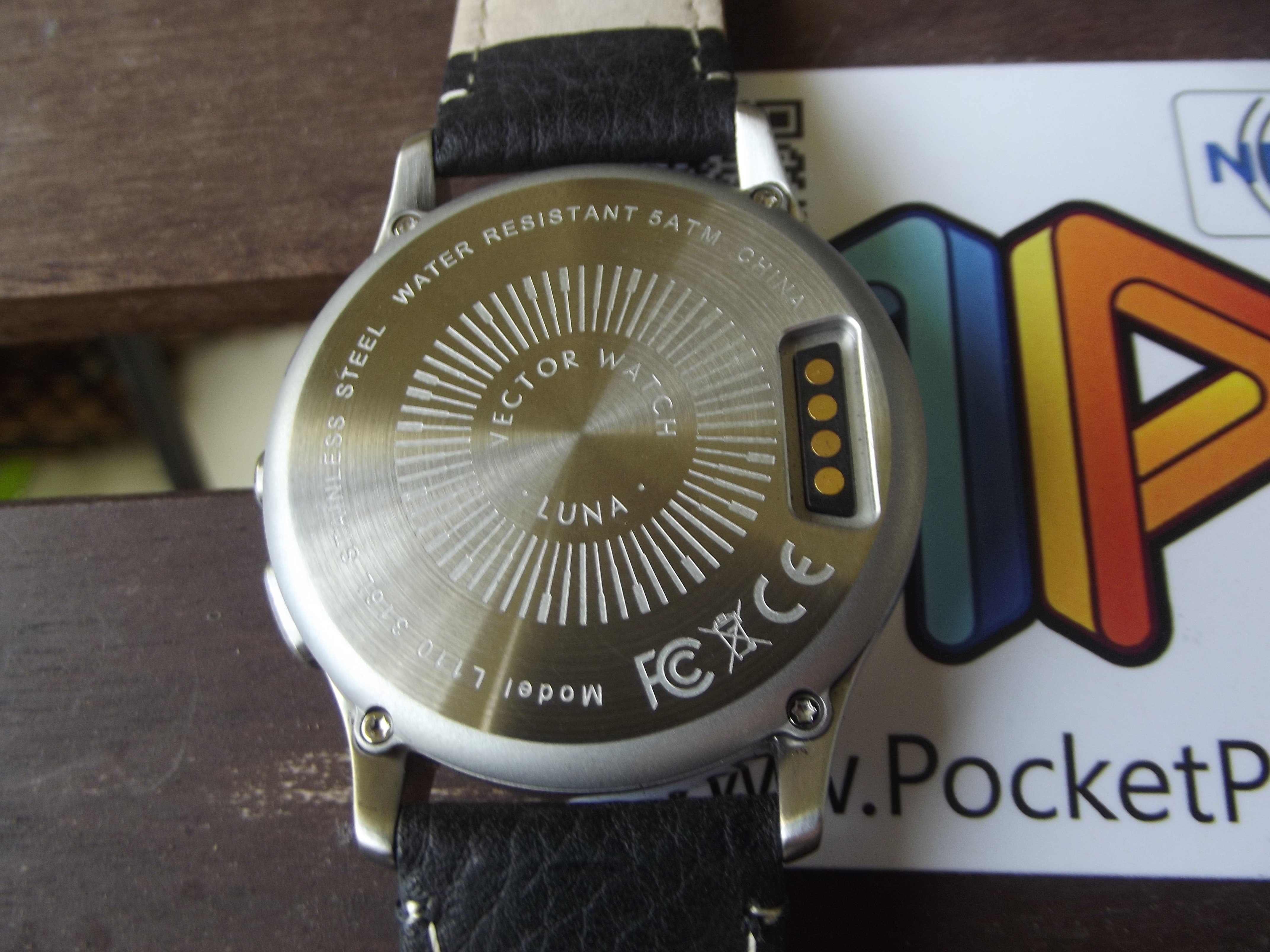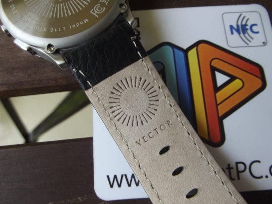 Verfügbar ist die Vector Watch Luna in vier Gehäusefarben – neben gebürstetem Edelstahl, Schwarz, Rot- und Gelbgold – und Armbändern aus Silikon oder in schwarzem oder braunem Leder, Metallgliederarmbändern in Edelstahl oder Schwarz, rotgolden nur beim gleichfarbenen Gehäuse. Das gelbgoldene Gehäuse gibt es zudem nur mit Krokodilleder-Armband. Die Lederarmbänder sind in zwei Grössen, für Handgelenke mit 185 mm bzw. 195 mm, zu haben. Die Metallgliederarmbänder sind bis zu 210 mm Handegelenksumfang empfohlen. Neben dem Schriftzug Genuine Leather sind die Vector-Text- und Bildmarke in die Innenseite des Naturleder-Armbands gestanzt, ebenso steht auf dem Verschluss des selbigen Vector.