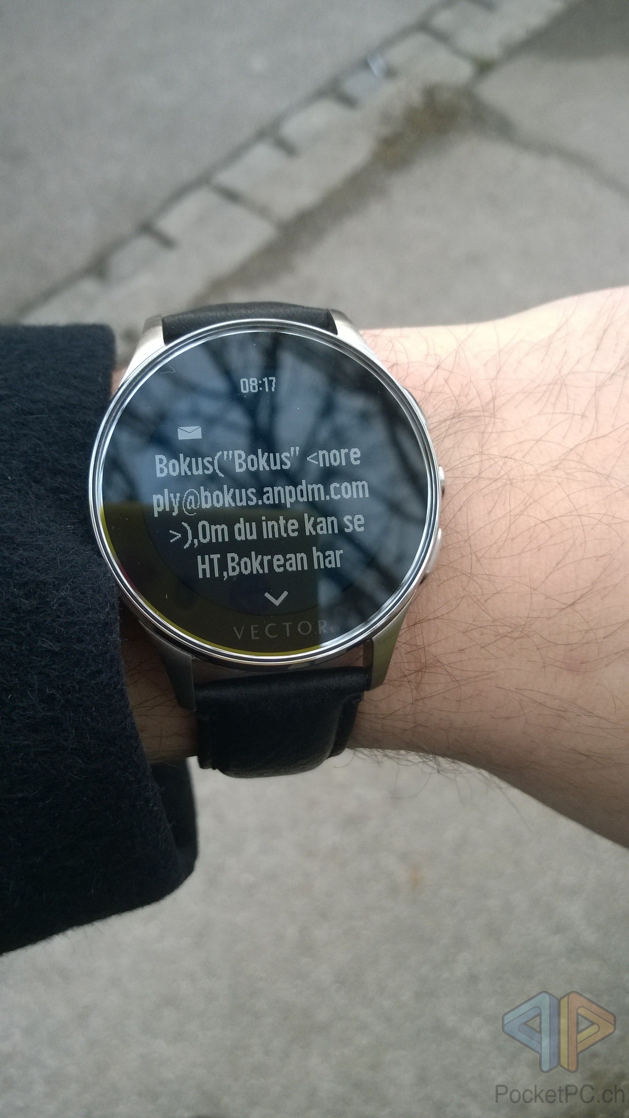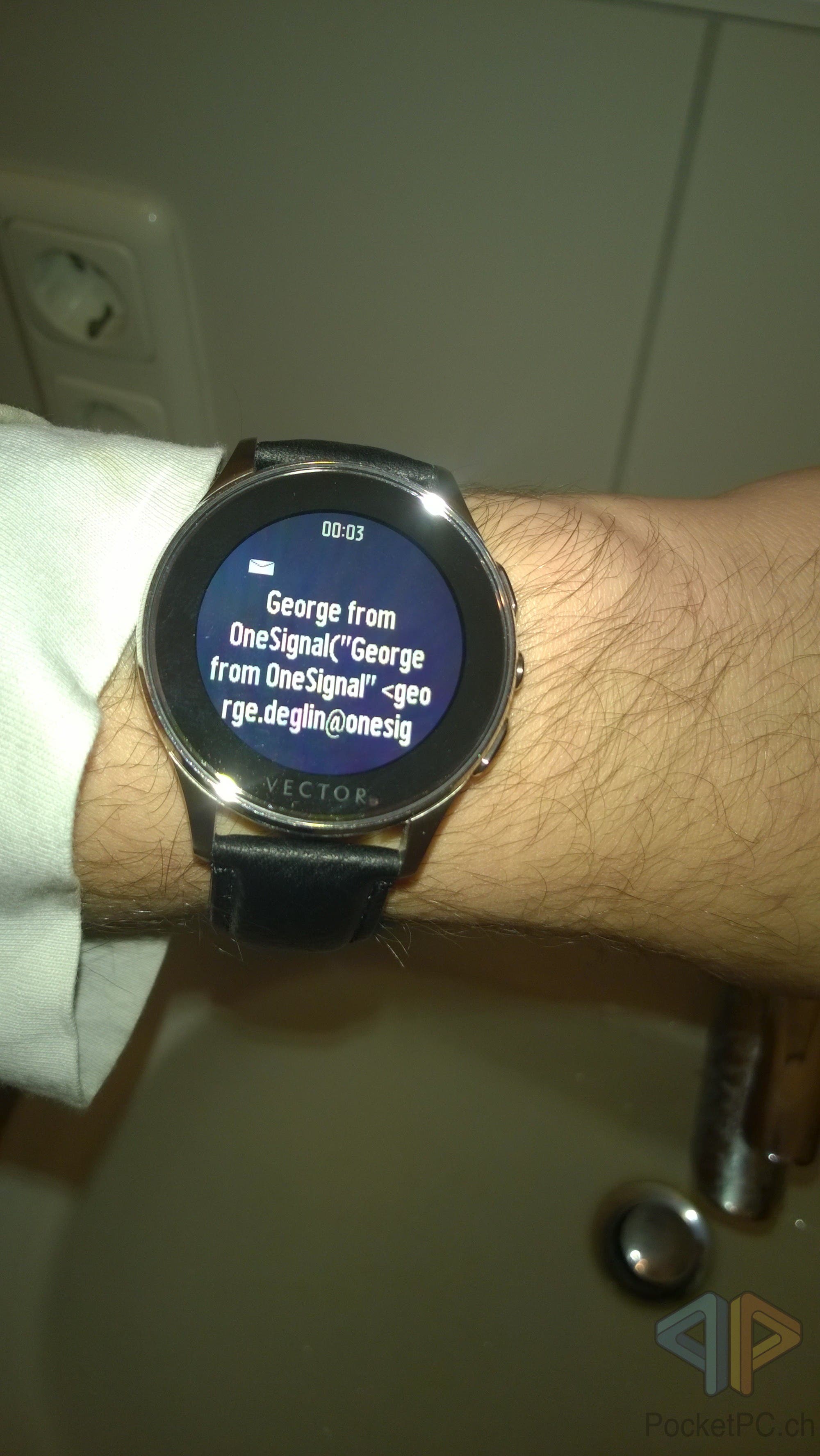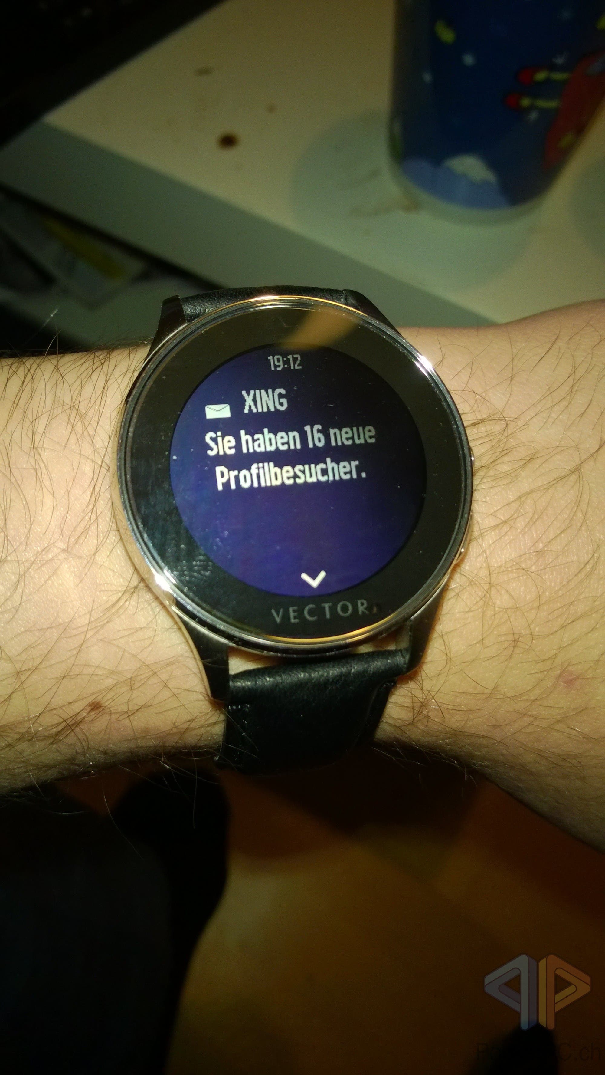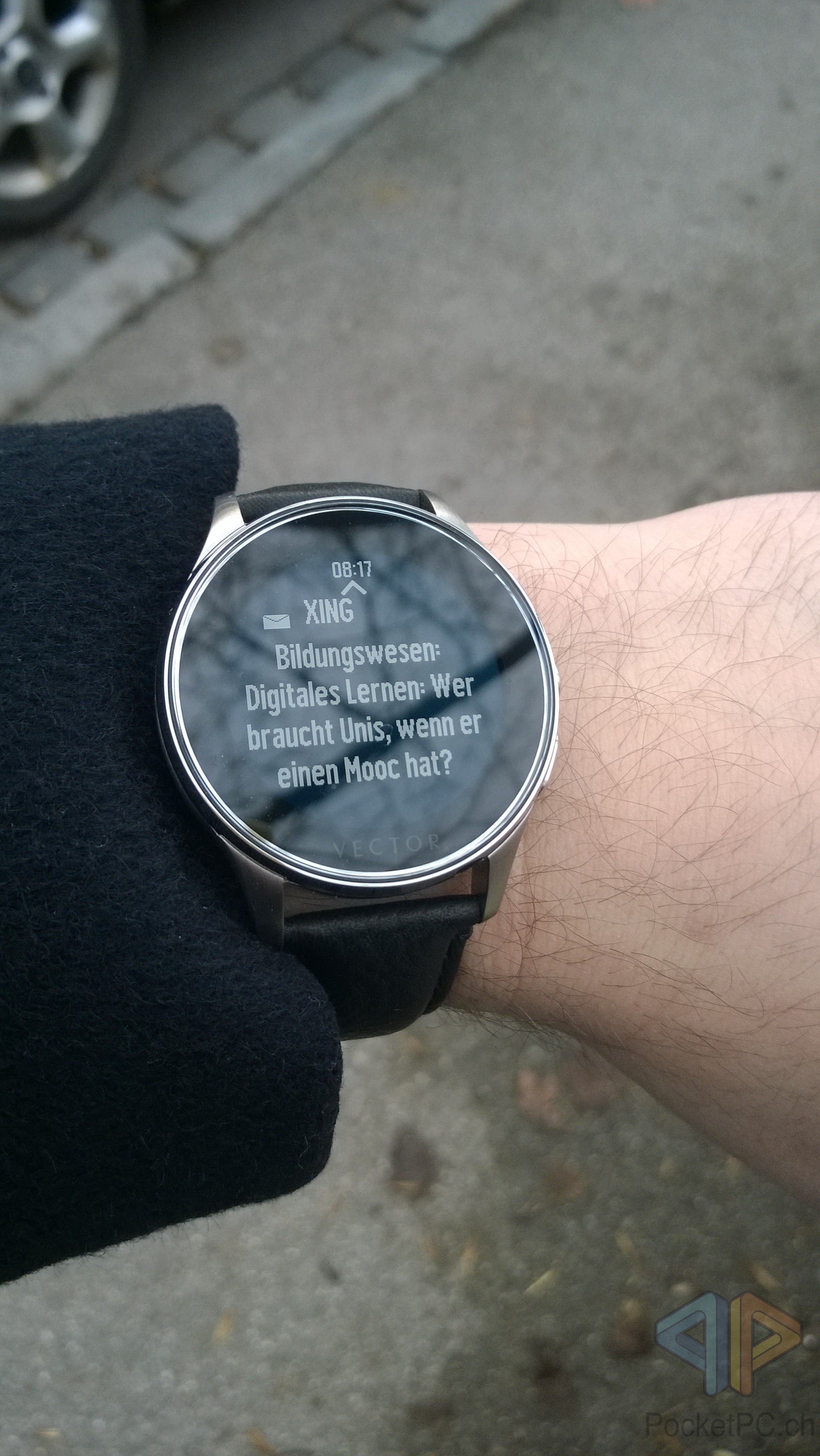 Darüber hinaus kann die Uhr immer und unabhängig vom aktuellen angezeigten Ziffernblatt – denn es können bis zu zwölf davon auf der Vector Watch gespeichert und benutzt werden – eingehende Anrufe und Textnachrichten, E-Mails, Kalender-Erinnerungen, Alarme, Timer und der Verlust der Bluetooth-Verbindung immer anzeigen. Die Anzeigen der Nachrichten, Benachrichtigungen und Informationen ist auf die Bildschirmverhältnisse hin gut optimiert und nie überladen, sie werden durch deutlich spürbare Vibrationssignale unterstützt. Manche Steams scrollen ihre Daten durch einen Ticker, andere werden abgeschnitten, doch auch wenn die breitesten Zeilen des Displays lediglich 18 Zeichen fassen: Das Wesentliche wird immer gut lesbar angezeigt und seit dem letzten Update Ende März auch so, dass unnötige Anführungszeichen in E-Mailheadern nicht und Sonderzeichen in Namen sauber dargestellt werden.
