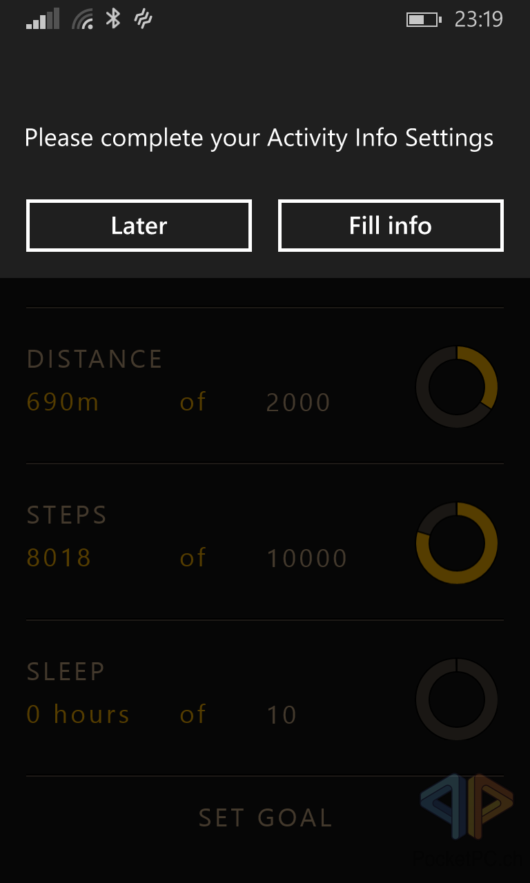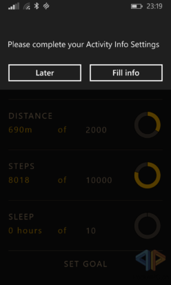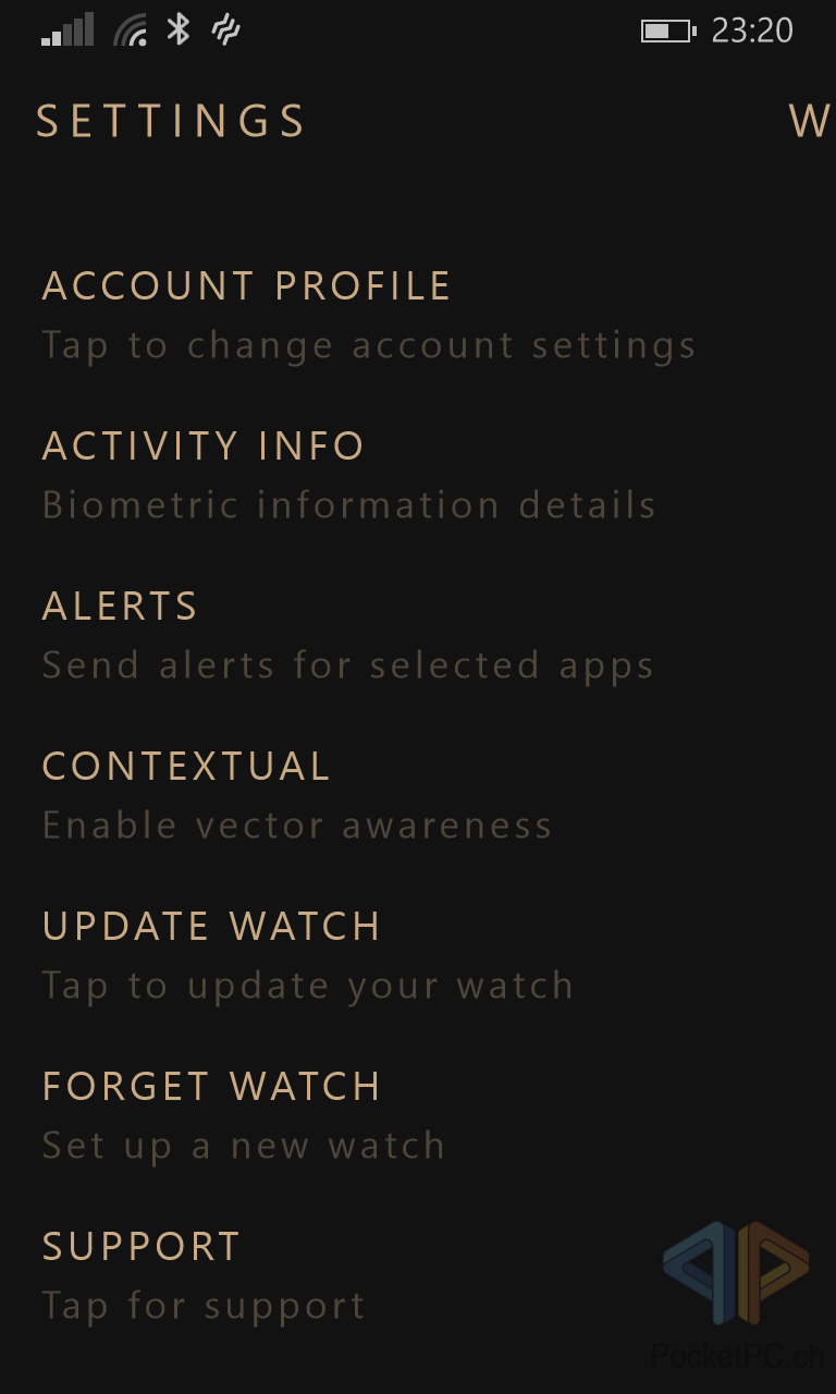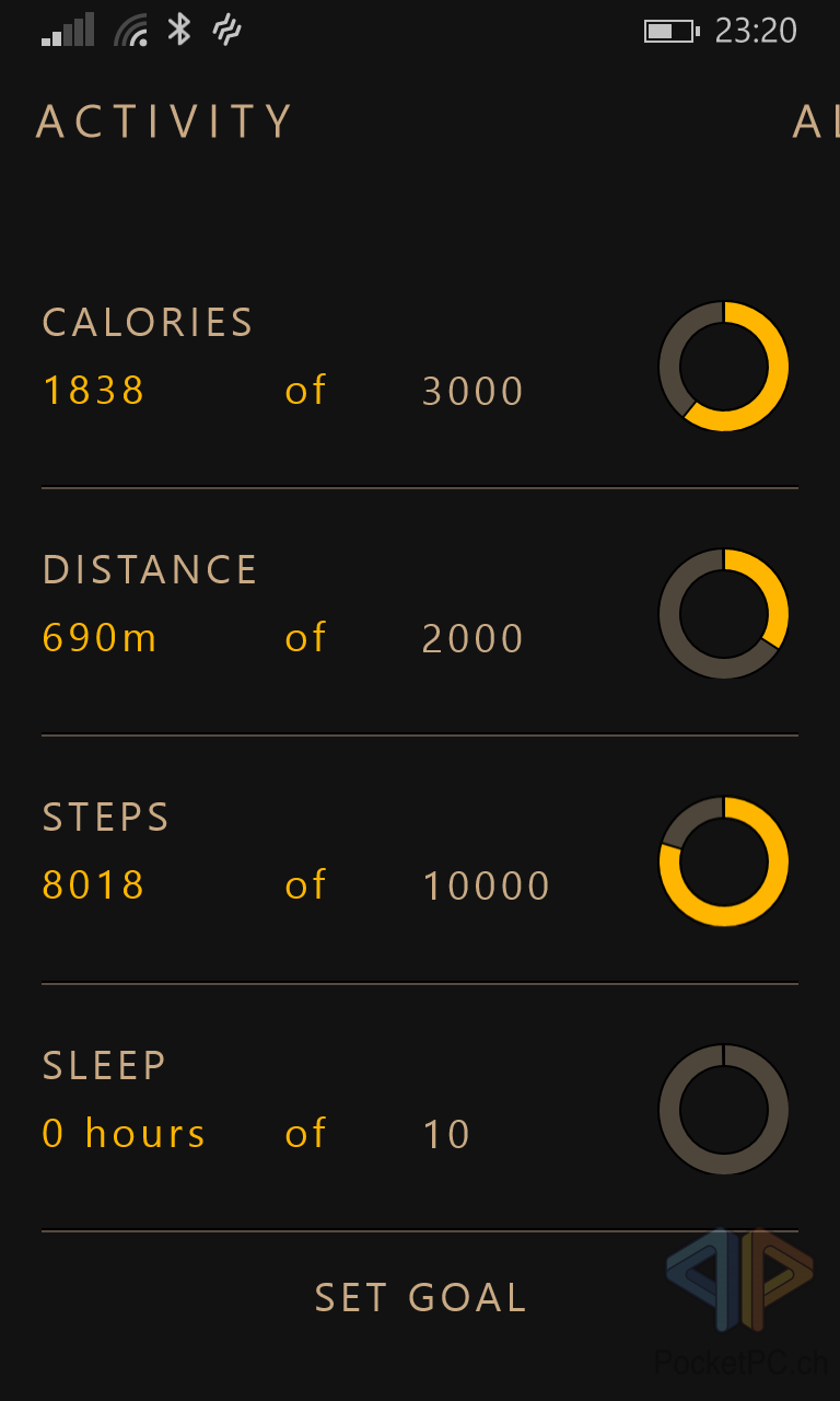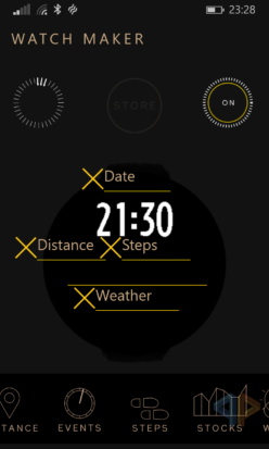 Die Apps gleichen sich auf allen drei Betriebssystemen sehr, Die iOS App unterscheidet sich von der Android App nur geringfügig durch eine etwas andere Anordnung der Bedienelemente. Ebenso ist die Windows App nahezu gleich aufgebaut, wie nachfolgende Bilderreihen zeigen. Die Windows Phone 8.1 App wurde anfänglich auch für Windows 10 Mobile herausgebracht, leider ohne jegliche Anpassungen, und leider seit einer Weile kein Update erhalten hat. Das führte auch dazu, dass die aktuellste Firmware nicht auf der Uhr installiert werden kann, welche nicht nur Fehler behebt, sondern auch mehrere Sprachen neben der englischen unterstützt. Darunter auch Deutsch, welche so auch Umlaute richtig darstellen kann. Die Windows 10 Mobile Version hat dann viel Stabilität unter dem neuen OS gebracht, allerdings läuft die App nicht rund auf Preview Builds.