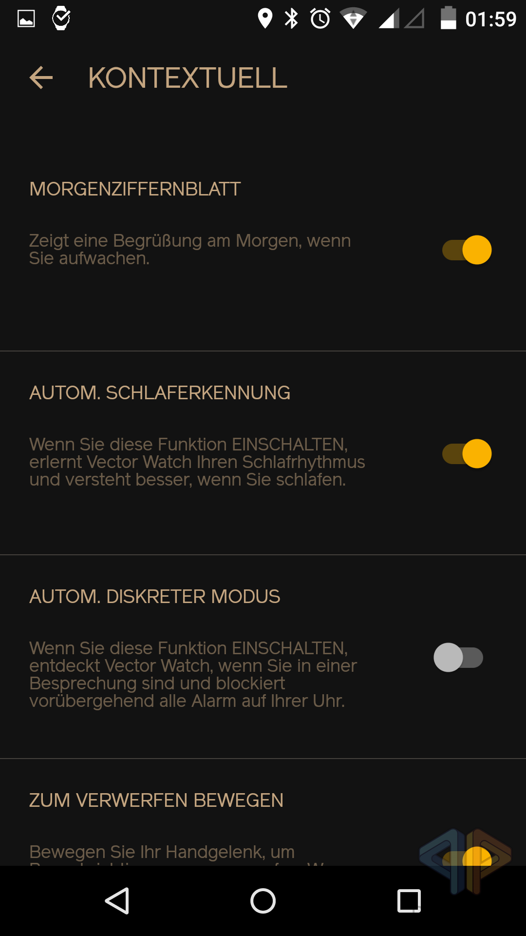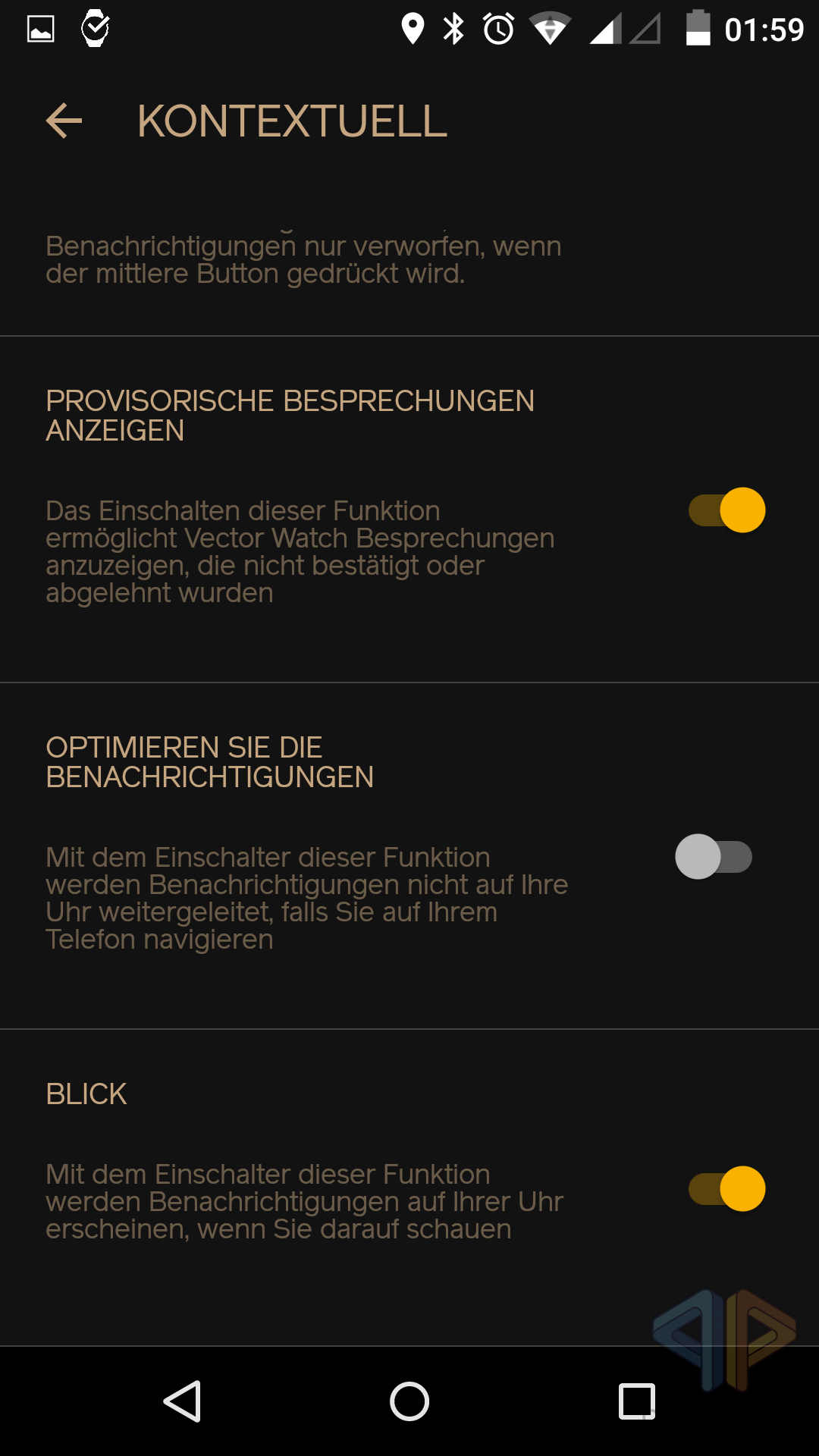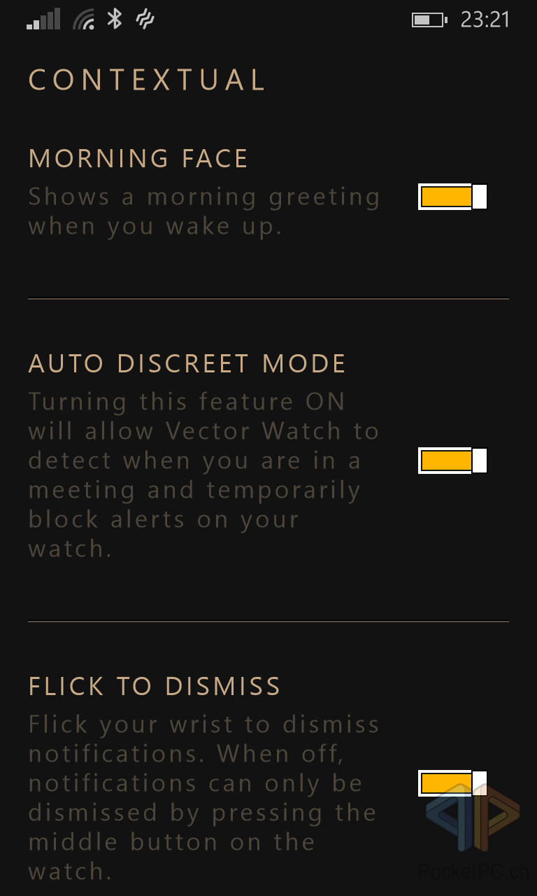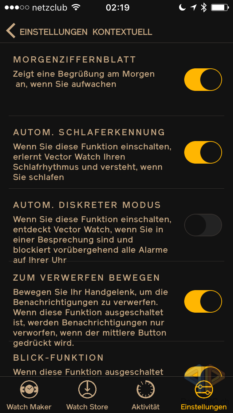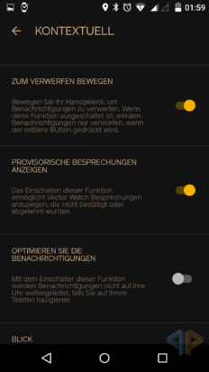 Weiter gibt es die Möglichkeit, die Privatsphäre zu wahren, indem nur Icons angezeigt werden, wenn die Uhr nicht bedient wird. Auch gibt es einen Glance-Modus, so dass die Vector Watch erkennt, dass sie angeblickt wird und dann die Benachrichtigung direkt anzeigt, ohne dass die mittlere Taste gedrückt werden muss. Ebenso kann durch Armschütteln die Benachrichtigung quasi abgeschüttelt werden. Das alles kann auch in der App ein- bzw. ausgeschaltet werden.