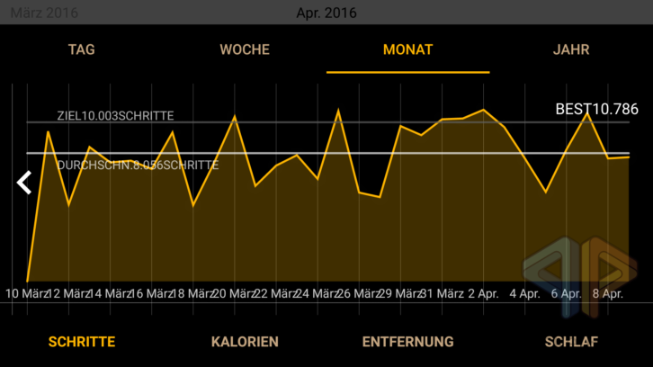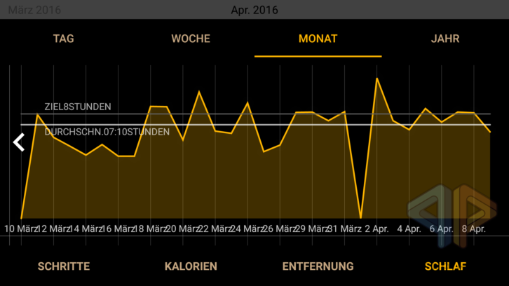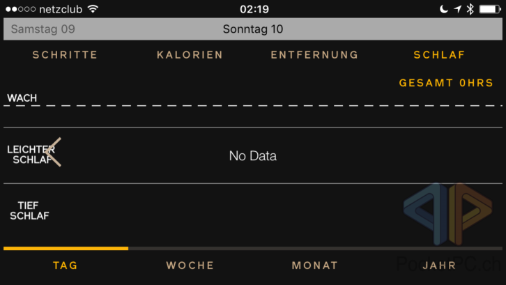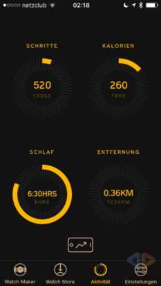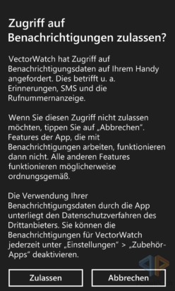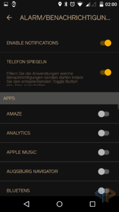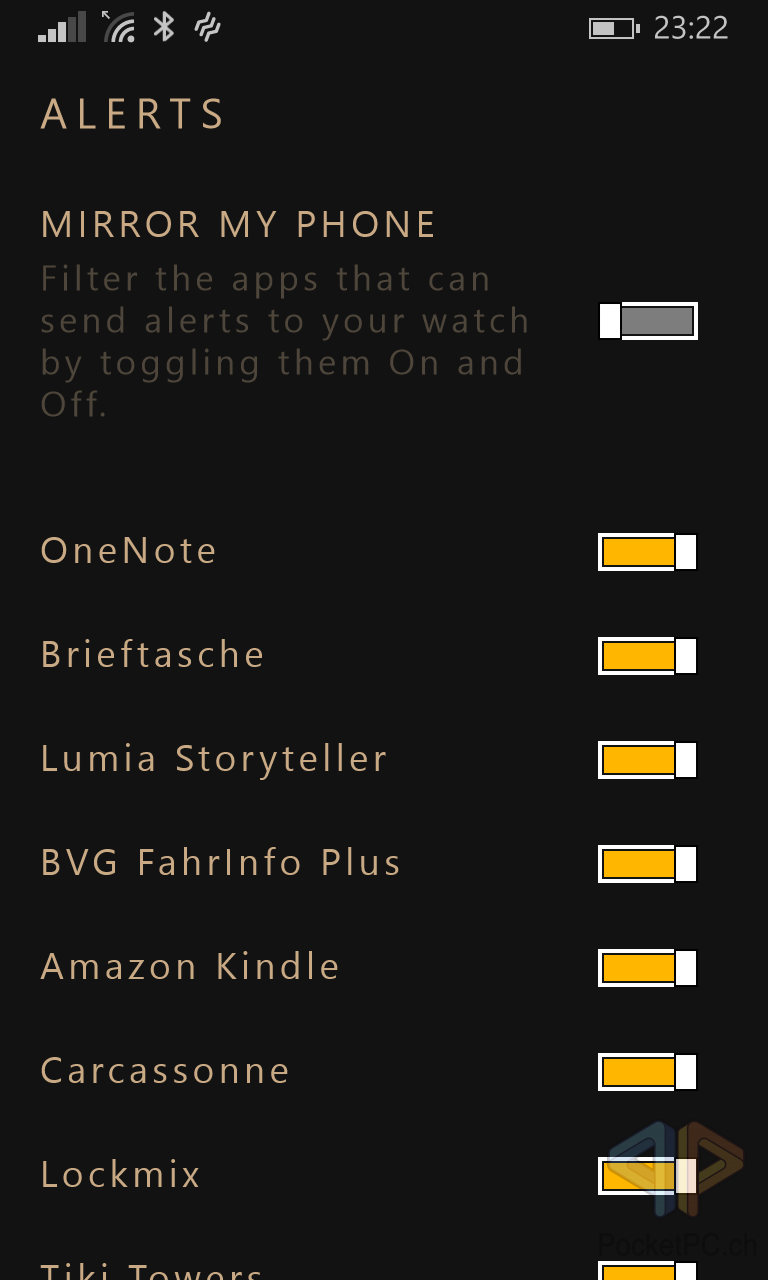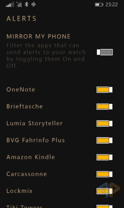 In der App kann auch ausgewählt werden, welche Benachrichtigungen von welchen Apps und Systemfunktionen an die Uhr übermittelt werden sollen. Insgesamt kann die App durch einfache und intuitive Bedienbarkeit mit ihren Pivot-Ansichten überzeugen und bietet genügend Einstellungs- und Individualisierungsmöglichkeiten. Einzig nicht sofort erschliesst sich die Chronologie der Messwerte wie Schritte, Kalorien, Schlafdauer und zurückgelegte Entfernung. Diese wurde bis vorgestern nicht etwa durch Antippen, sondern durch Drehen des Handys ins Querformat aufgerufen, was man aber erst aus dem englischsprachigen Benutzerhandbuch erfährt, das nicht wirklich einfach verlinkt ist. Nunmehr gibt es endlich einen Button dafür und viele weitere kleine Fehler in der App wurden behoben.